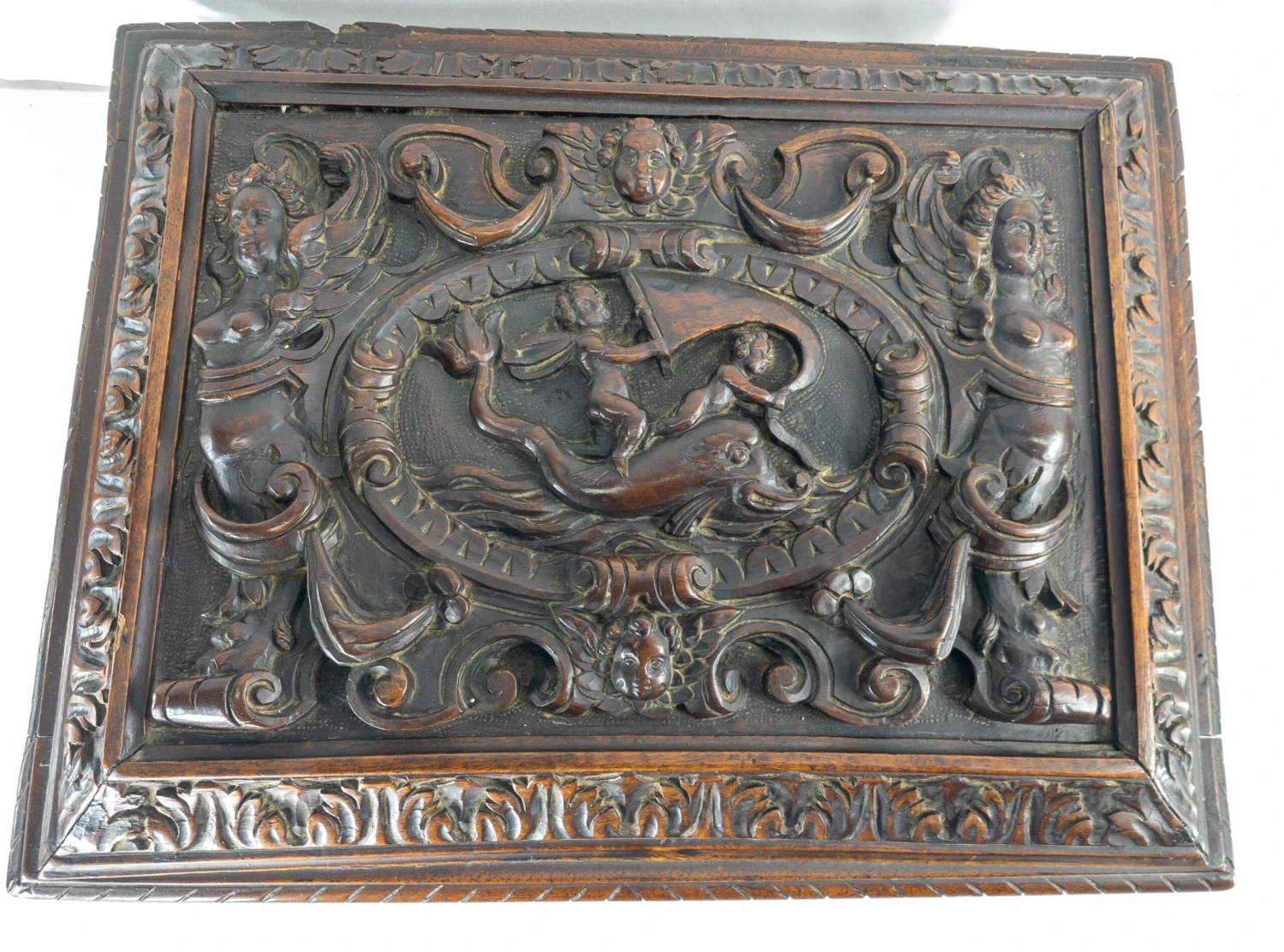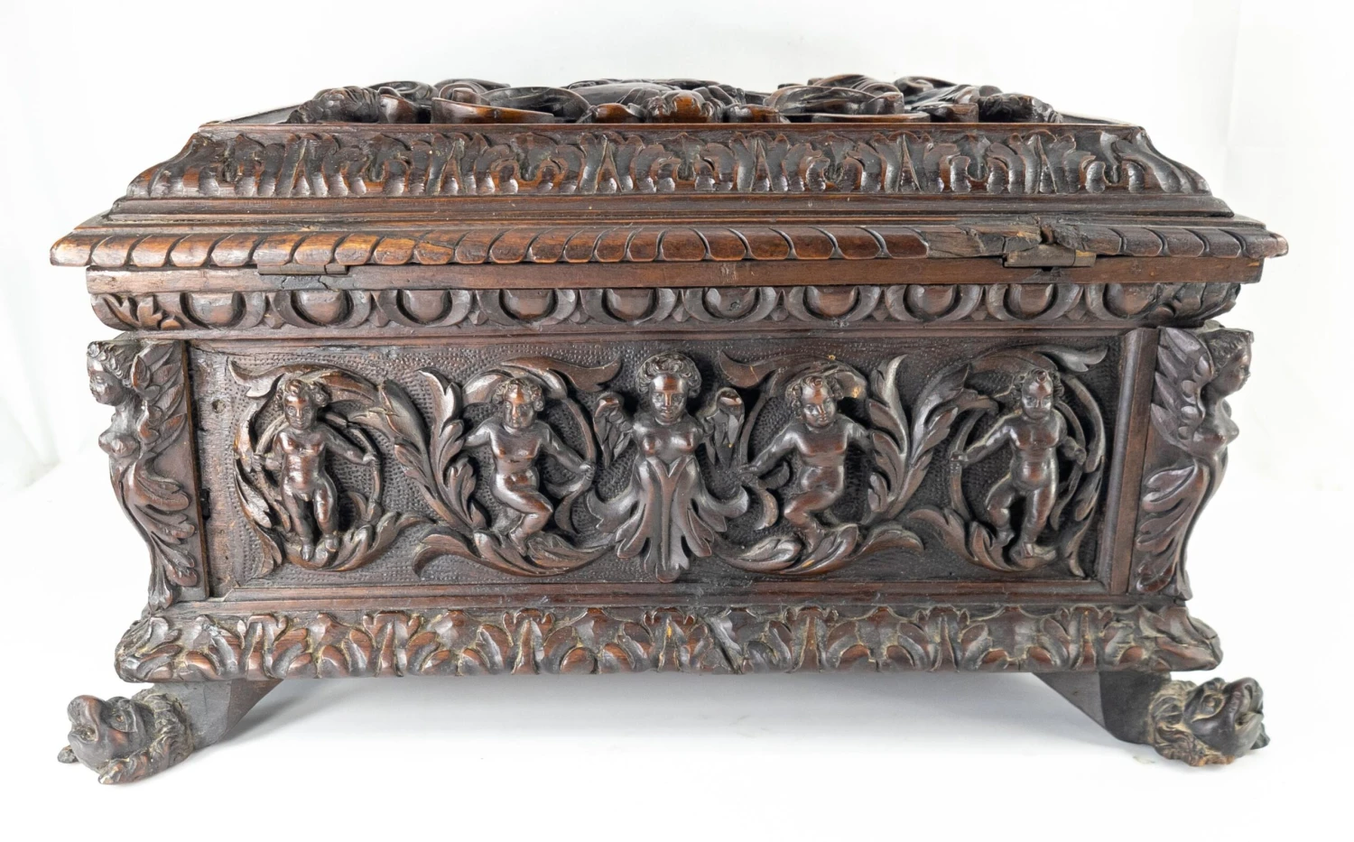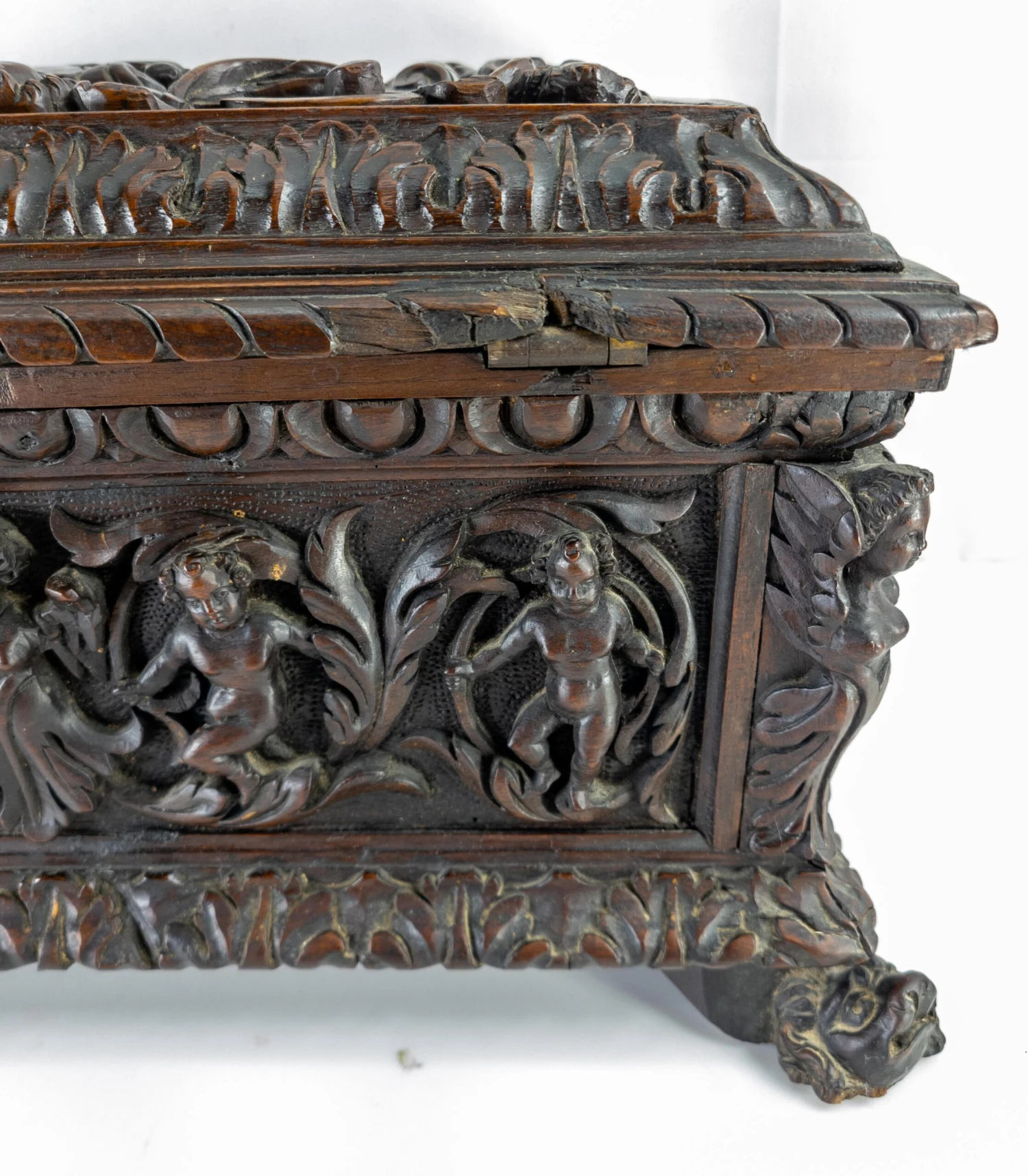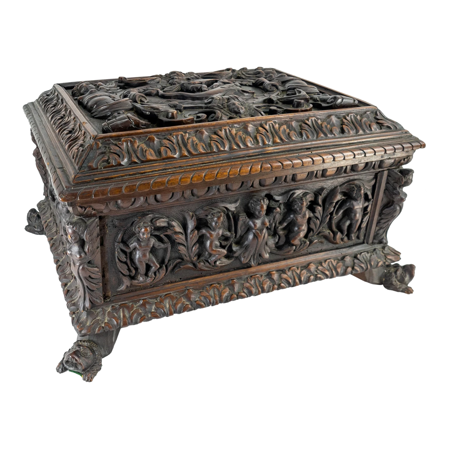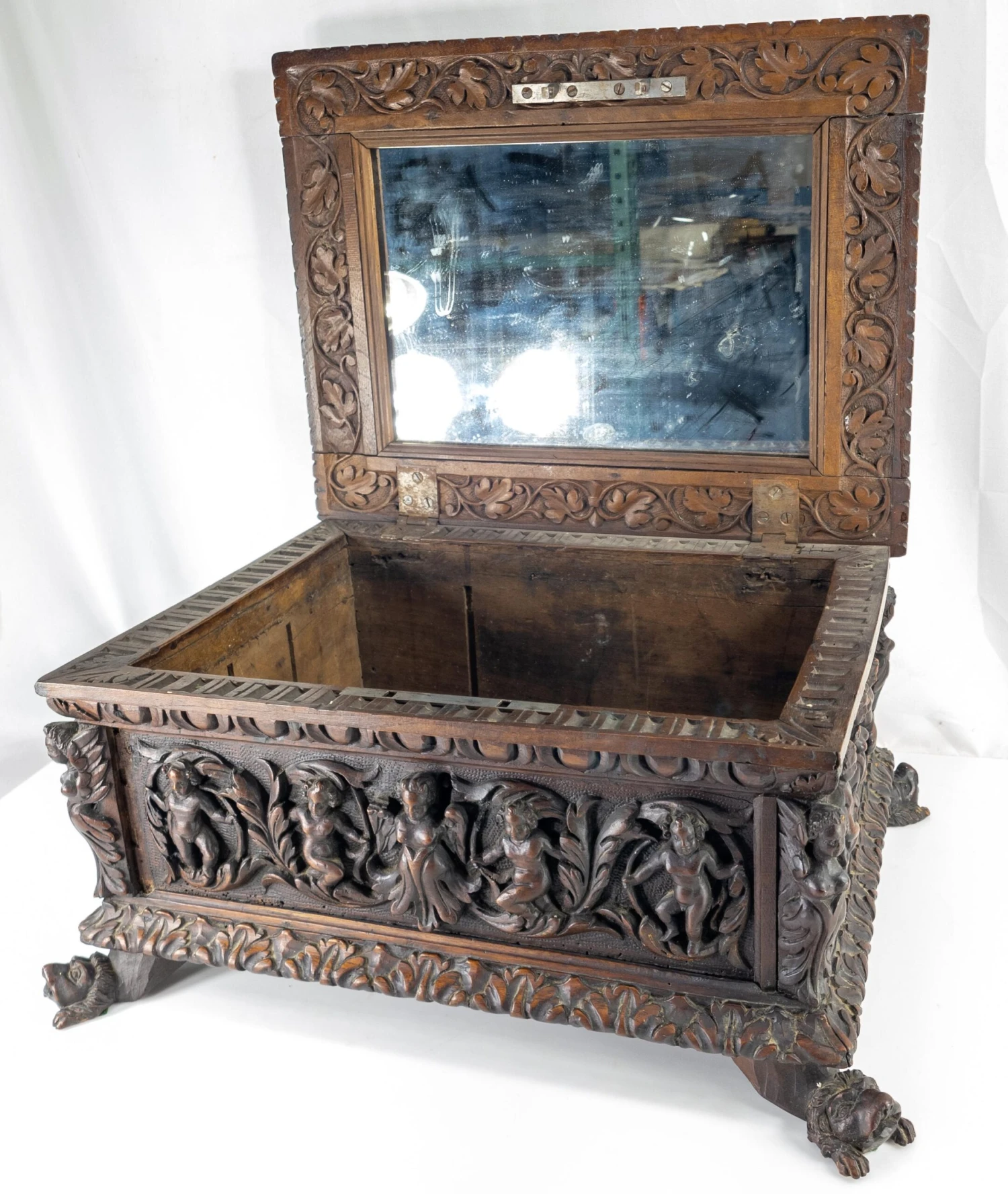We are selling this great Baroque carved Italian chest. This miniature Cassone casket has deep carving on all sides with figures and opens to reveal a mirror. The exterior carving appears to be 17th or 18th century but the body may have been repaired in the 19th century.