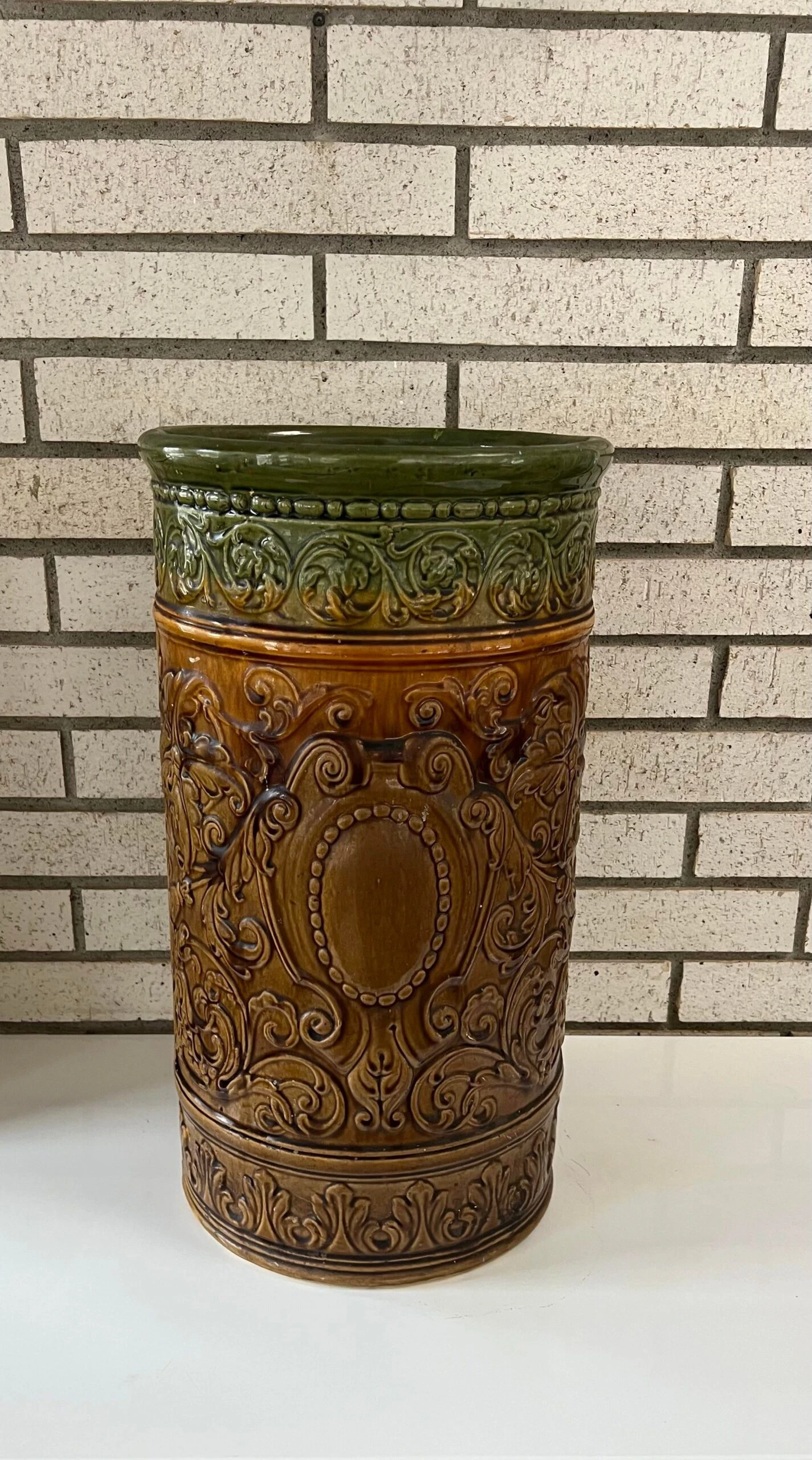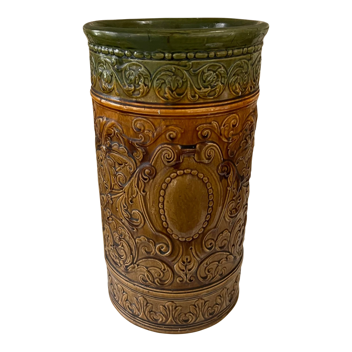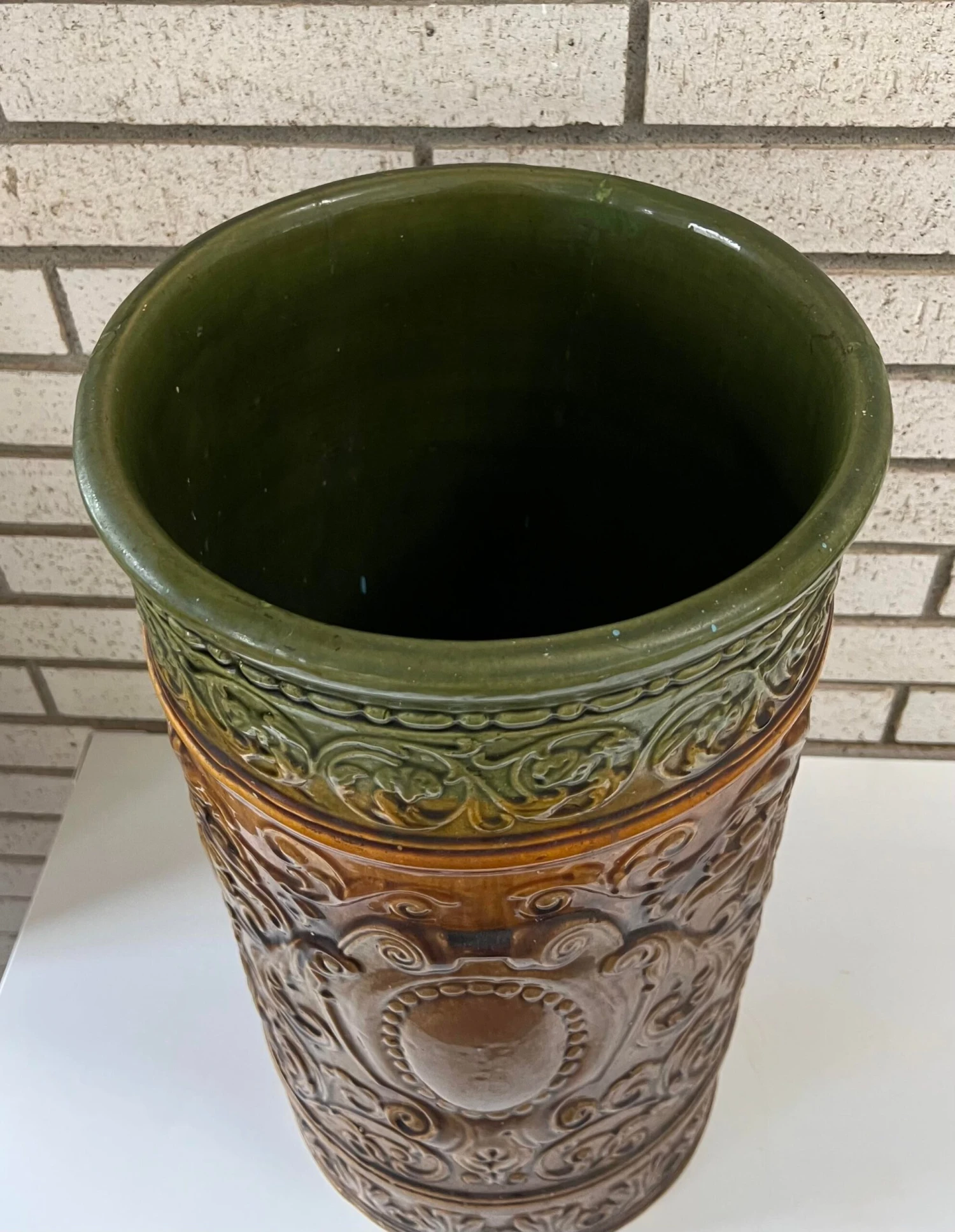 The glaze a dark green at the top blending into a brown …