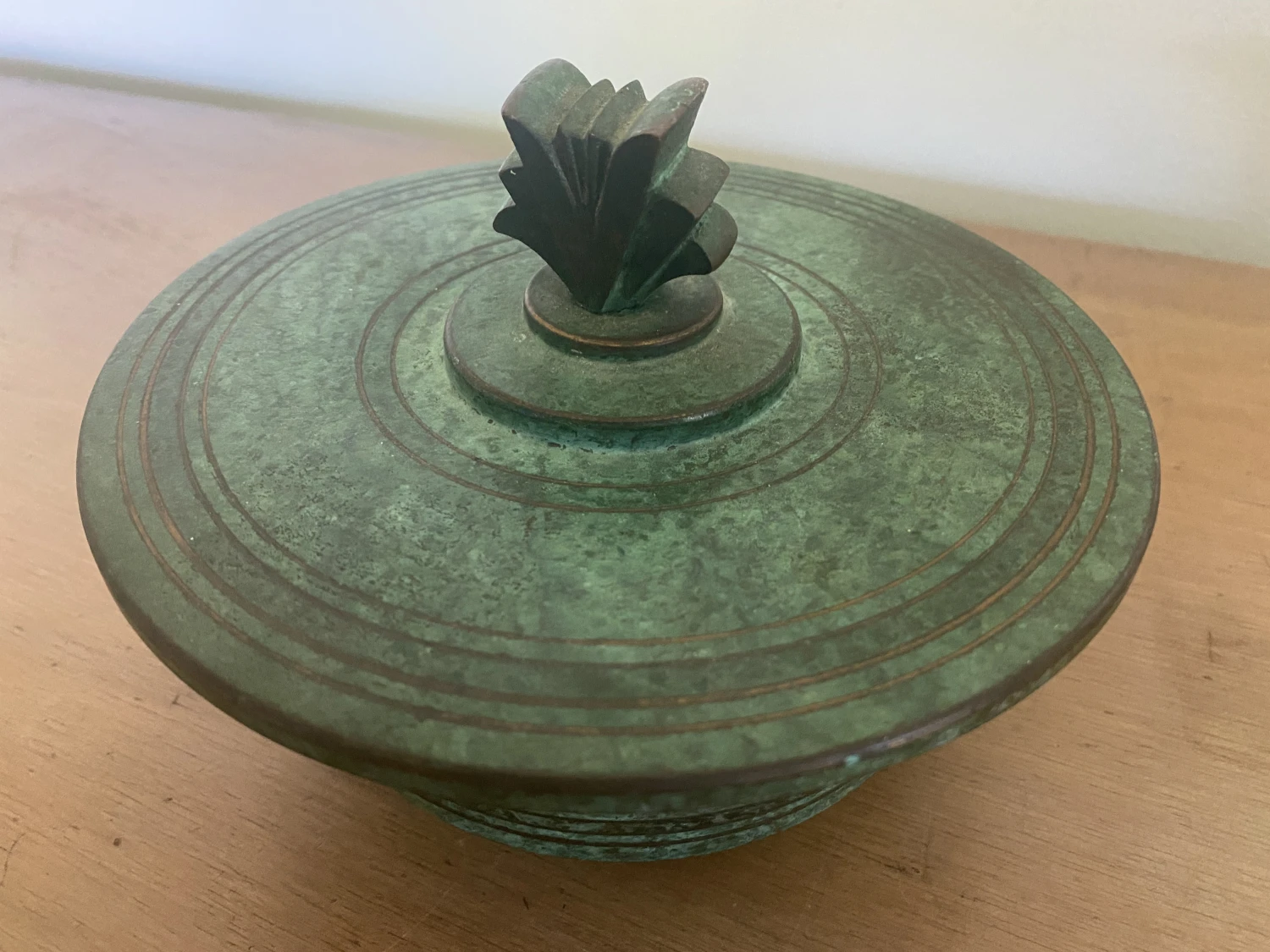 slight rubbing wear to the lid (see pic). Overall nice patina and even wear.