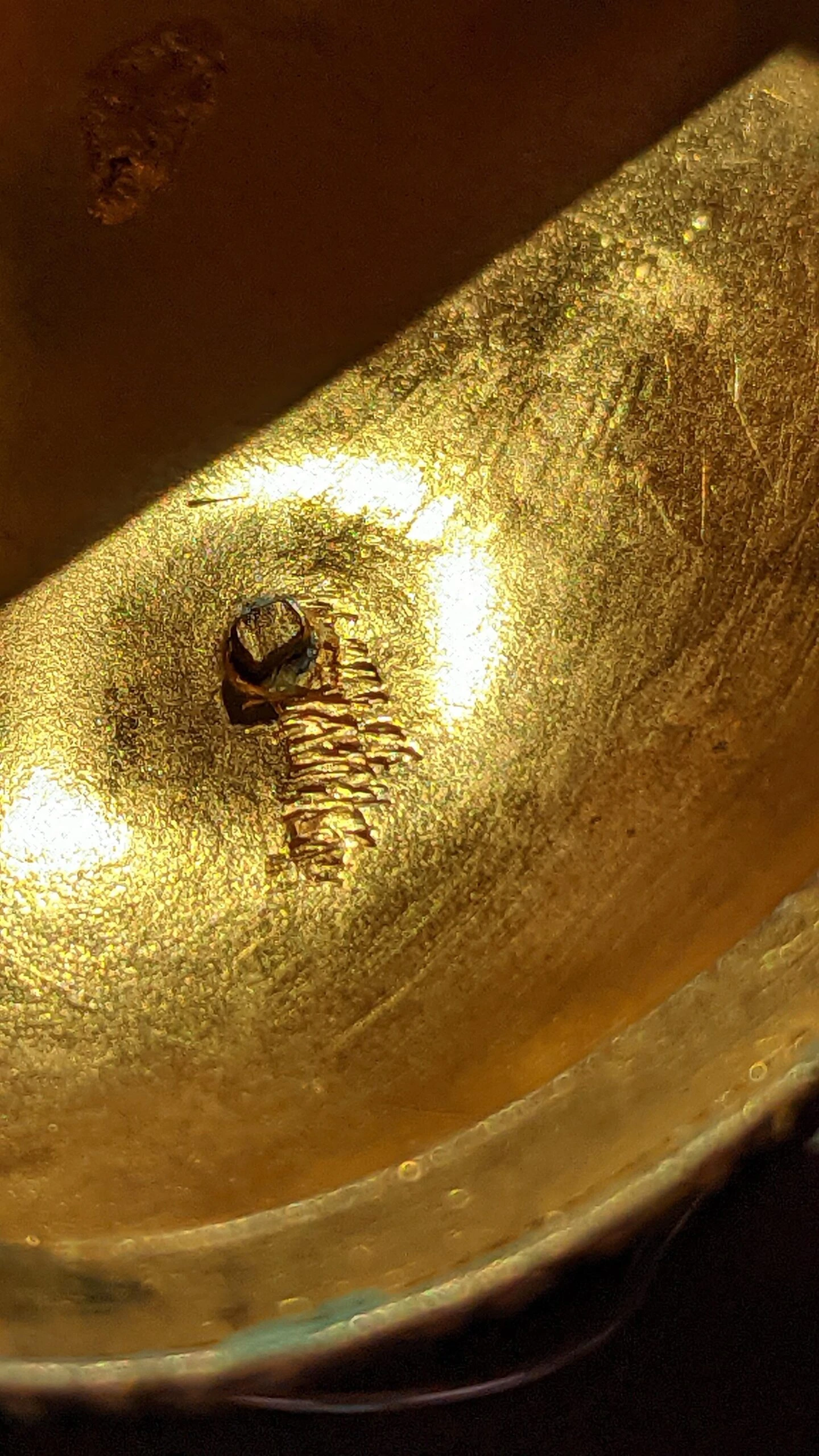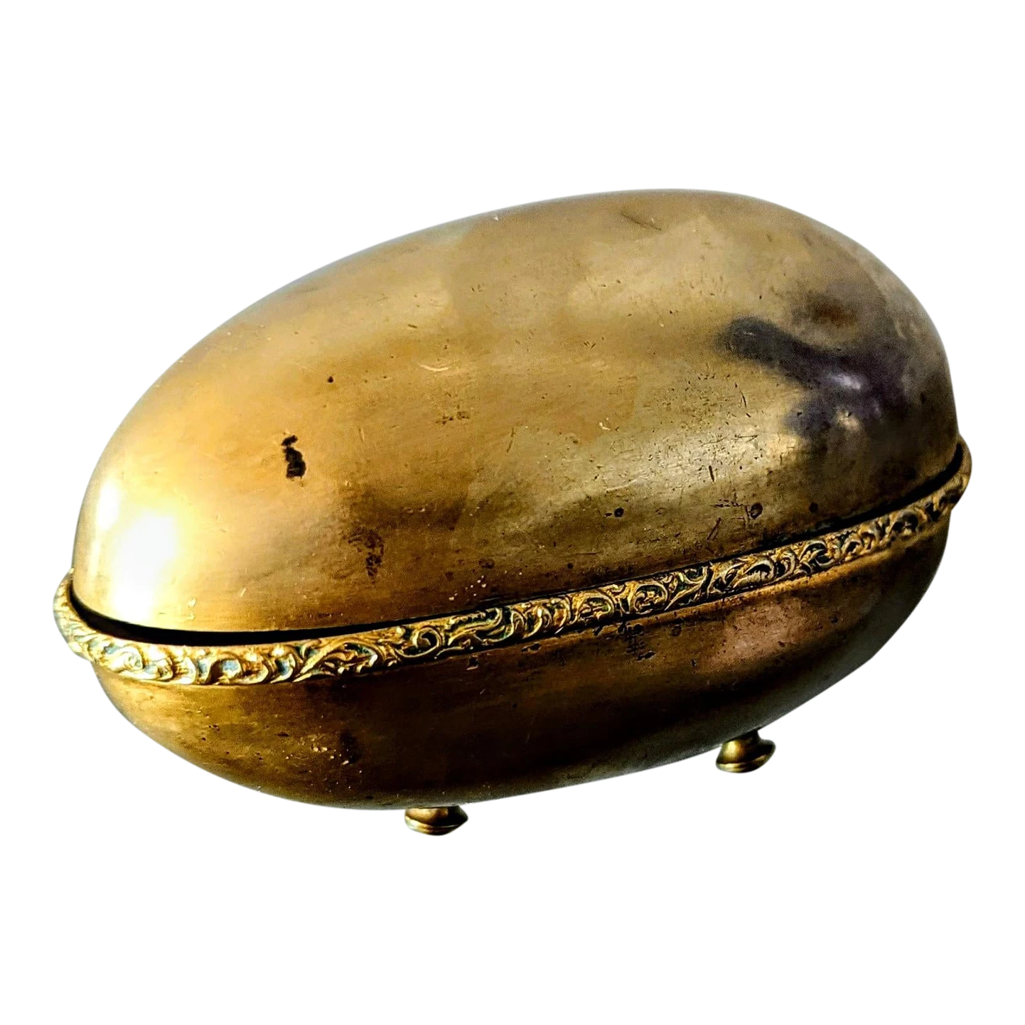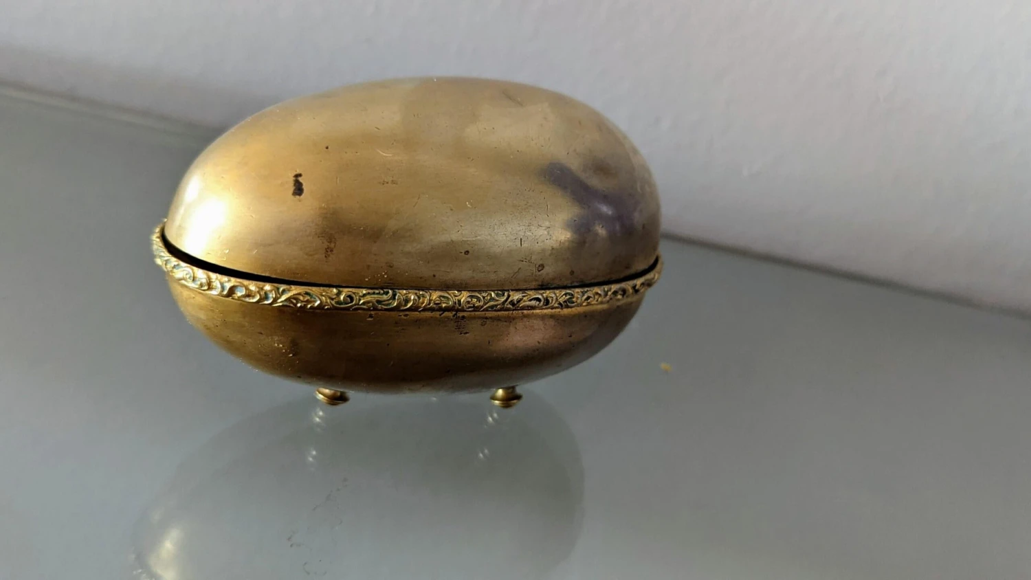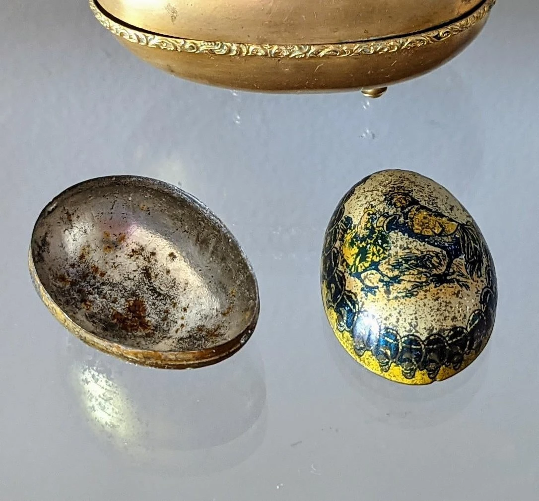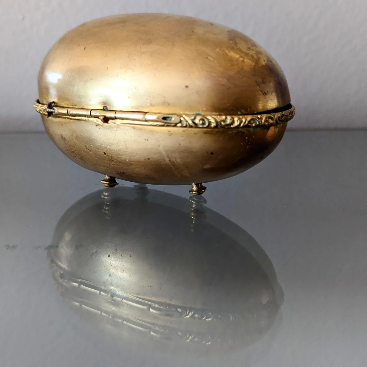 Very old Trinket Box but possibly as new as the 1940’s. The origin is unknown. It has none of the markers that are typical of objects of this quality. A mark on the inside could be one of its maker. Additionally, it has lines two handwritten lines that could be a serial number of 11 on interior top and bottom. The ormolu trim and legs define this elegant egg . It came with this hand painted smaller egg of very light metal. The picture is of a rooster top hat in hand facing a chicken.
