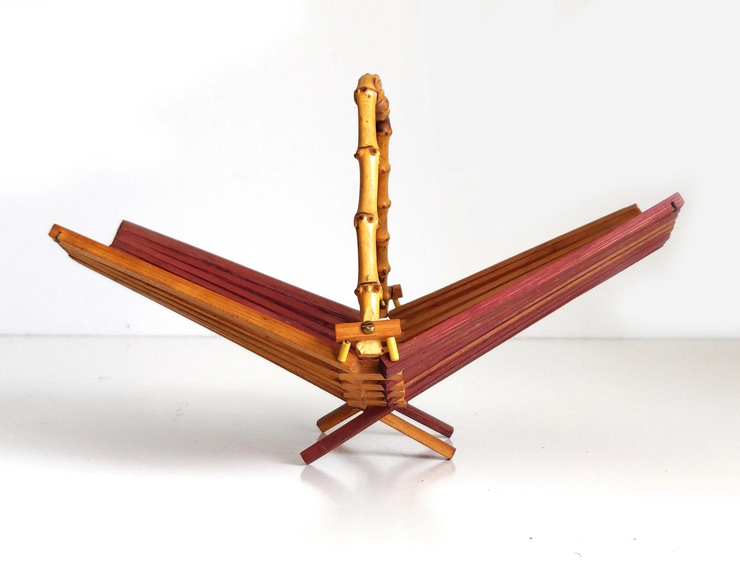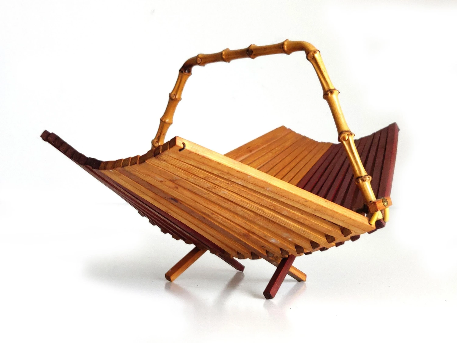 A striking folding basket with a bent bamboo handle. This design of the piece allows it to fold up to …
