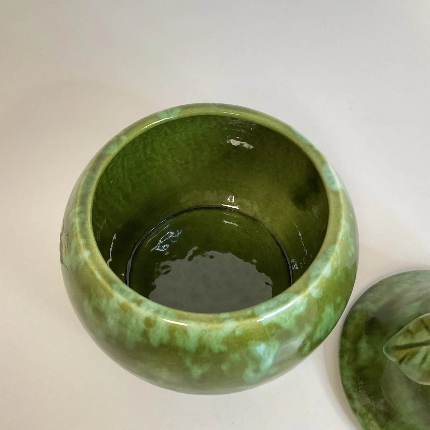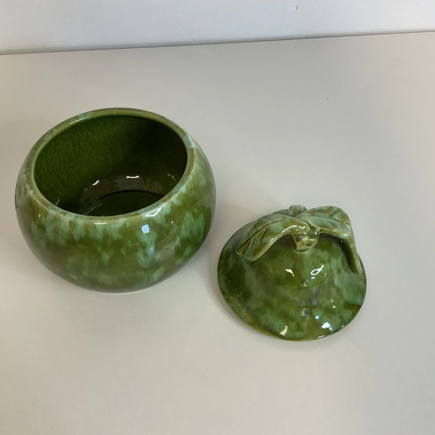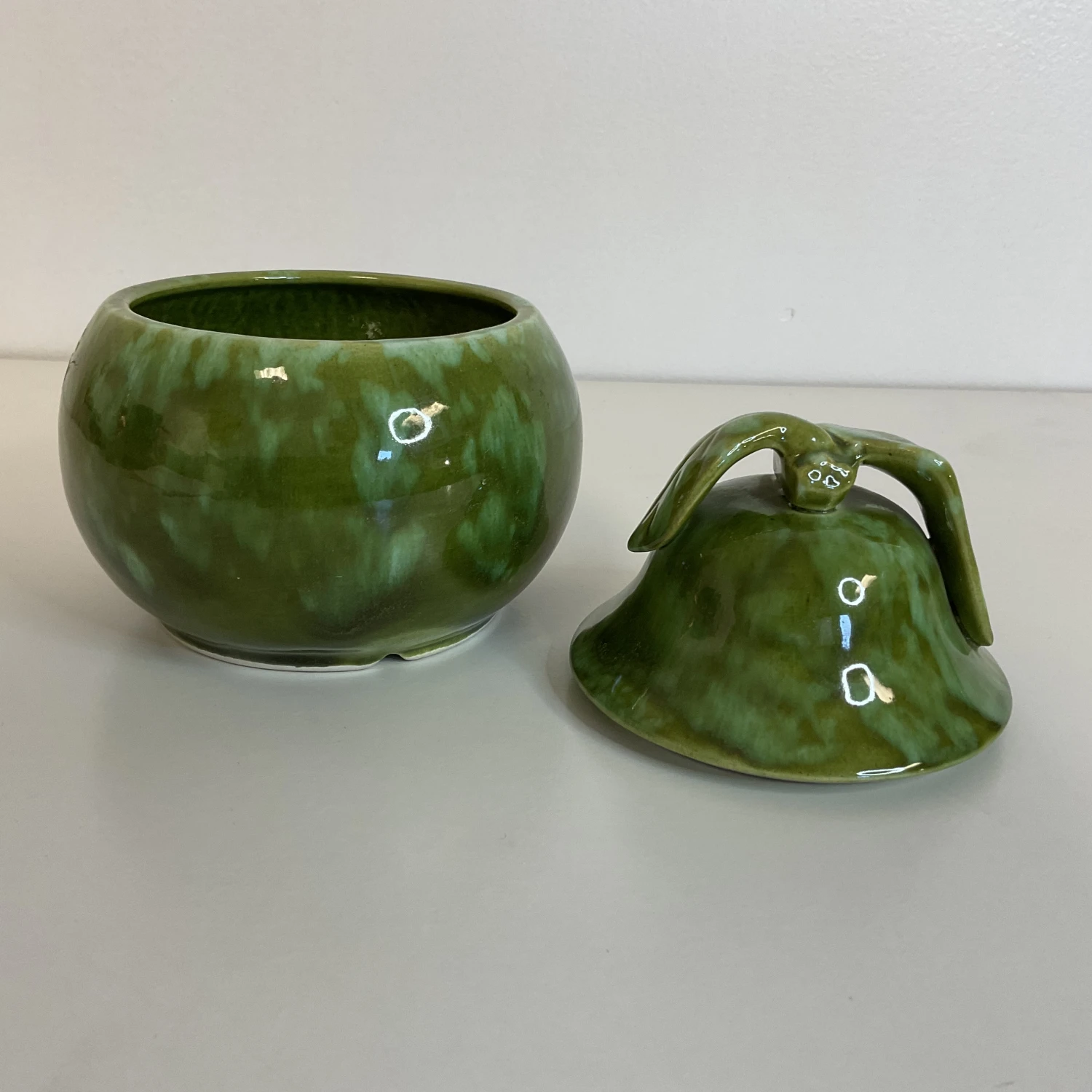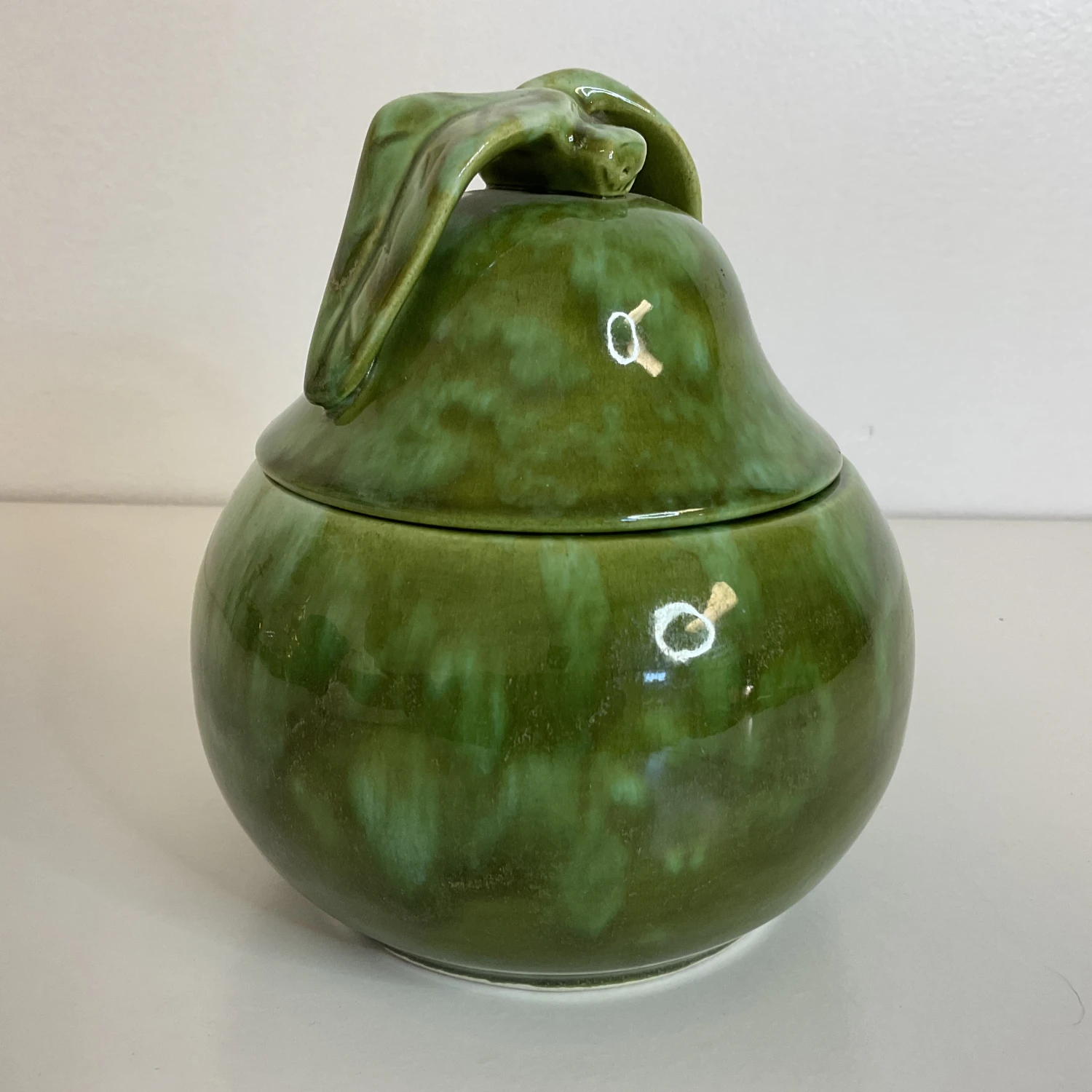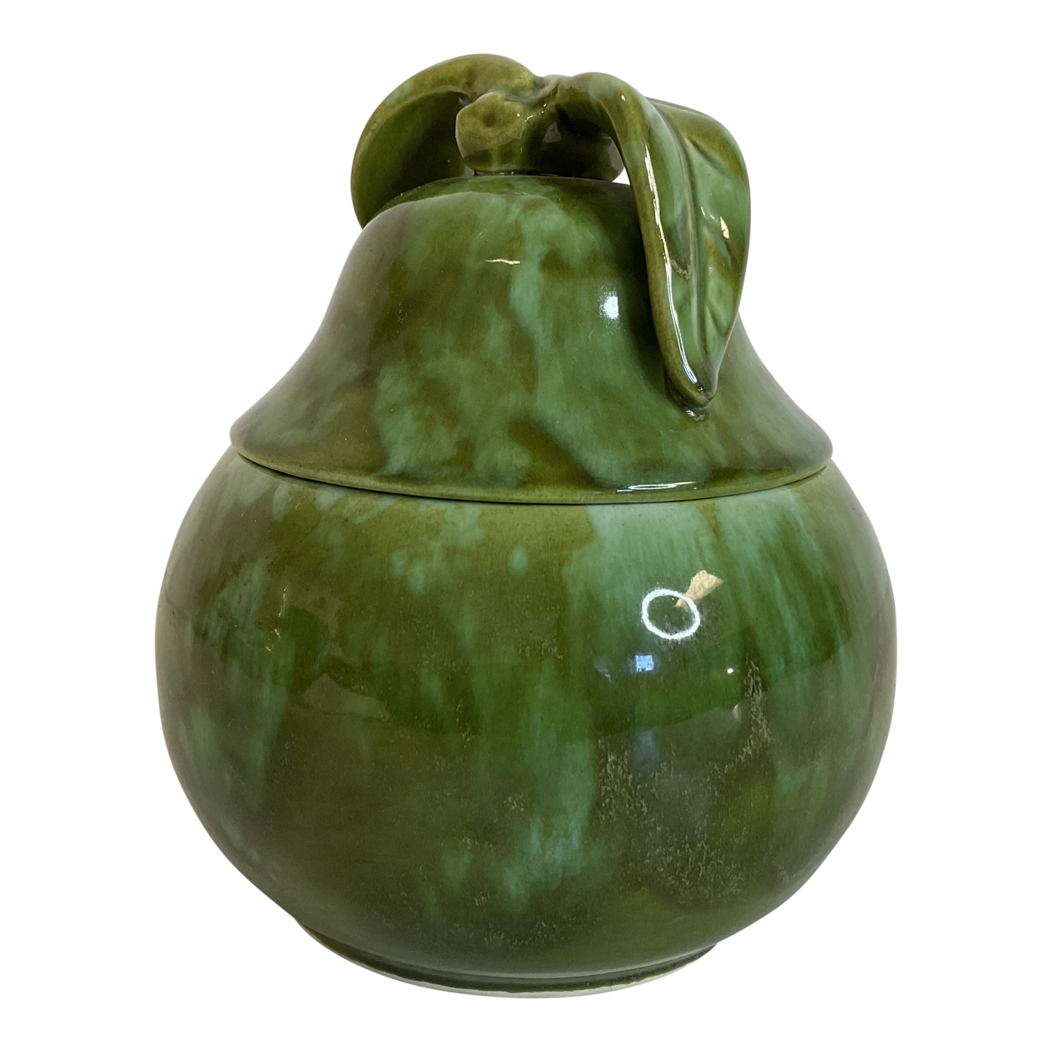 The Pear shape is such a lovely decor element. This ceramic pear box is from Enchanto which was in production in the 1950s in Southern California. The glaze is Majolica in style and is finished in gorgeous green hues. We love the lid that features a short stem with two leaves. Pears work all year long as beautiful touches on a table, desk or shelf, but they are especially nice to display in the fall. This 1950s ceramic pear is a piece of Americana and the California Pottery history.