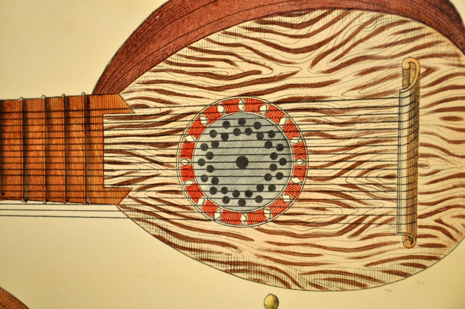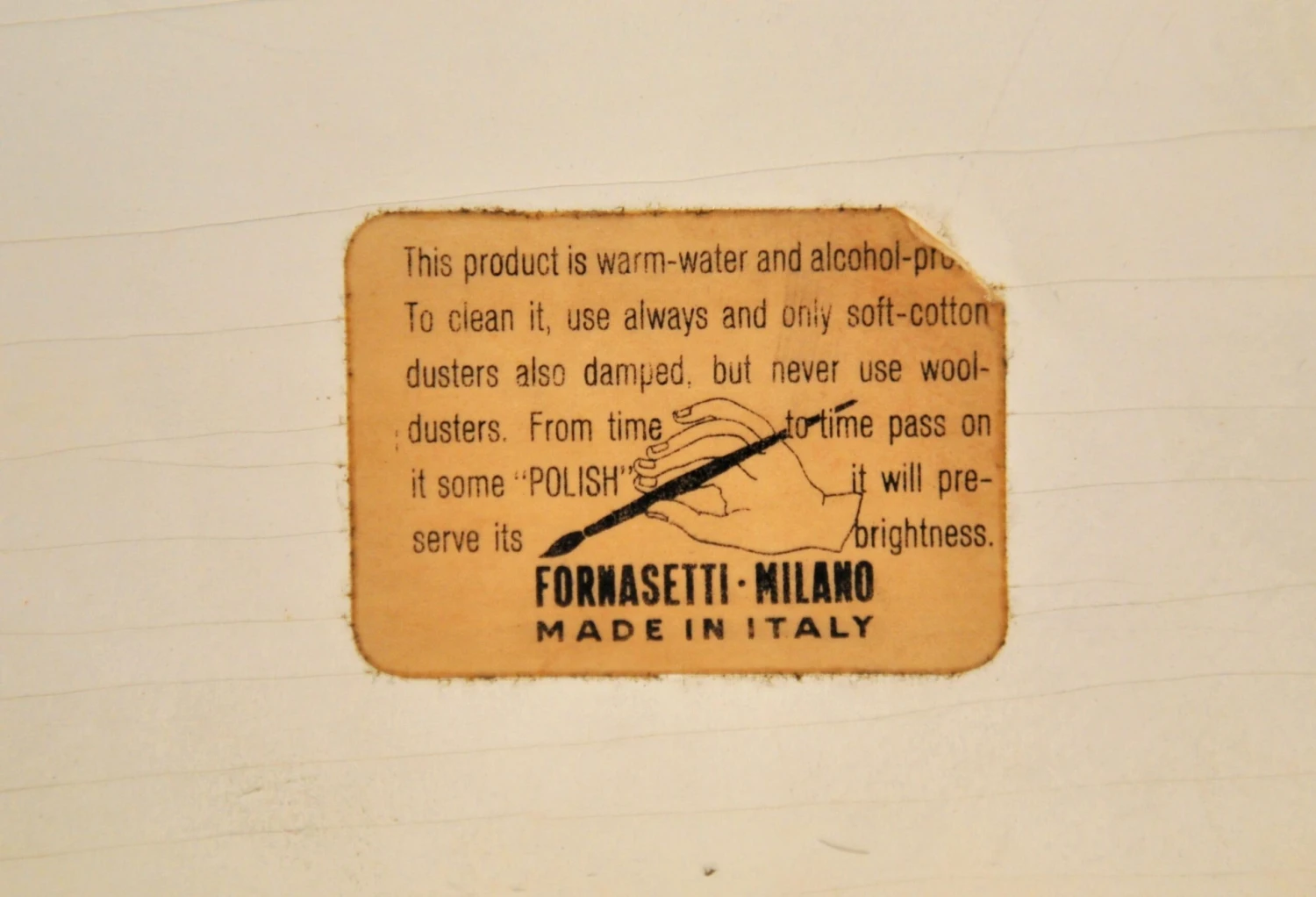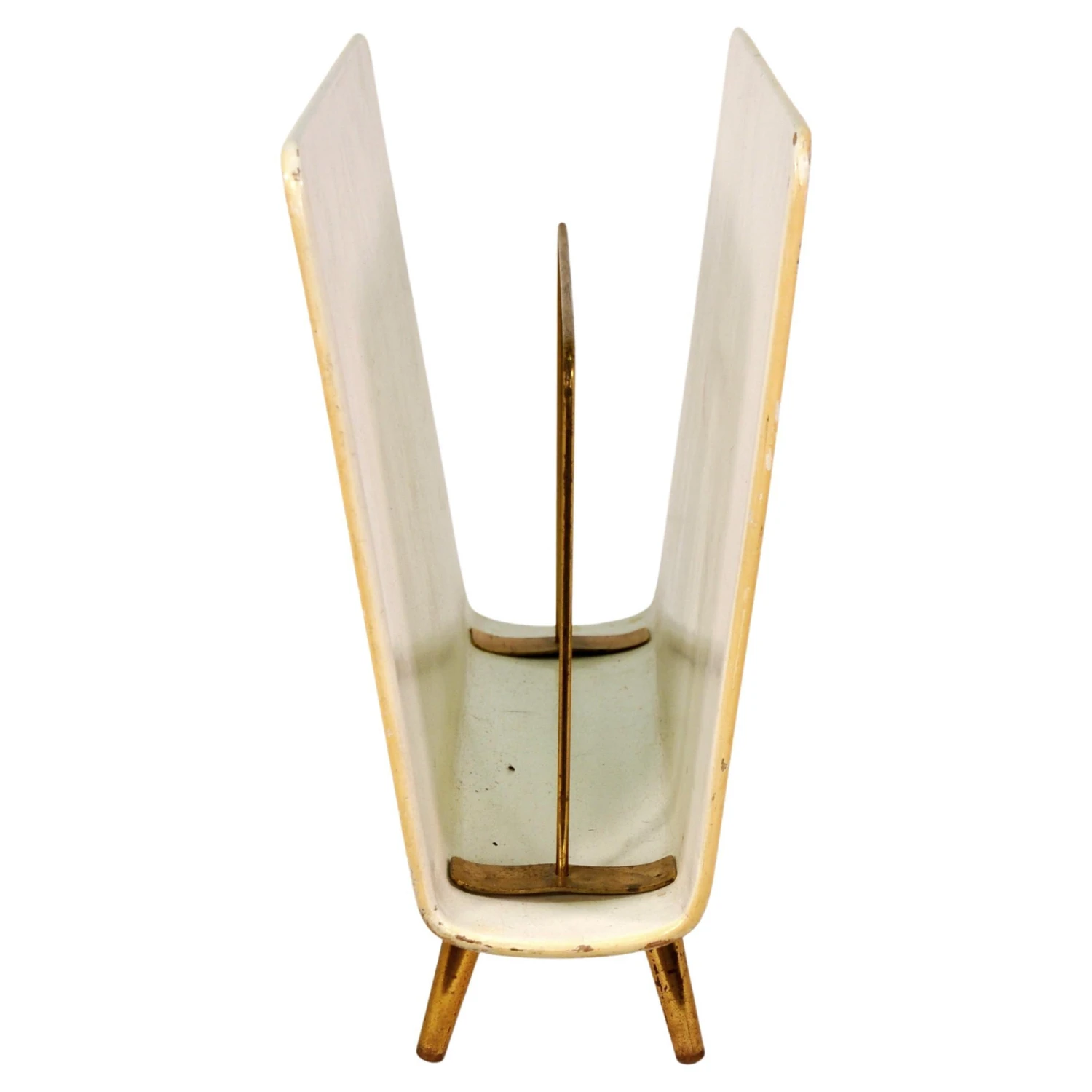 A rare and early magazine stand or portariviste designed and manufactured by the Italian master of playful and surreal self-expression Piero Fornasetti in the 1950s. The vintage rack is made of lithographically printed and lacquered plywood depicting musical instruments. it has a brass divider and brass feet. Retains original early label on bottom. For more Piero Fornasetti objects and furniture, please visit our storefront.