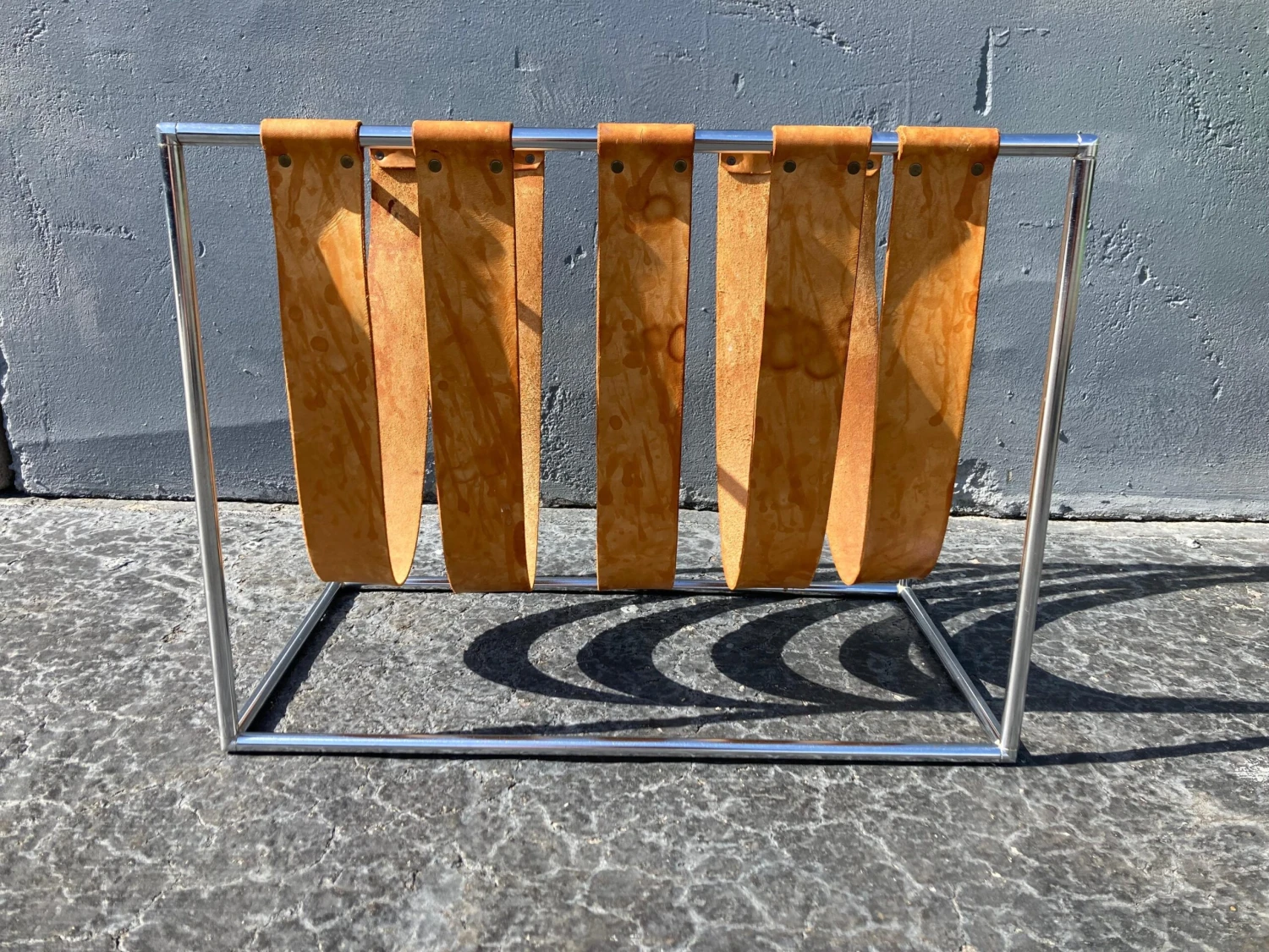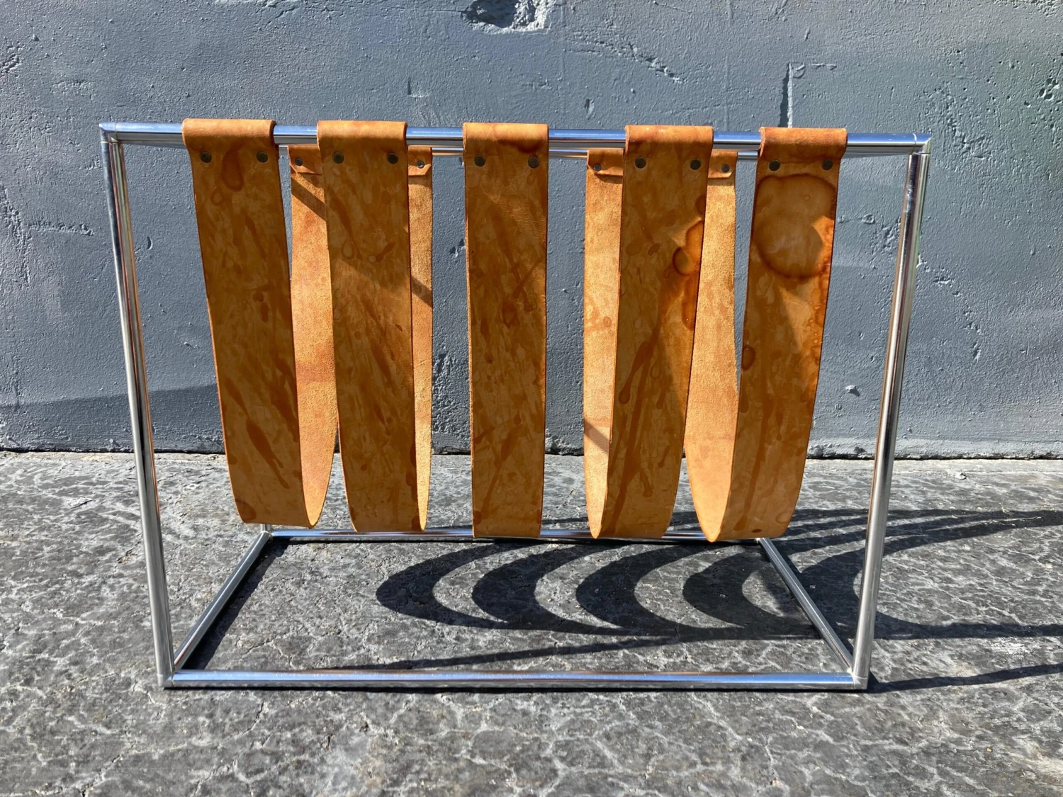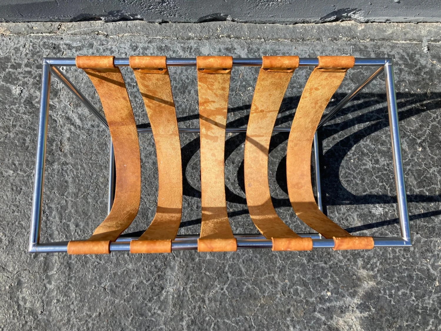 Chromed frame, natural saddle leather straps. Beautiful patina. Straps are not fixed…can be moved.
