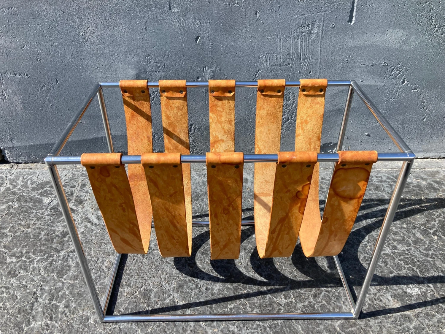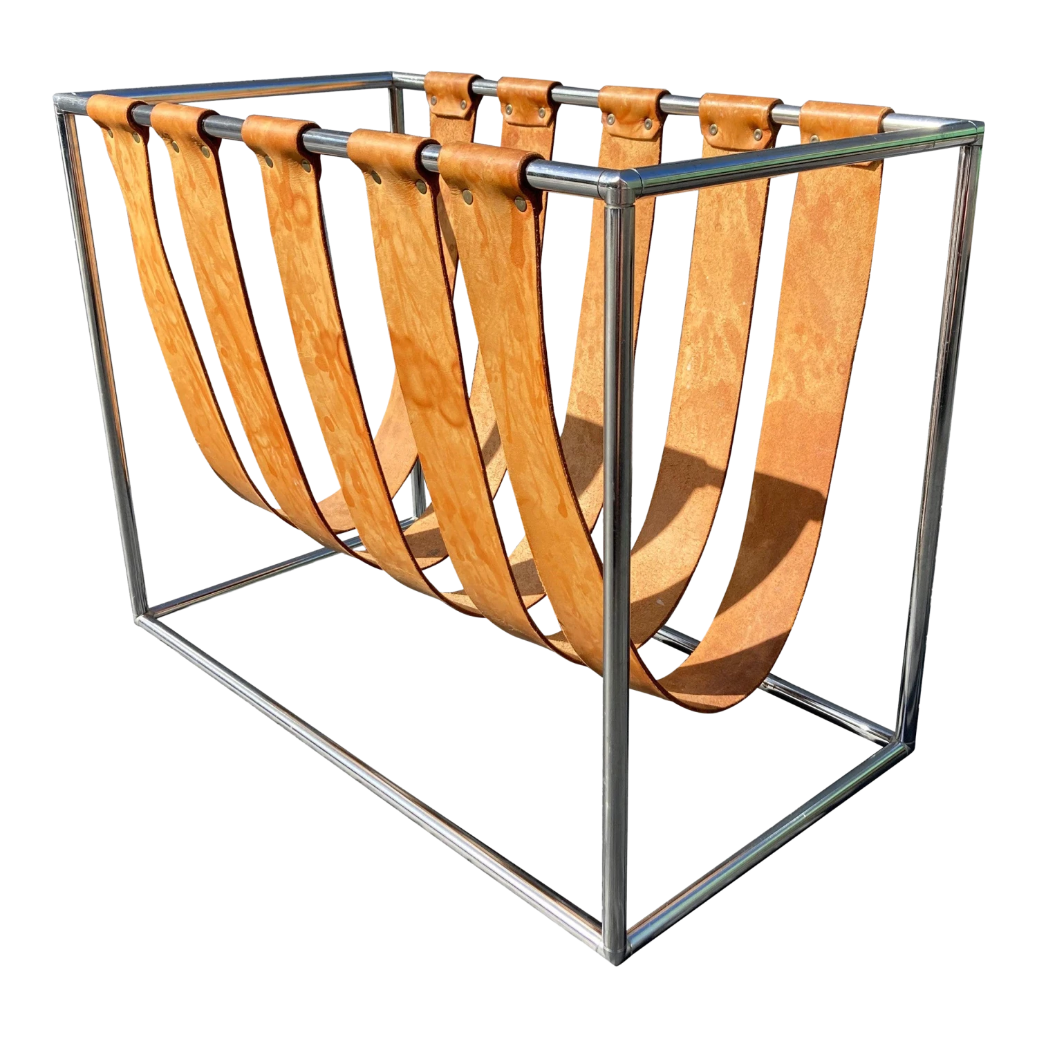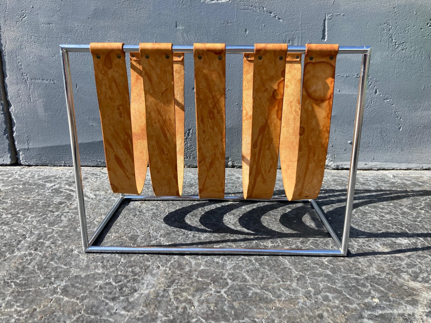 Chromed frame, natural saddle leather straps. Beautiful patina. Straps are not fixed…can be moved.