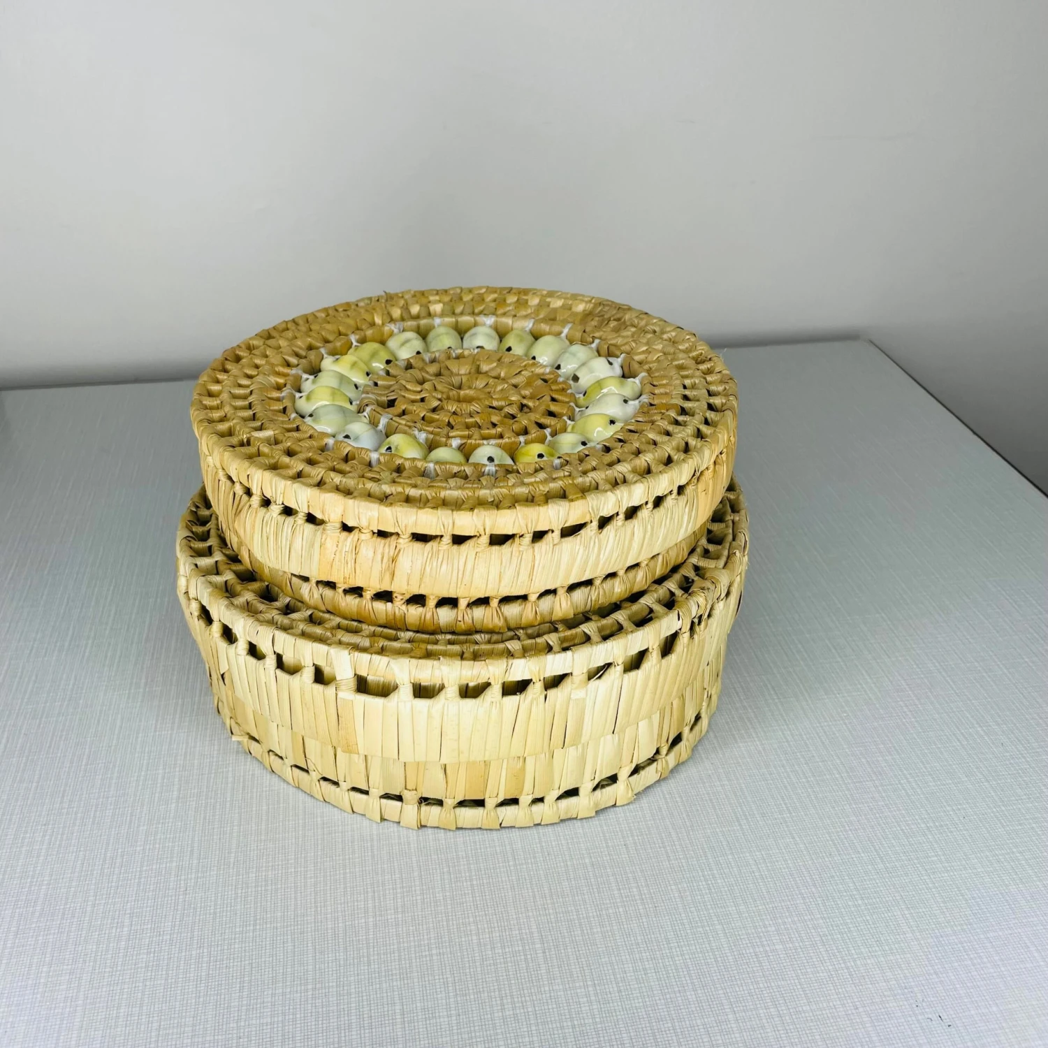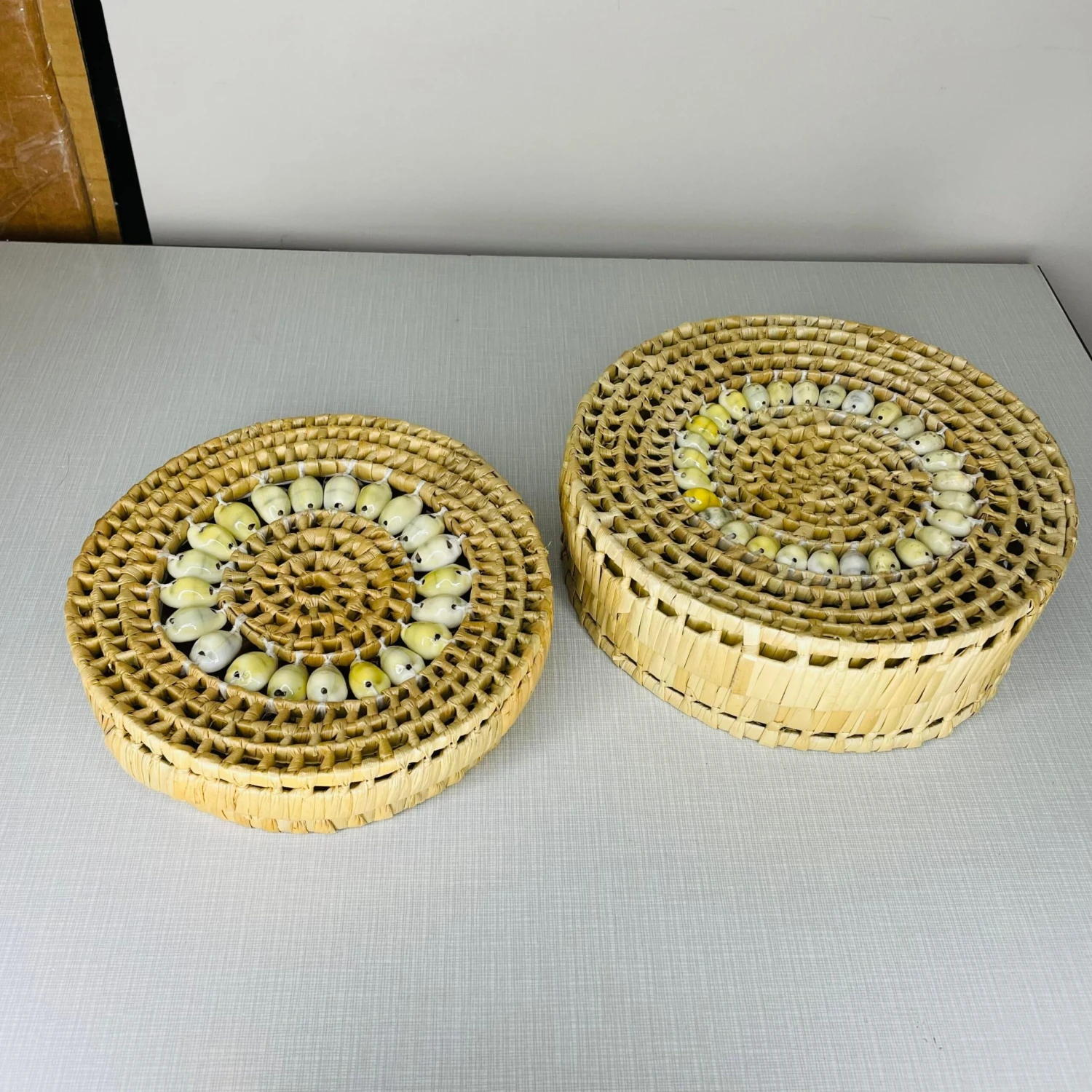 A pair of nesting baskets with shells on the lids. Both baskets are in great condition!