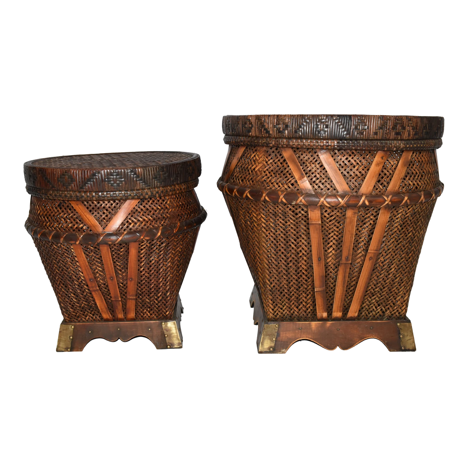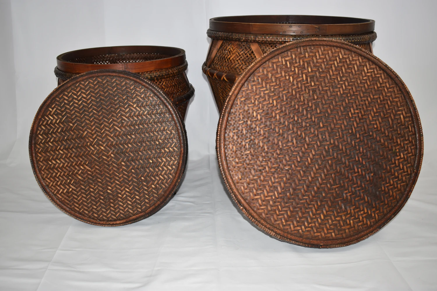 Handcrafted woven rattan and bamboo baskets with lids. The lids have a unique design woven into them while the bottom …