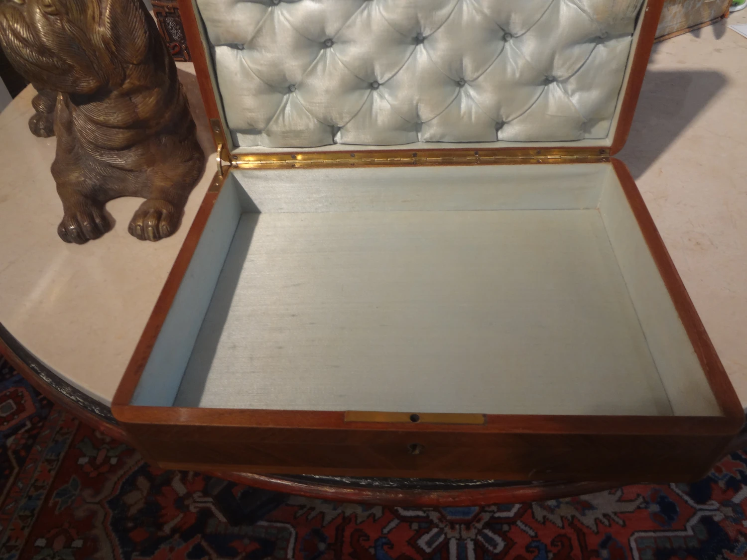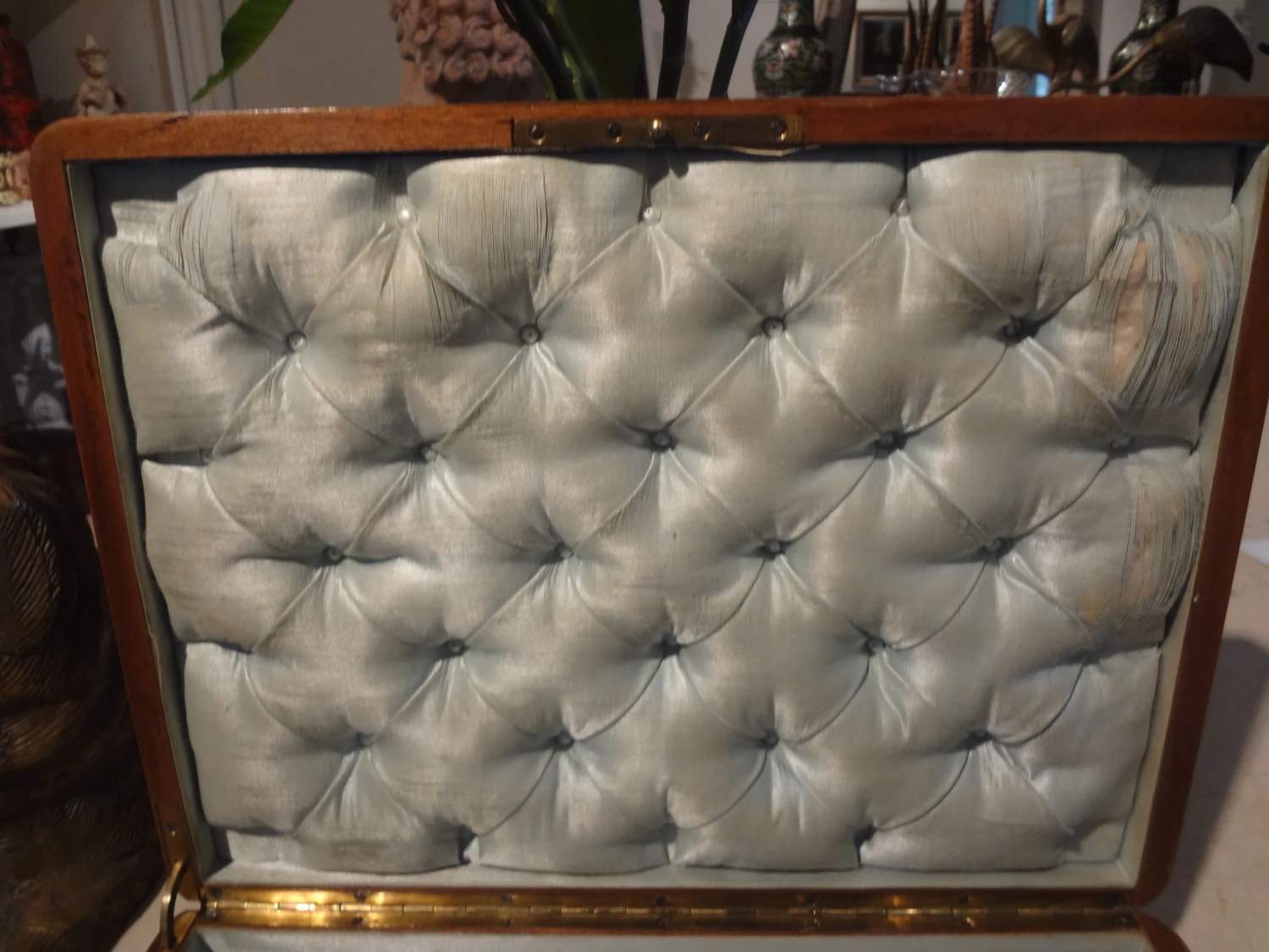19th Century Brass Inlaid Walnut Box. This Stunning Decorative Box Or Jewelry Box Has Beautiful Brass Inlay And Trim With The Original Tufted Satin Interior.