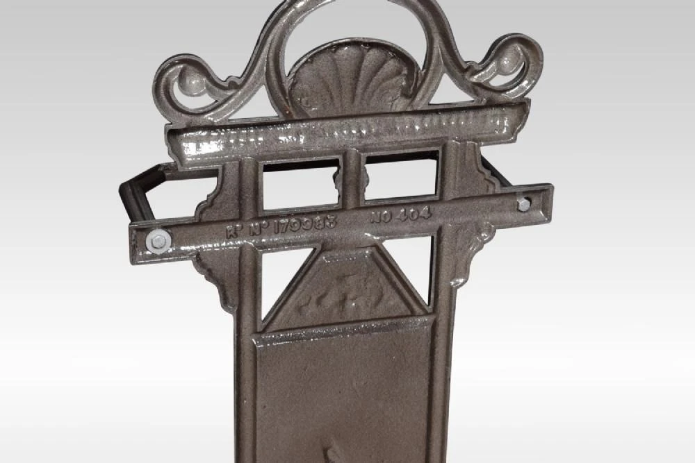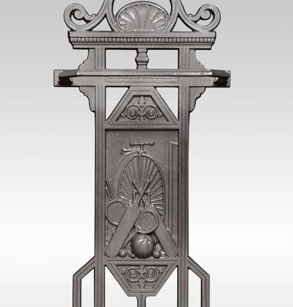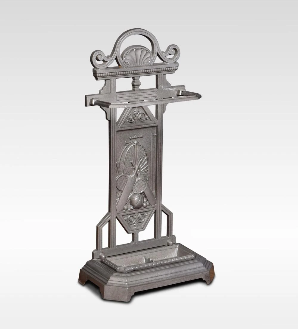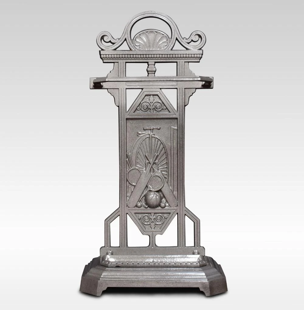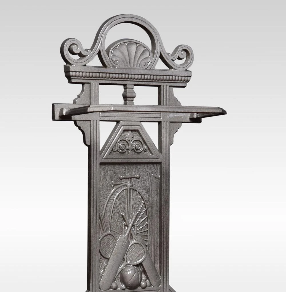 19th century cast iron stick or umbrella stand, the back plate with sporting motif and penny farthing in background. All …