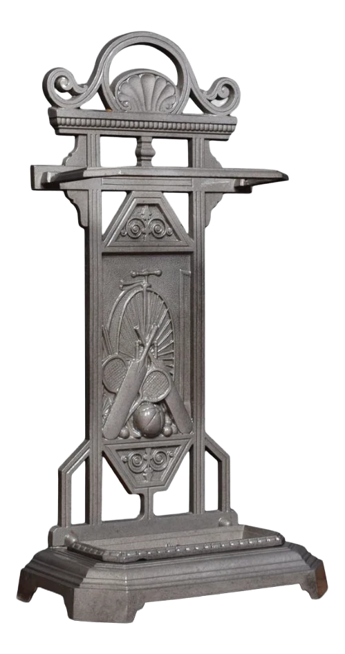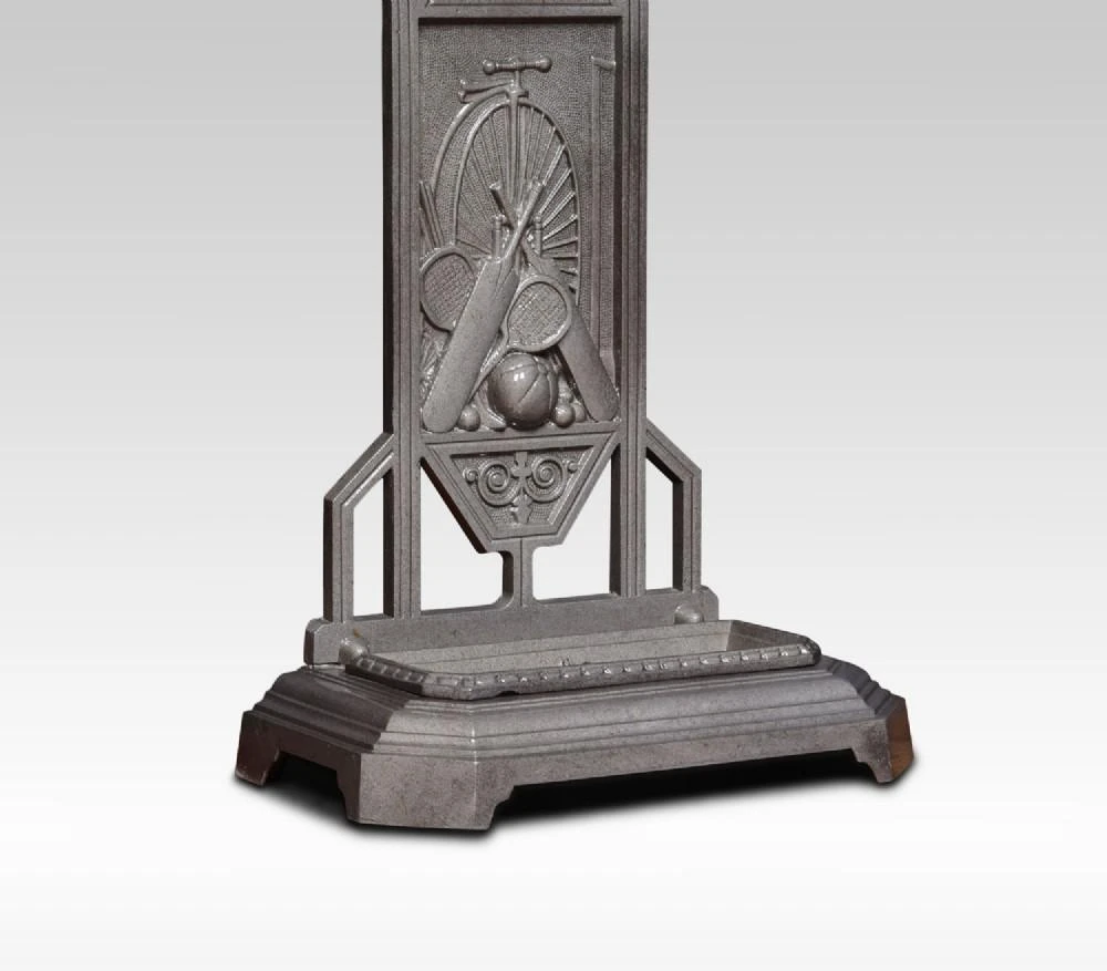 19th century cast iron stick or umbrella stand, the back plate with sporting motif and penny farthing in background. All raised up on plinth base incorporating original drip trays. The manner reminiscent of Thomas Jekyll. Dimensions Height 30.5 Inches Width 15.5 Inches Depth 8 Inches.