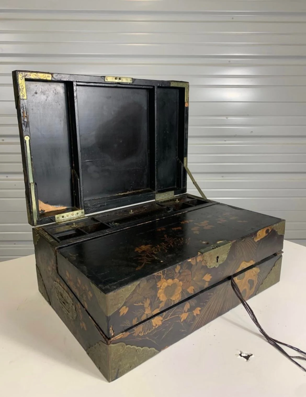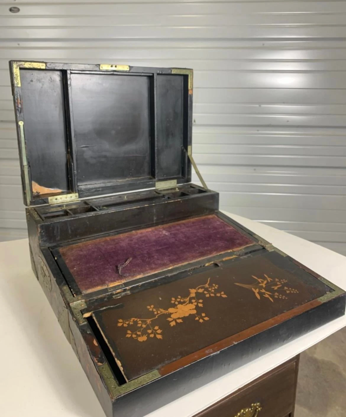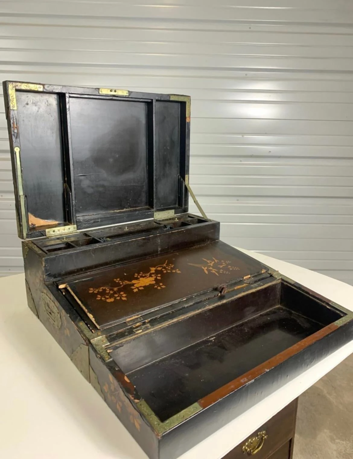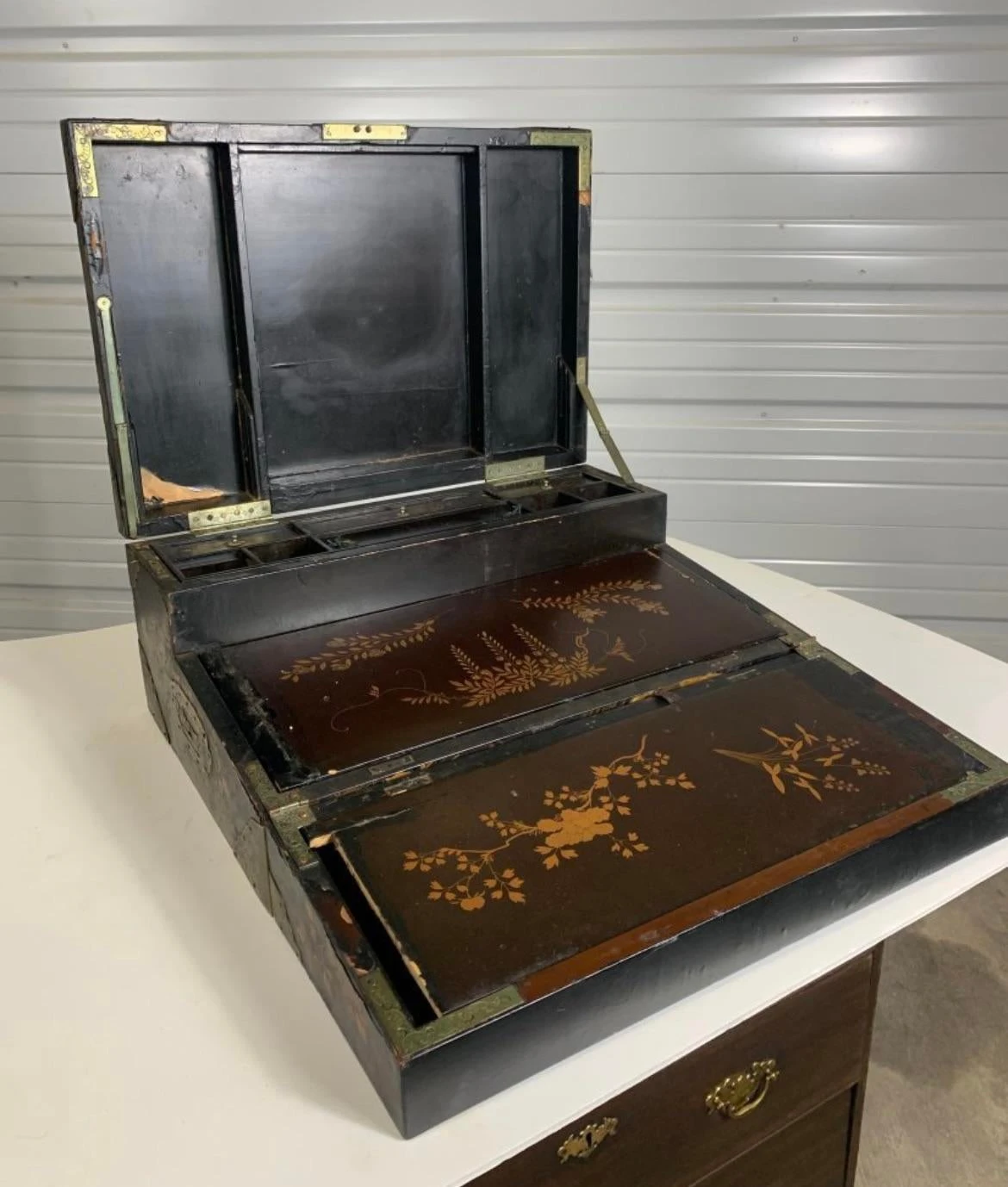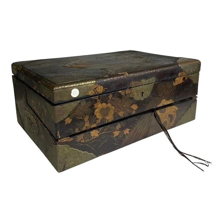 A very fine and beautiful 19th century english lap desk decorated in black and polychrome lacquer. Chinoiserie in feature with …