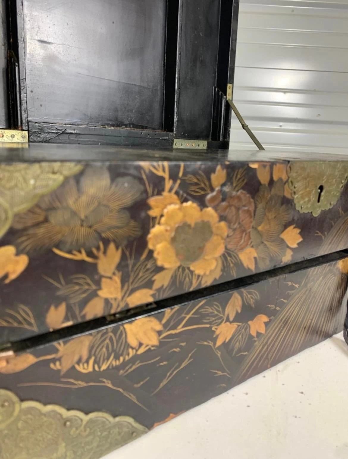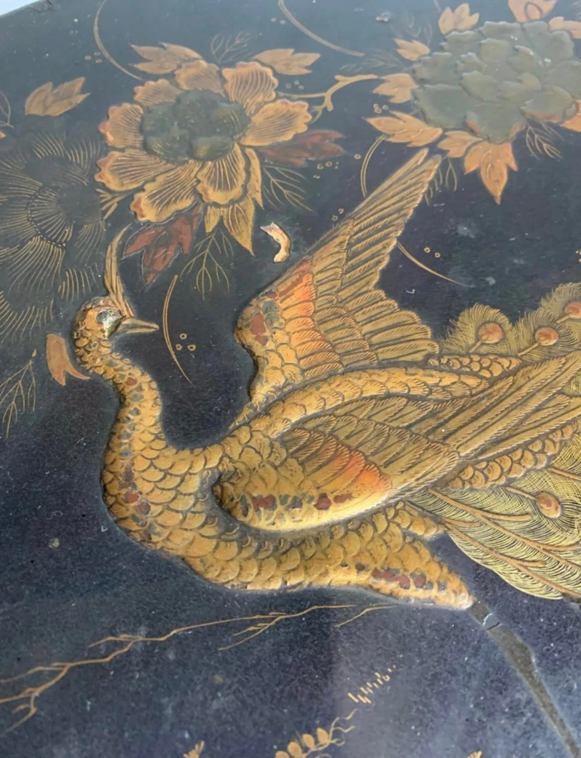 A very fine and beautiful 19th century english lap desk decorated in black and polychrome lacquer. Chinoiserie in feature with a large peacock and flowers. Over sized.