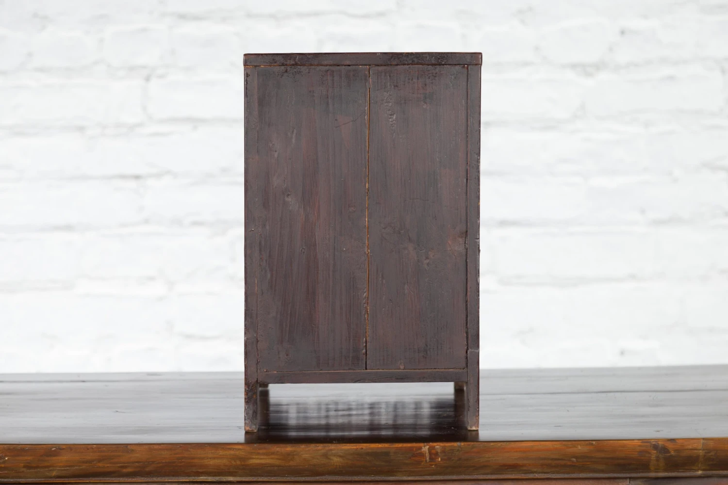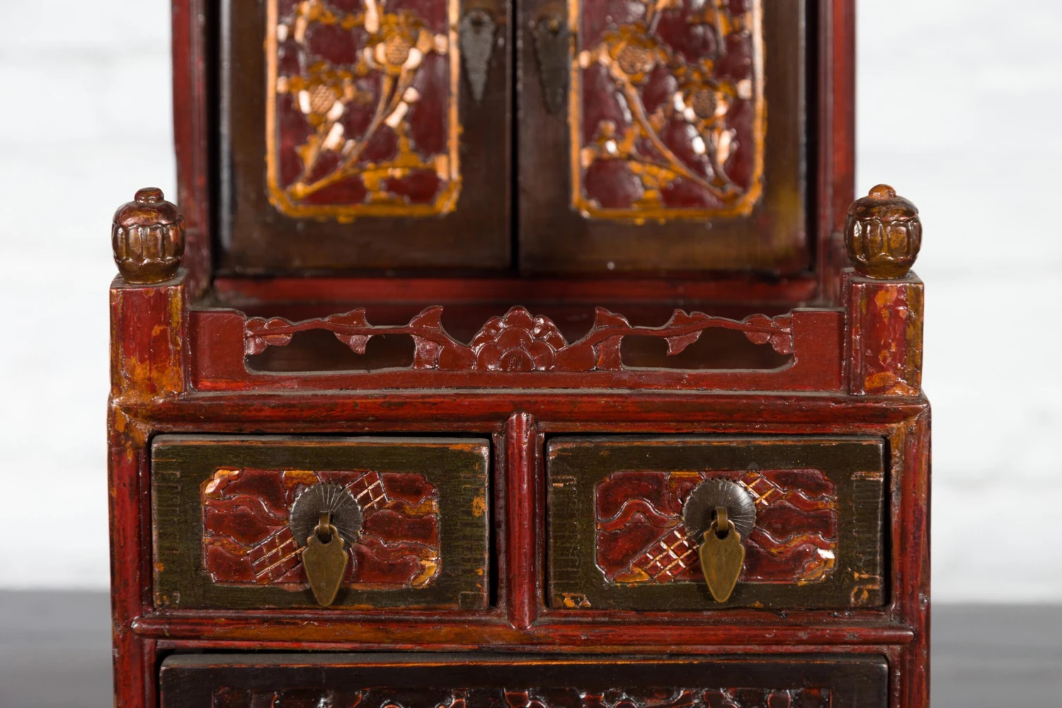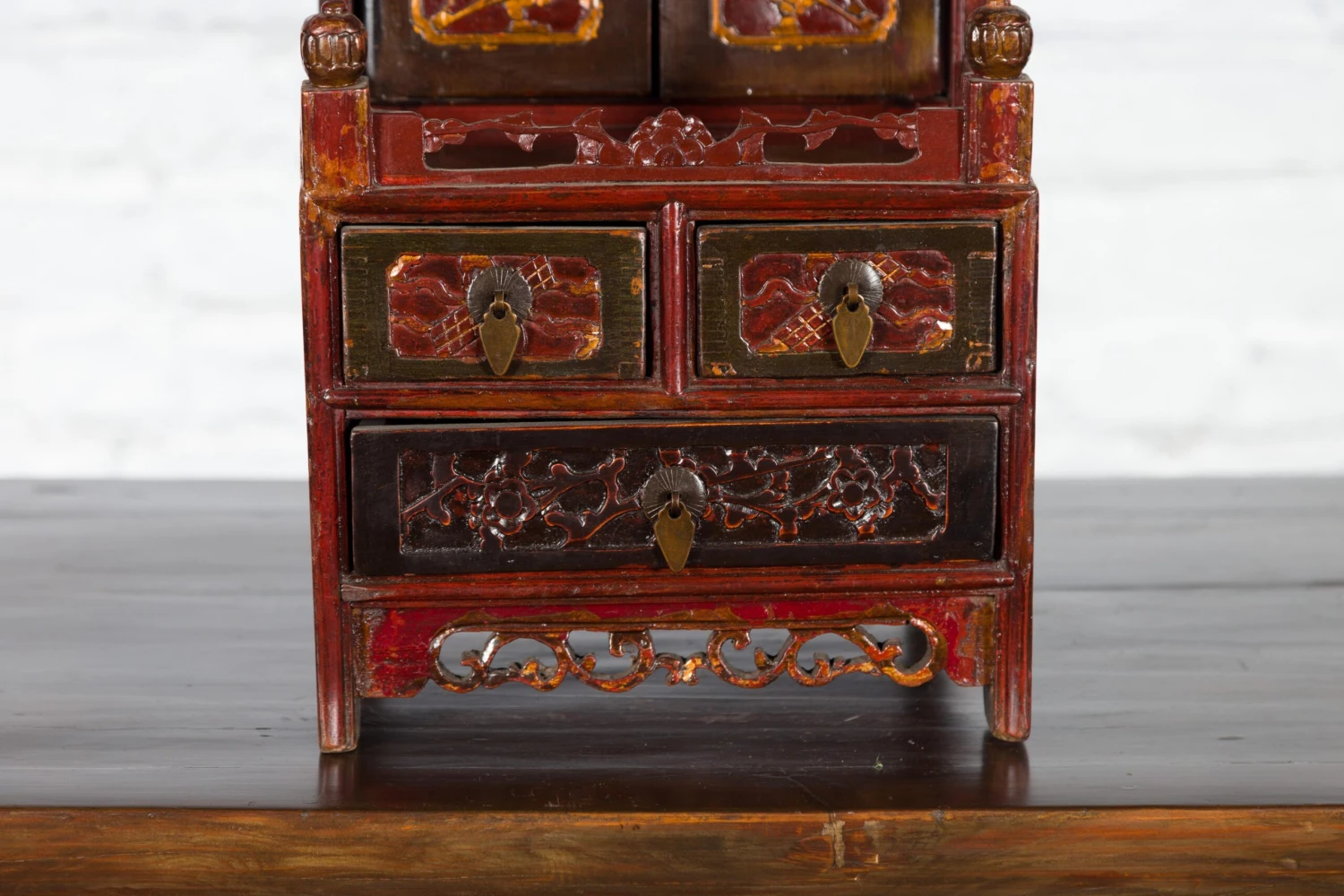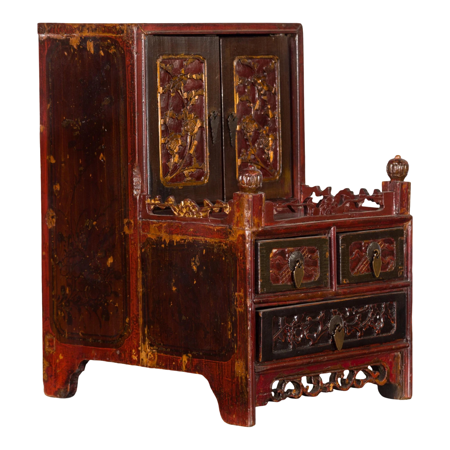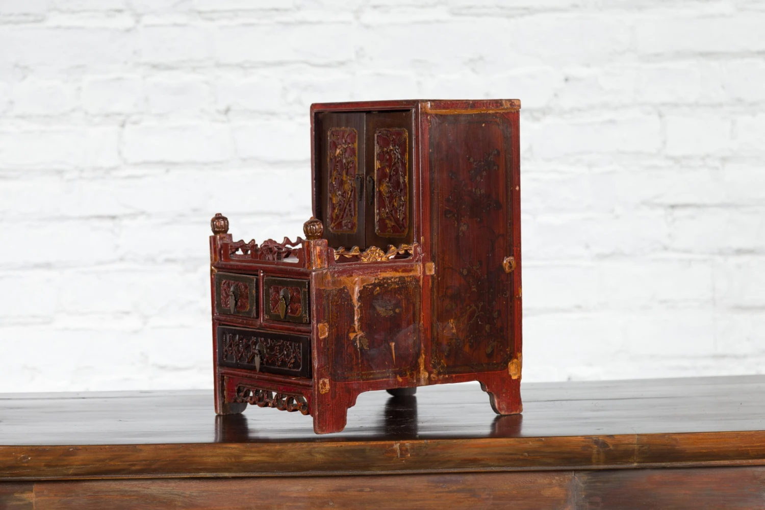 An antique Chinese Qing Dynasty red and dark brown lacquer elmwood jewelry box from the 19th century with carved and gilt motifs. Created in China during the Qing Dynasty era, this jewelry box attracts our attention with its red and black finish and golden accents. Made of elmwood, the box showcases two petite doors opening to inner shelves, while the lower protruding section accented with finials is made of three drawers fitted with teardrop brass hardware. Presenting hand-carved foliage and floral motifs, the box is raised on four small feet connected to one another through a carved apron in the front. With its nicely weathered appearance and complimenting colors, this Qing Dynasty red and brown lacquered elmwood jewelry box will make for a lovely addition to any bedroom or dressing room!.