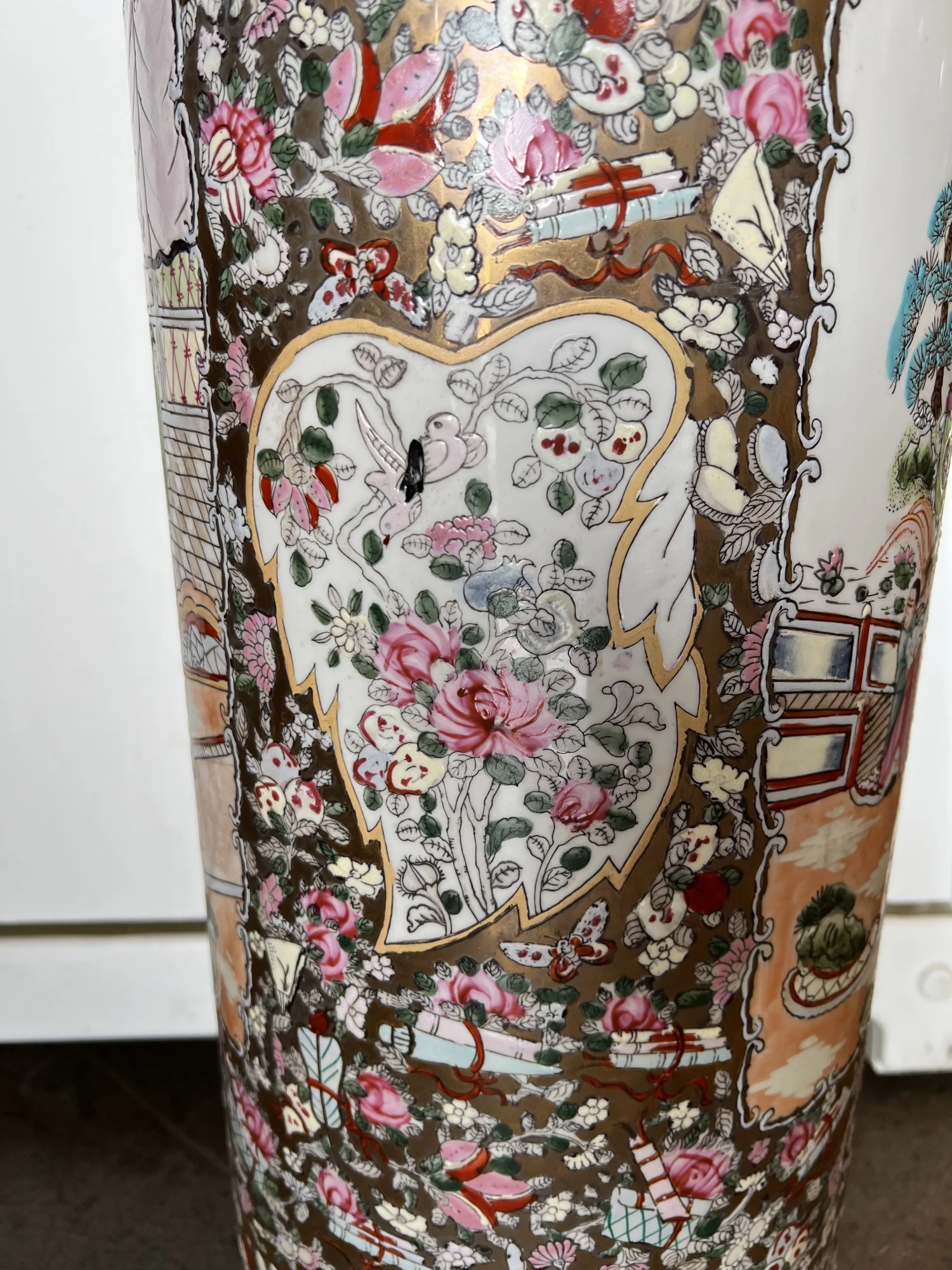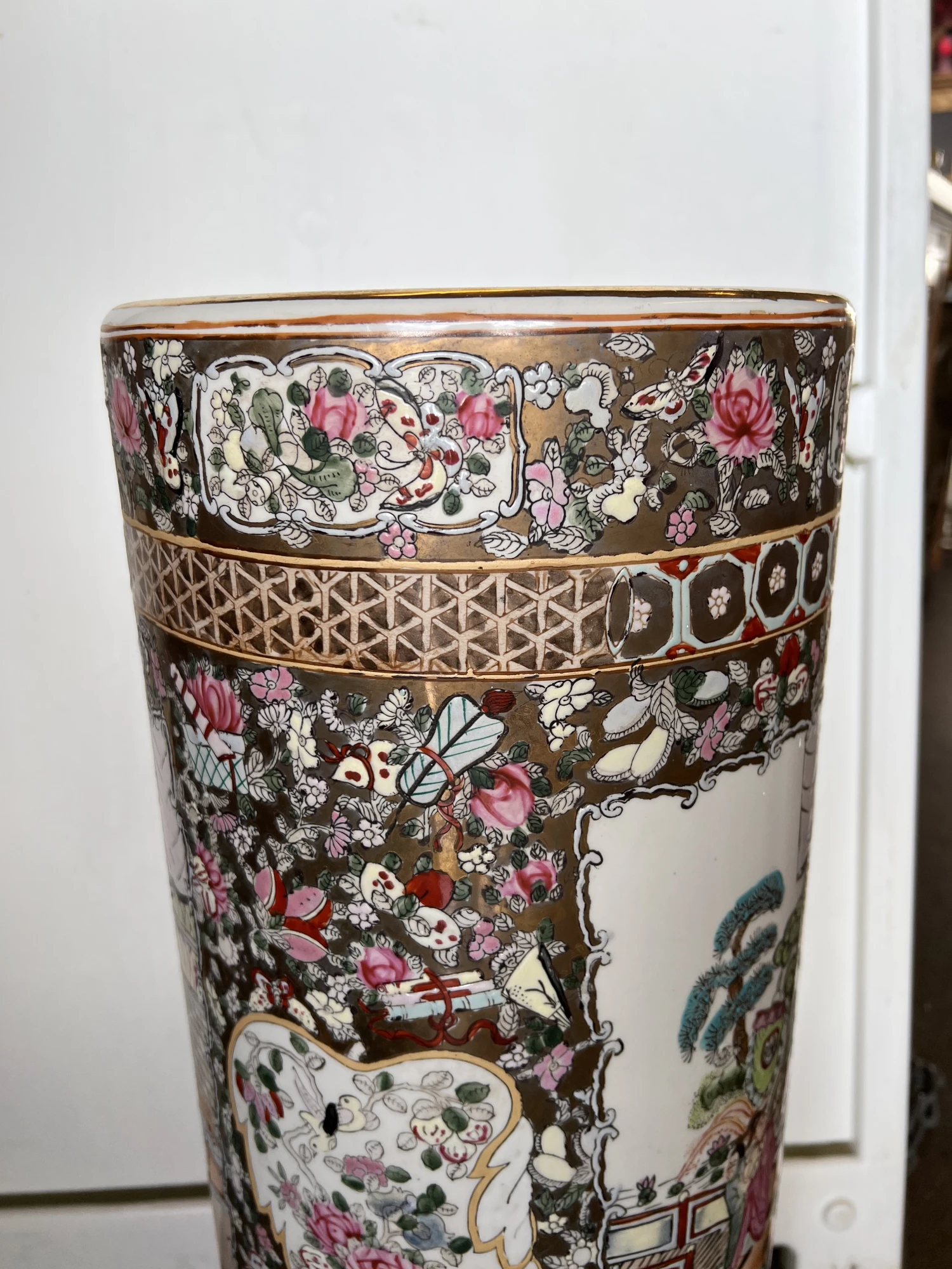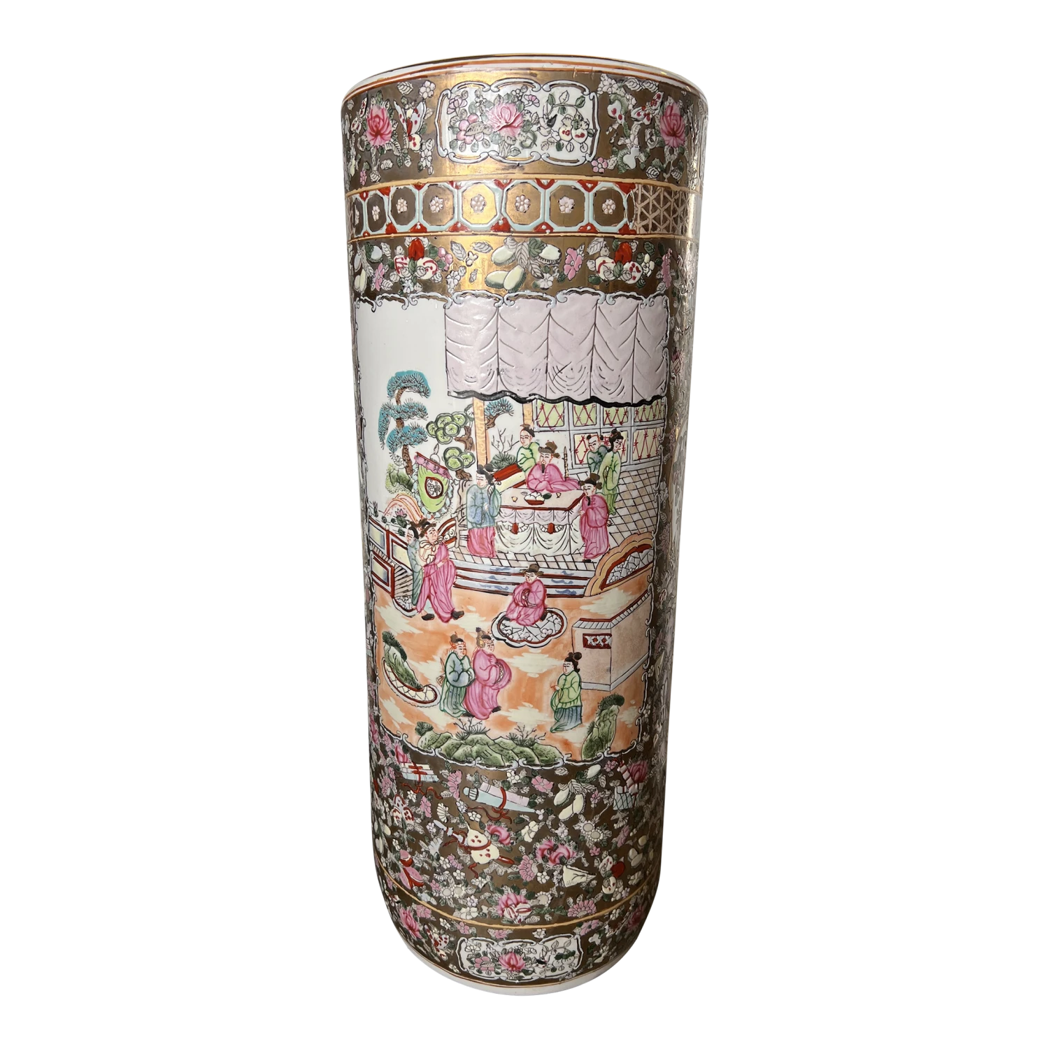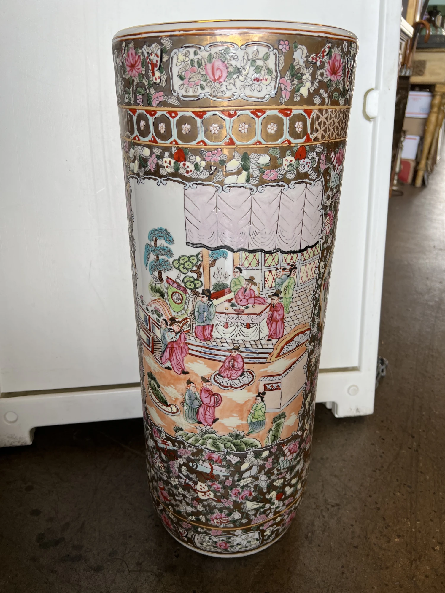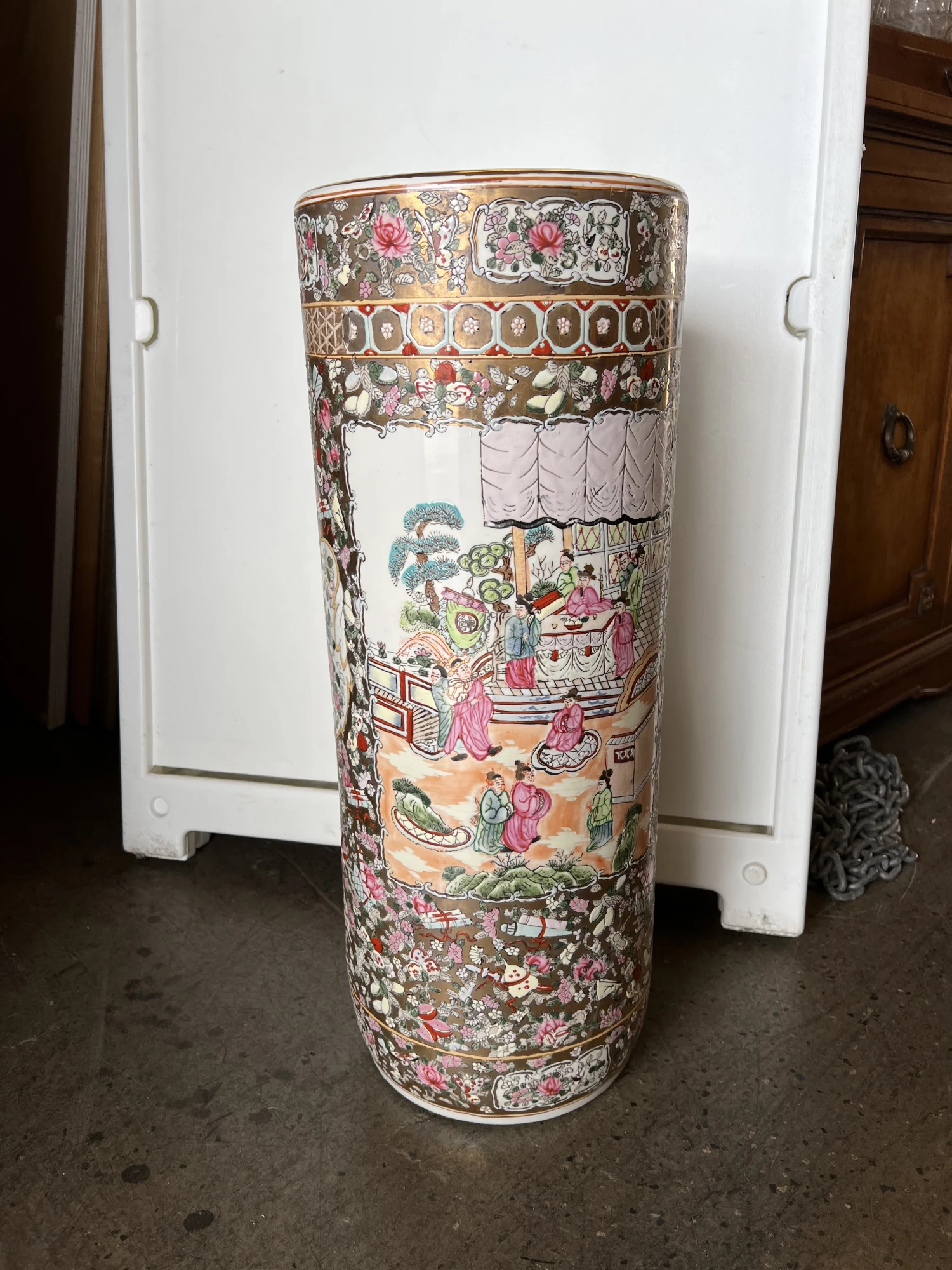 This Oriental Porcelain Umbrella Stand would be an elegant addition to your foyer providing the perfect place to store your umbrella or walking cane as you pop in the door. The large 24” tall cylinder porcelain stand is beautifully handpainted in a lush and colorful design, this umbrella stand features traditional floral and narrative scenes.