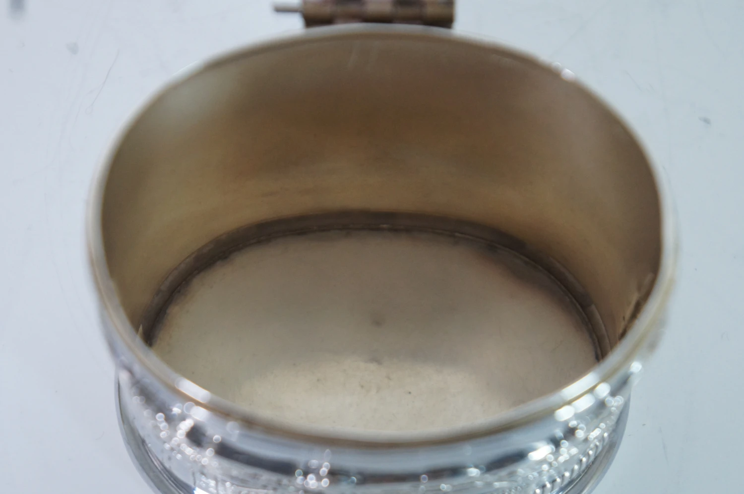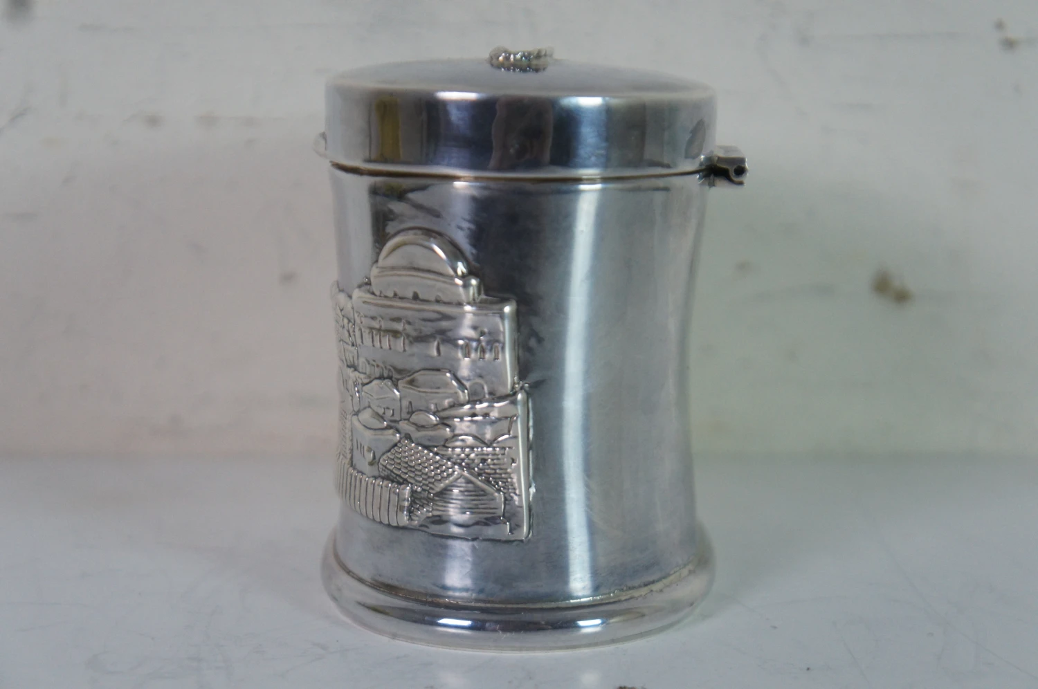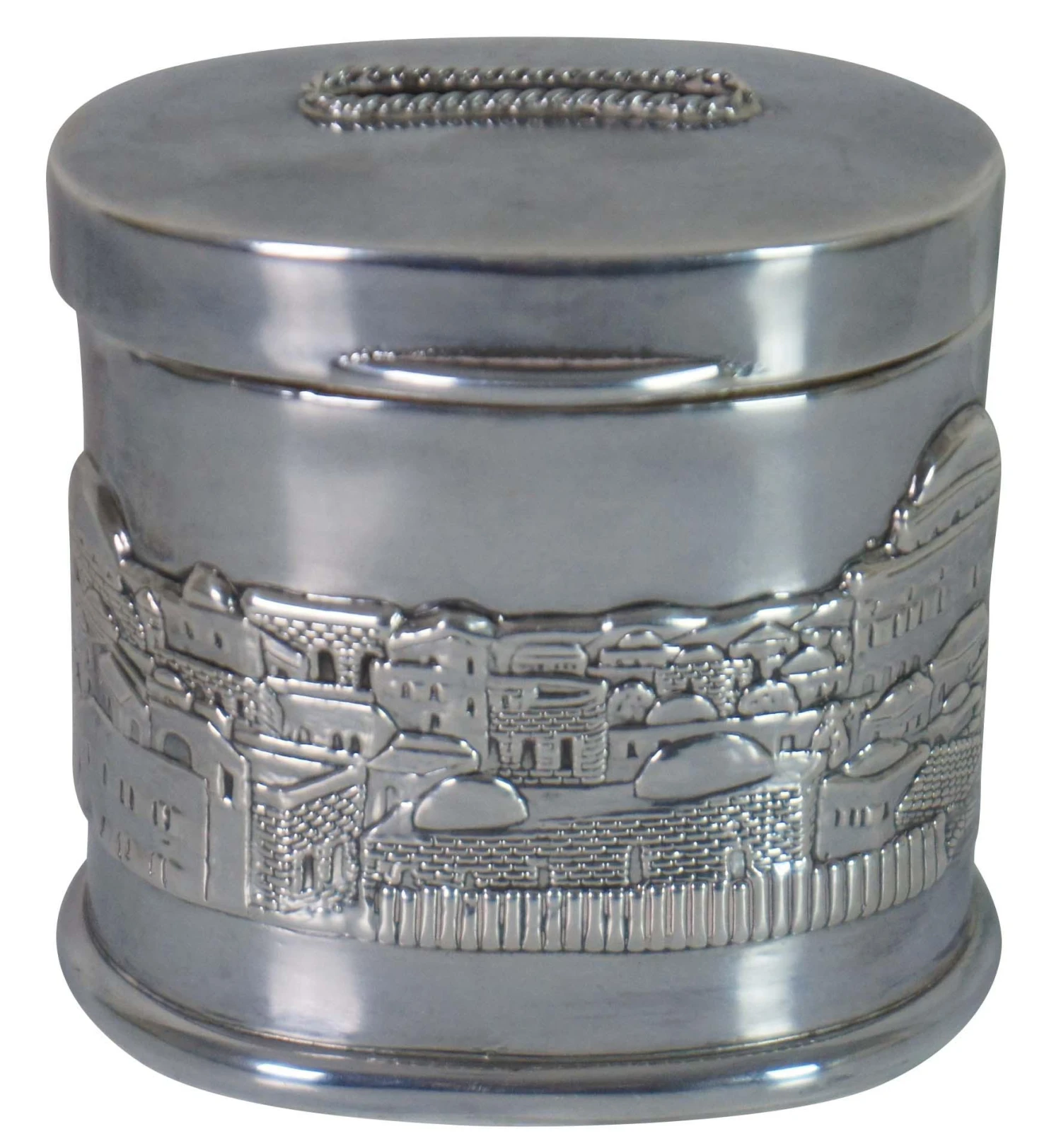 Sharaby 999 pure silver artistain bank with hinged lid, rope twist border and coin slot featuring a repousse cityscape of Jerusalem; sold by Adir Gallery.