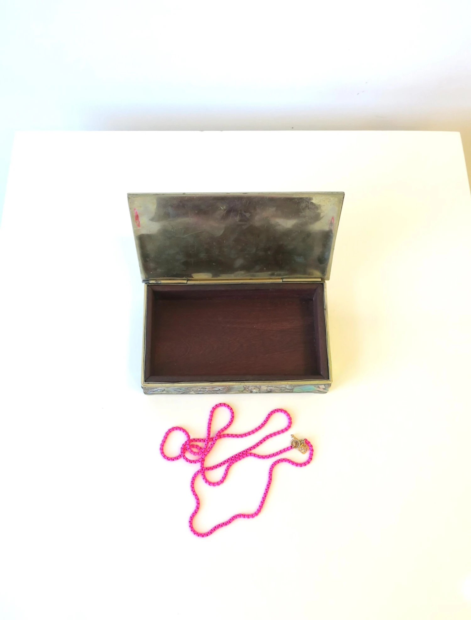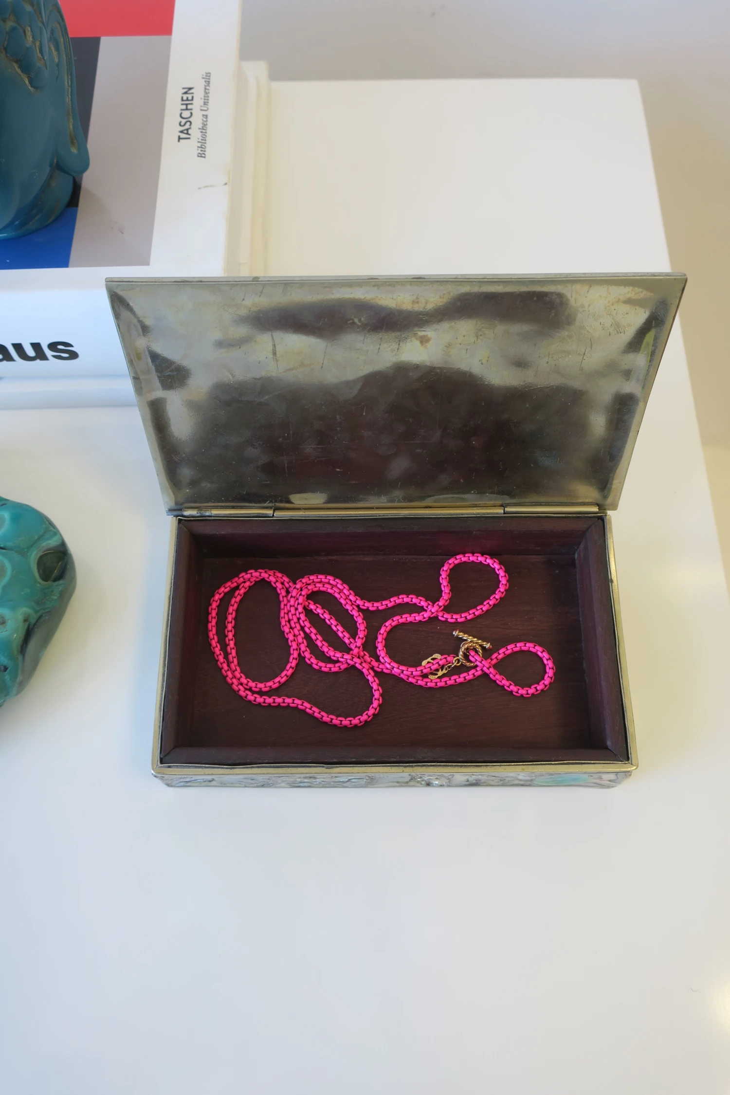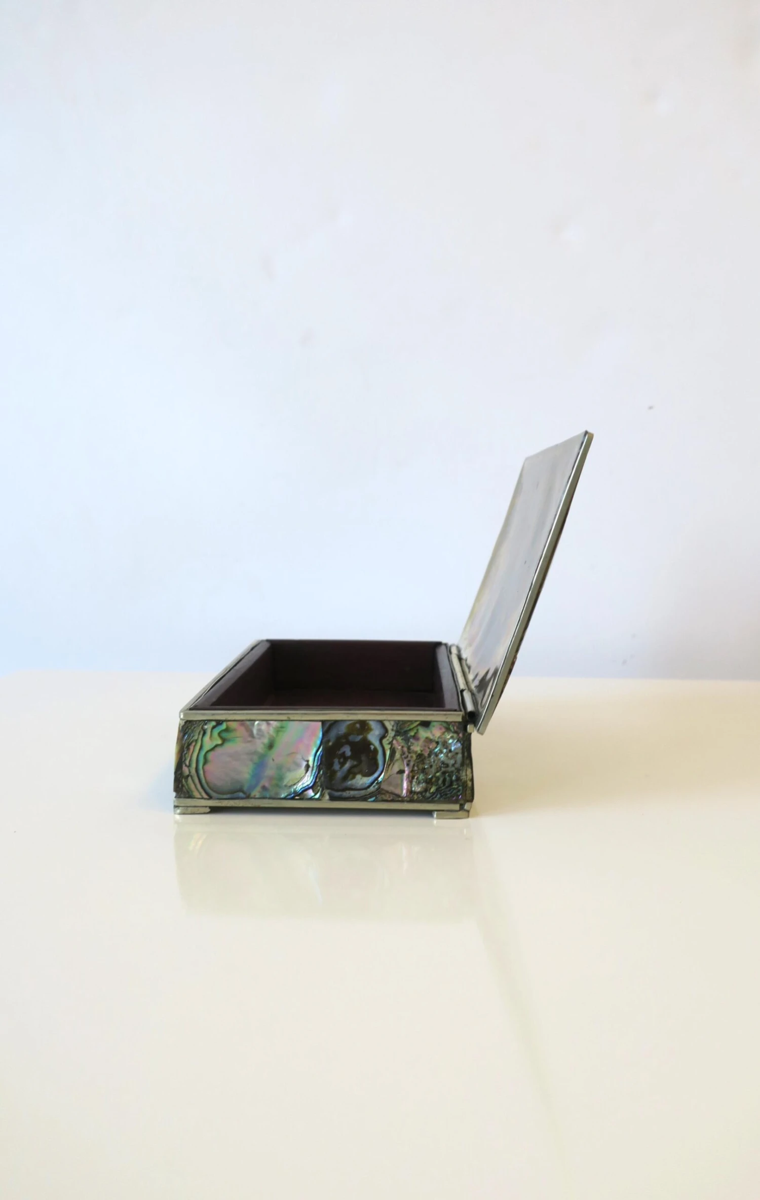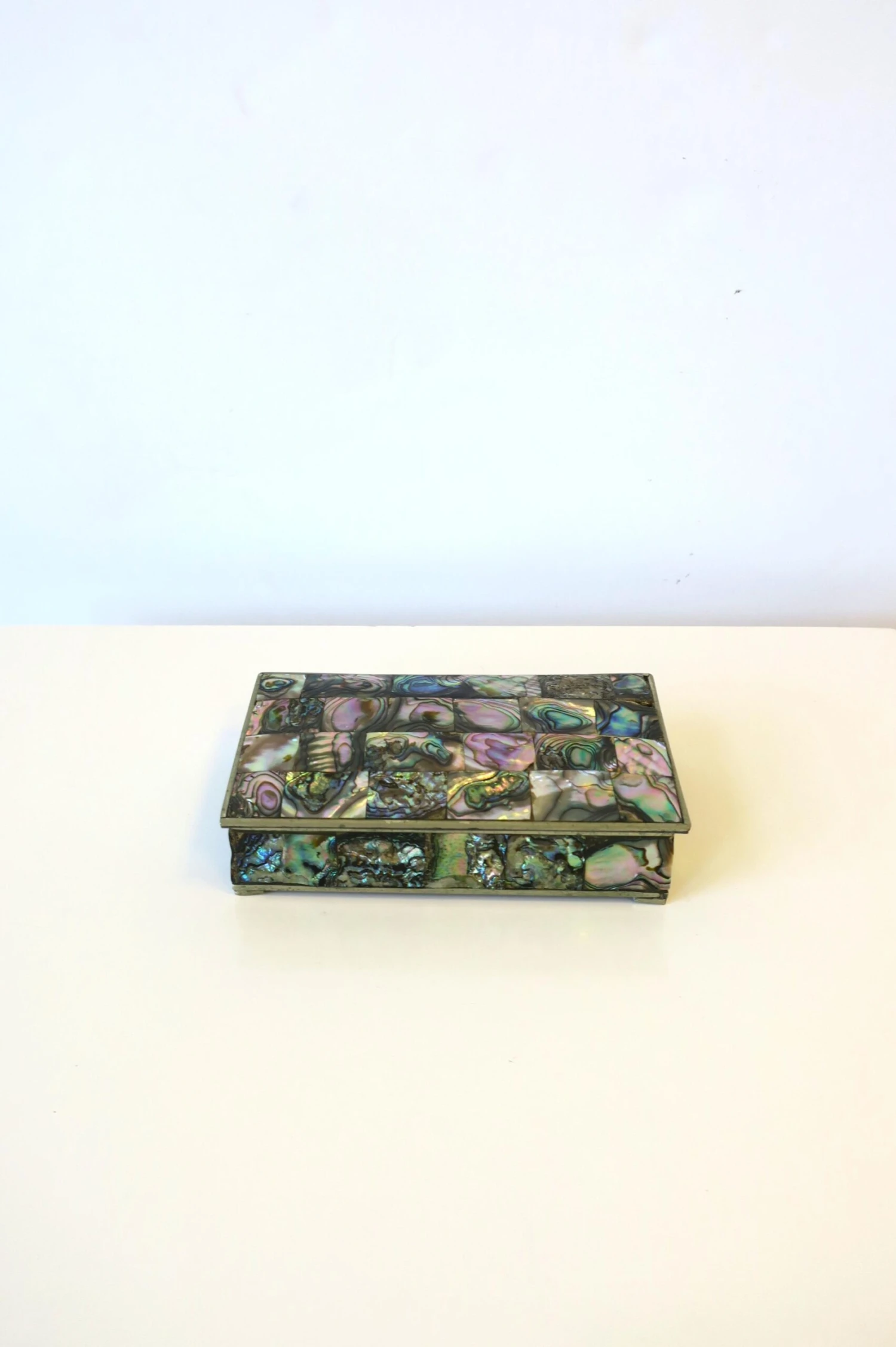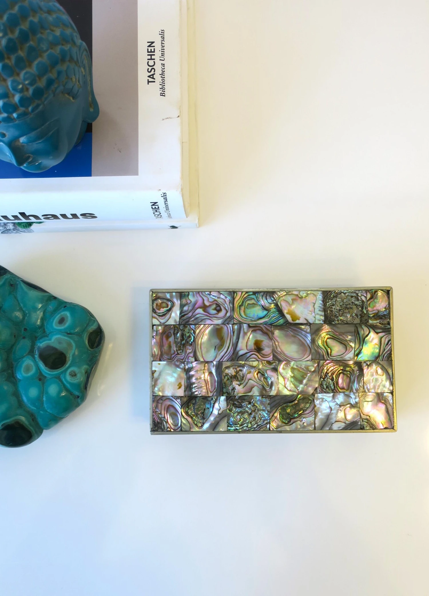 A beautiful abalone seashell, metal and wood lined rectangular box, circa mid-20th century, 1960s, Mexico. A great decorative box to …