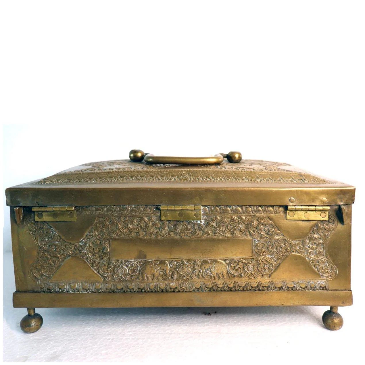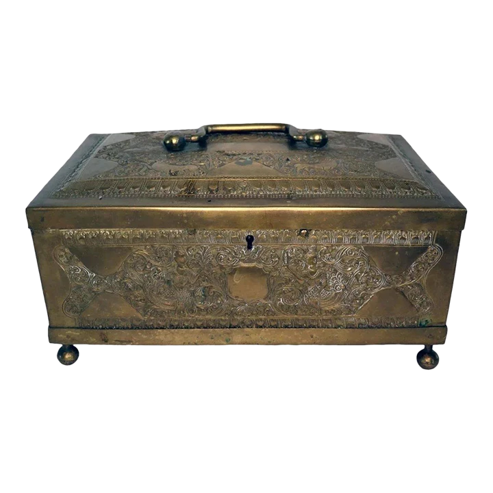 Antique box of rectangular form raised on ball feet, with hinged lid and top bail handle. The interior with two …