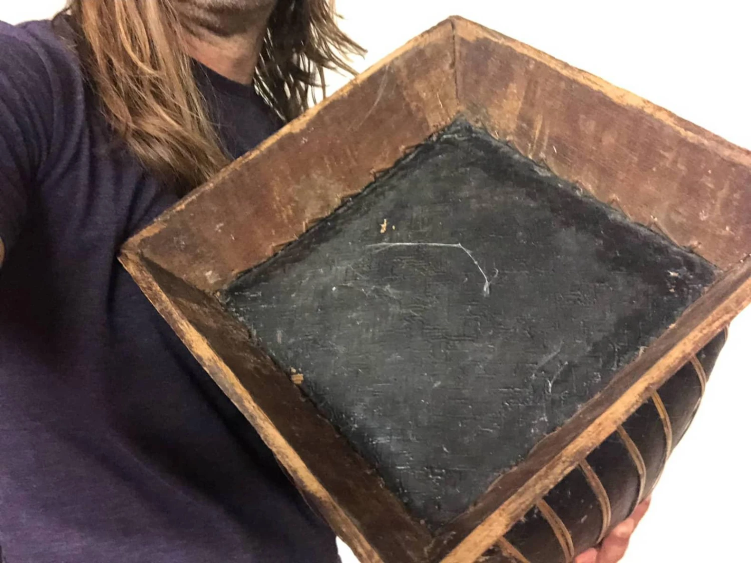 Good overall antique condition, the main part of the basket is in great shape, just a bit worn with a small amount of lacquer loss. The lid is not in great shape as the woven material is separating from the frame, but it sits nicely on the basket. The wood base has patina including some discoloration, but it adds charm.