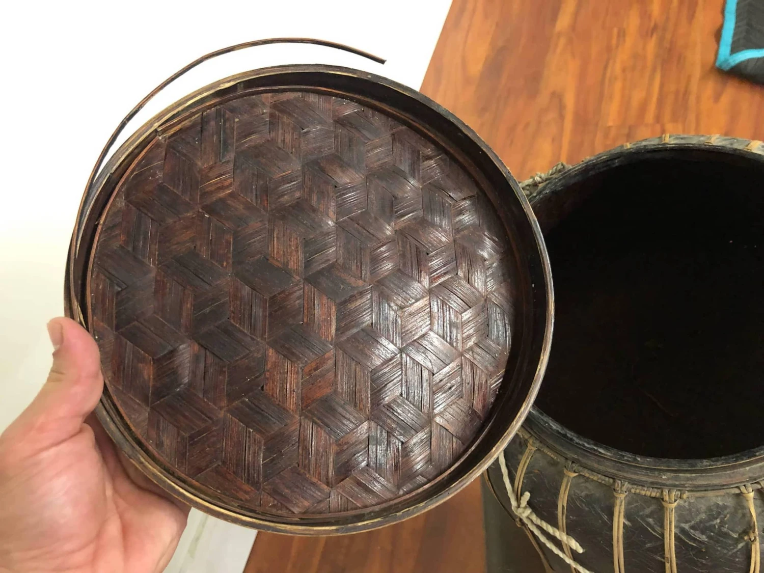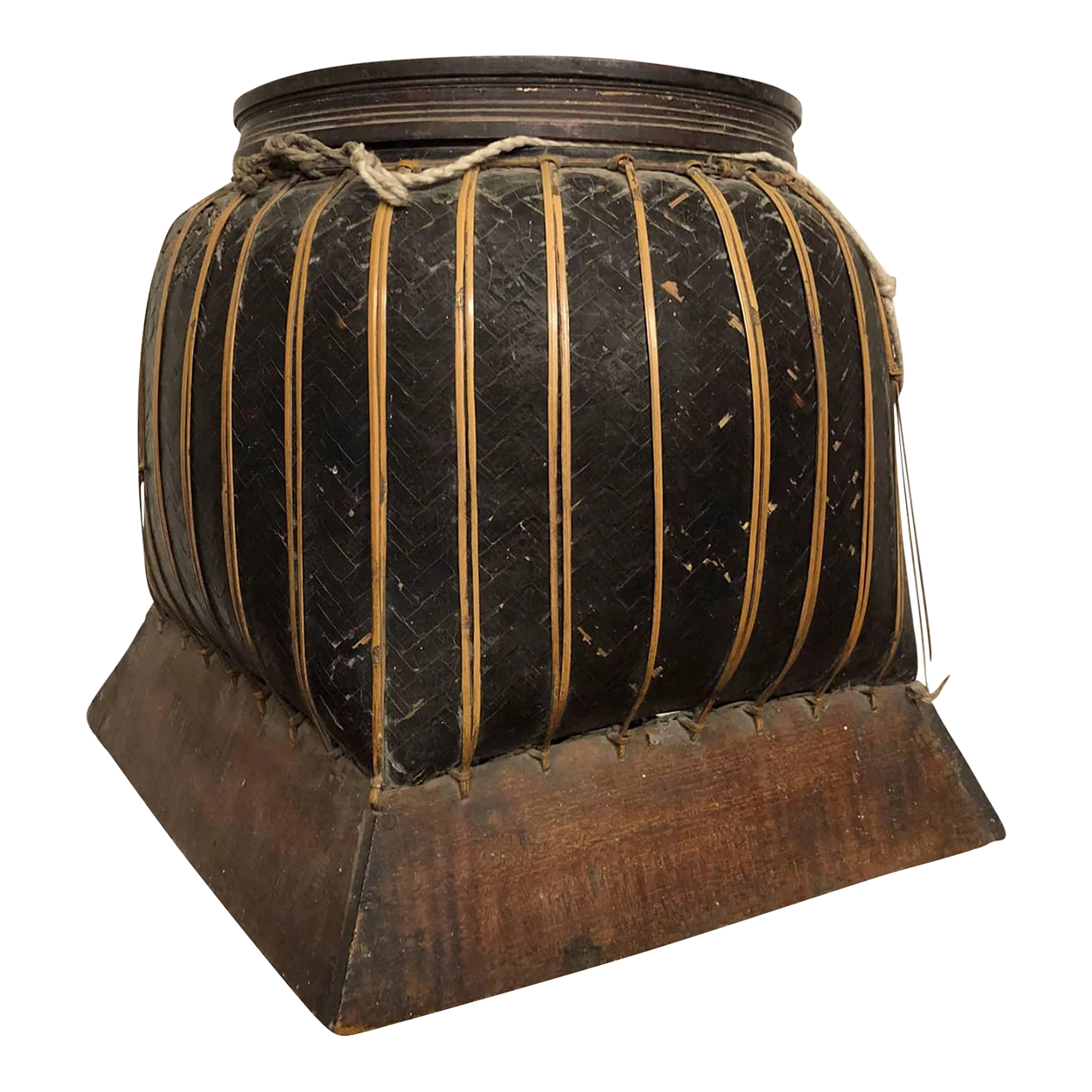 Antique Burmese rice basket with wooden base and a large opening at the top with a lid. The basket is …