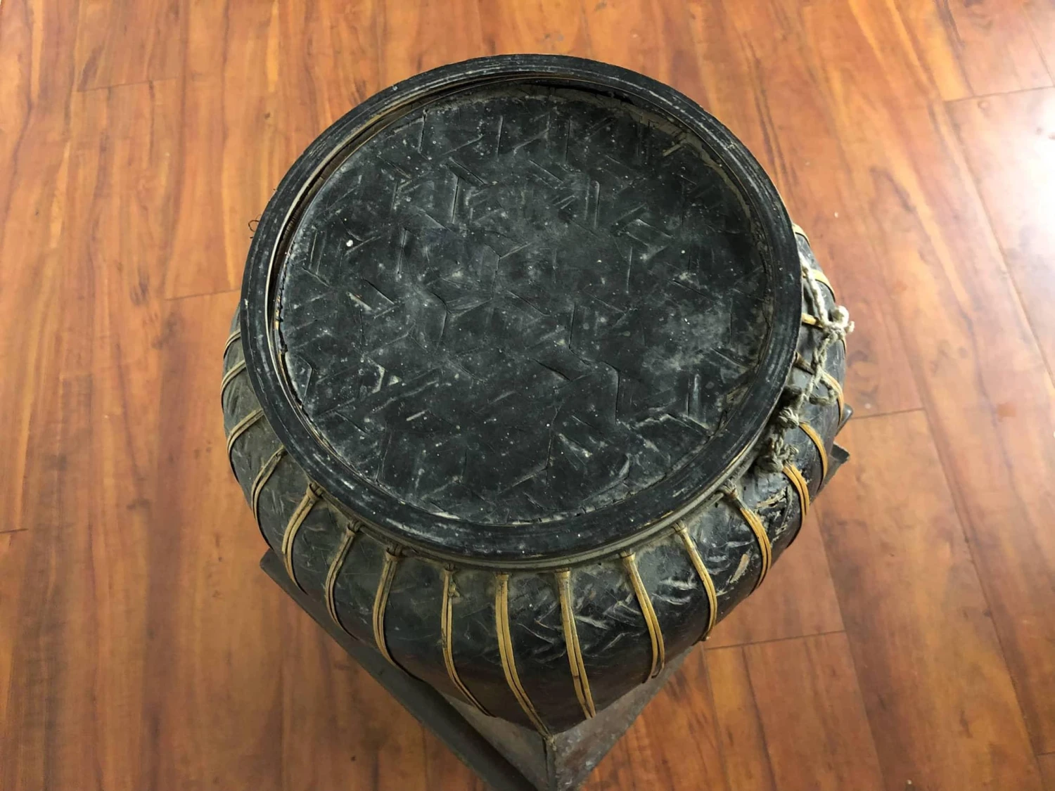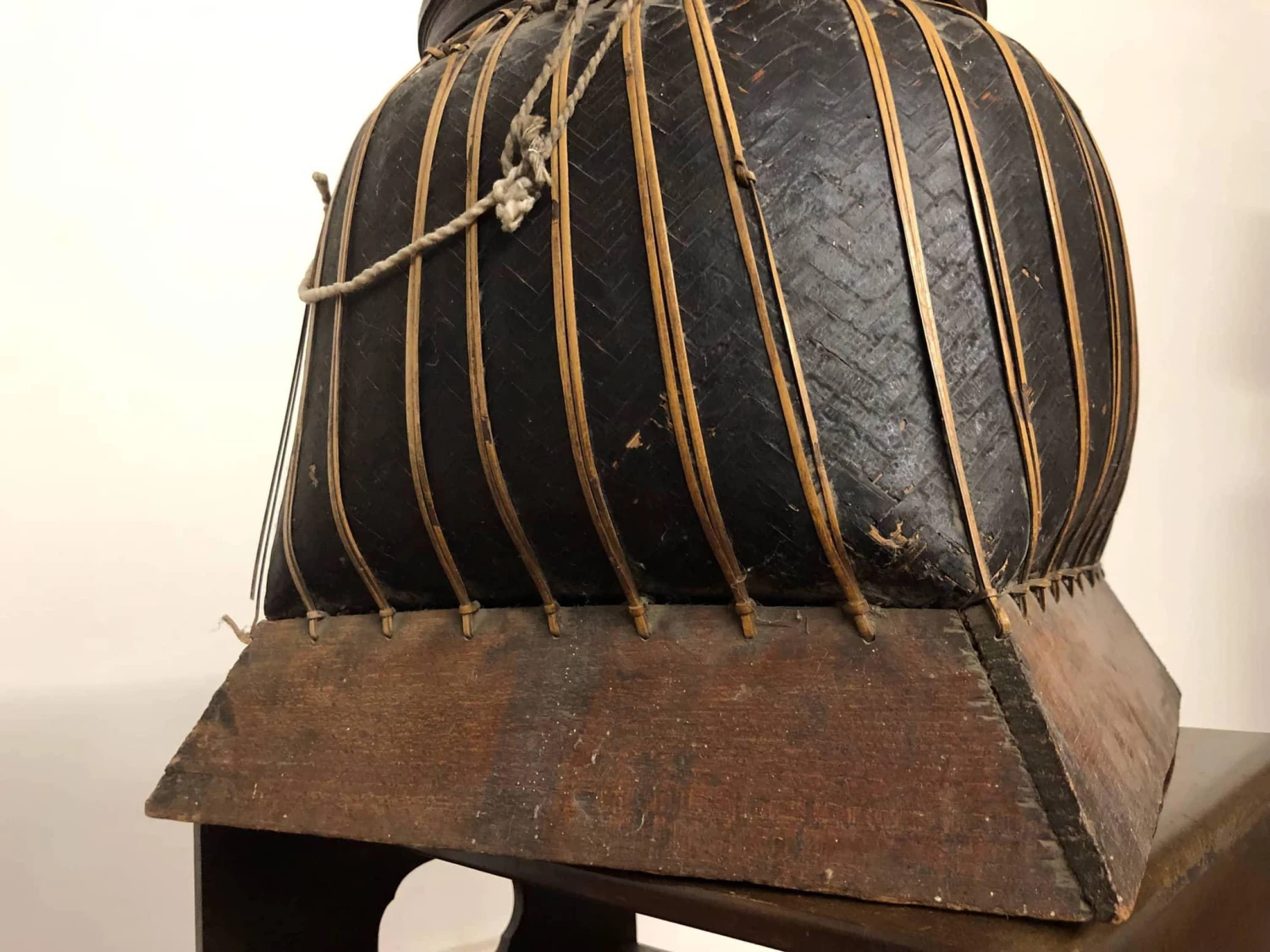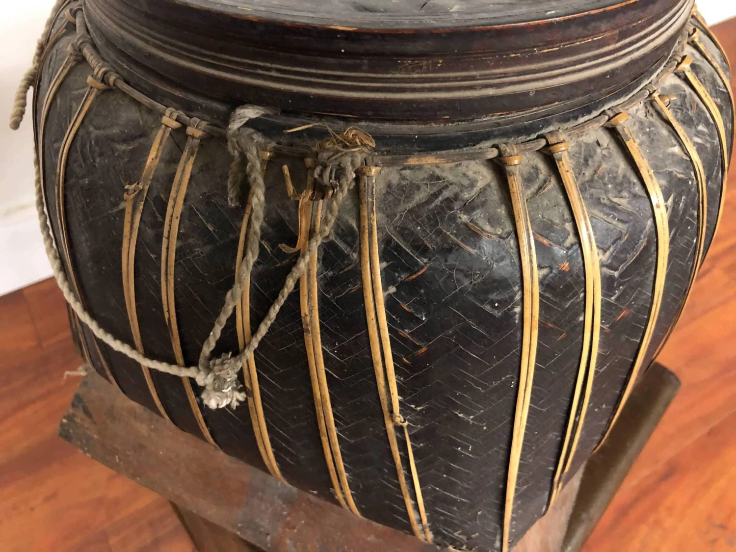 Antique Burmese rice basket with wooden base and a large opening at the top with a lid. The basket is woven and seems to be lacquered in black. It has vertical pieces of rattan, or some other natural grass or palm, that attach the wood base to the top of the basket.
