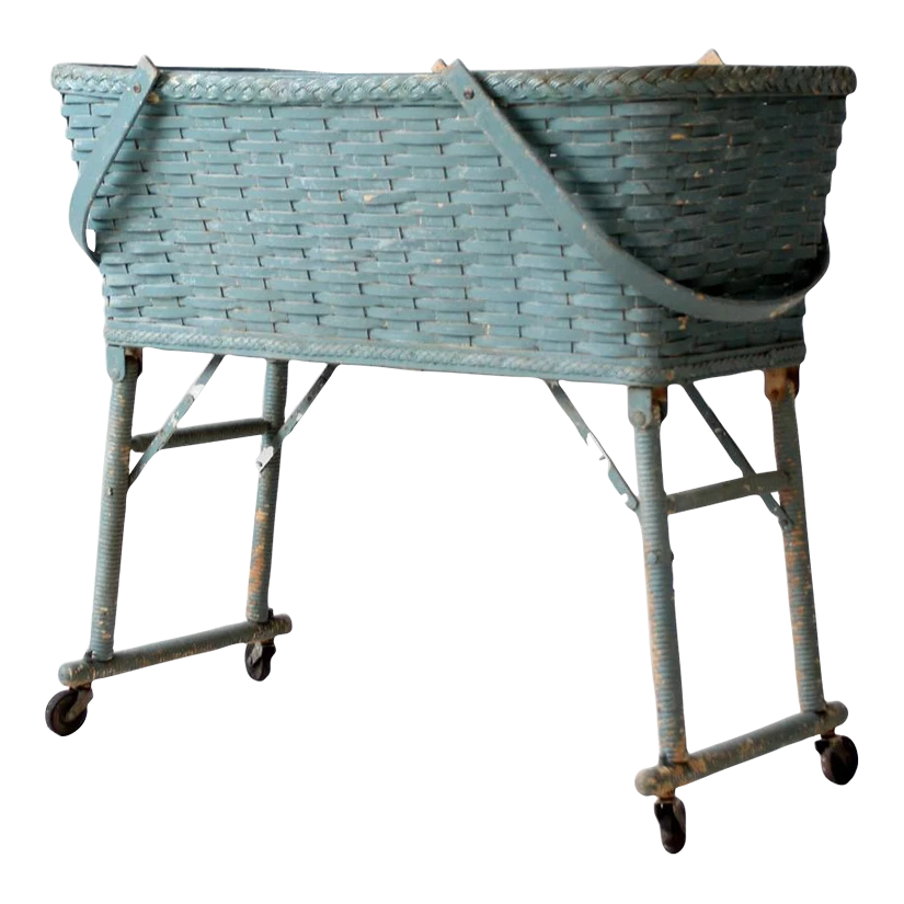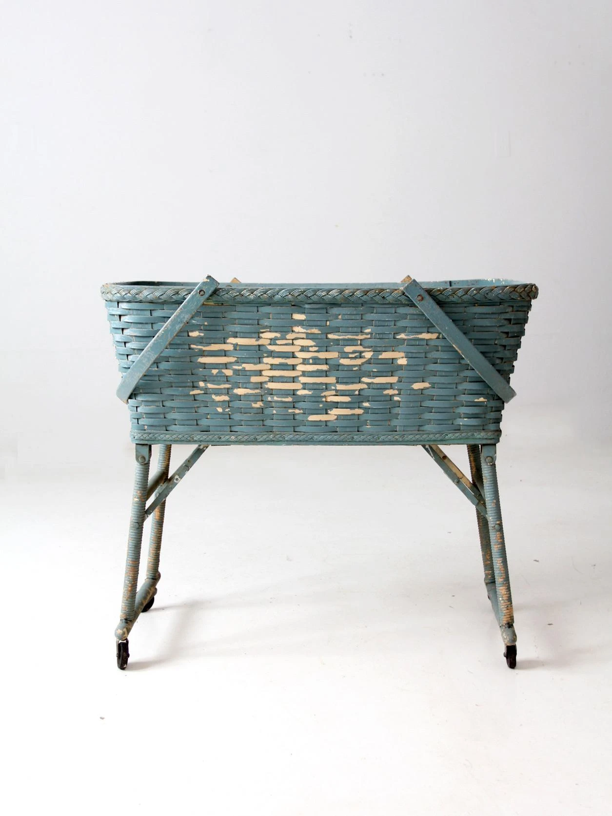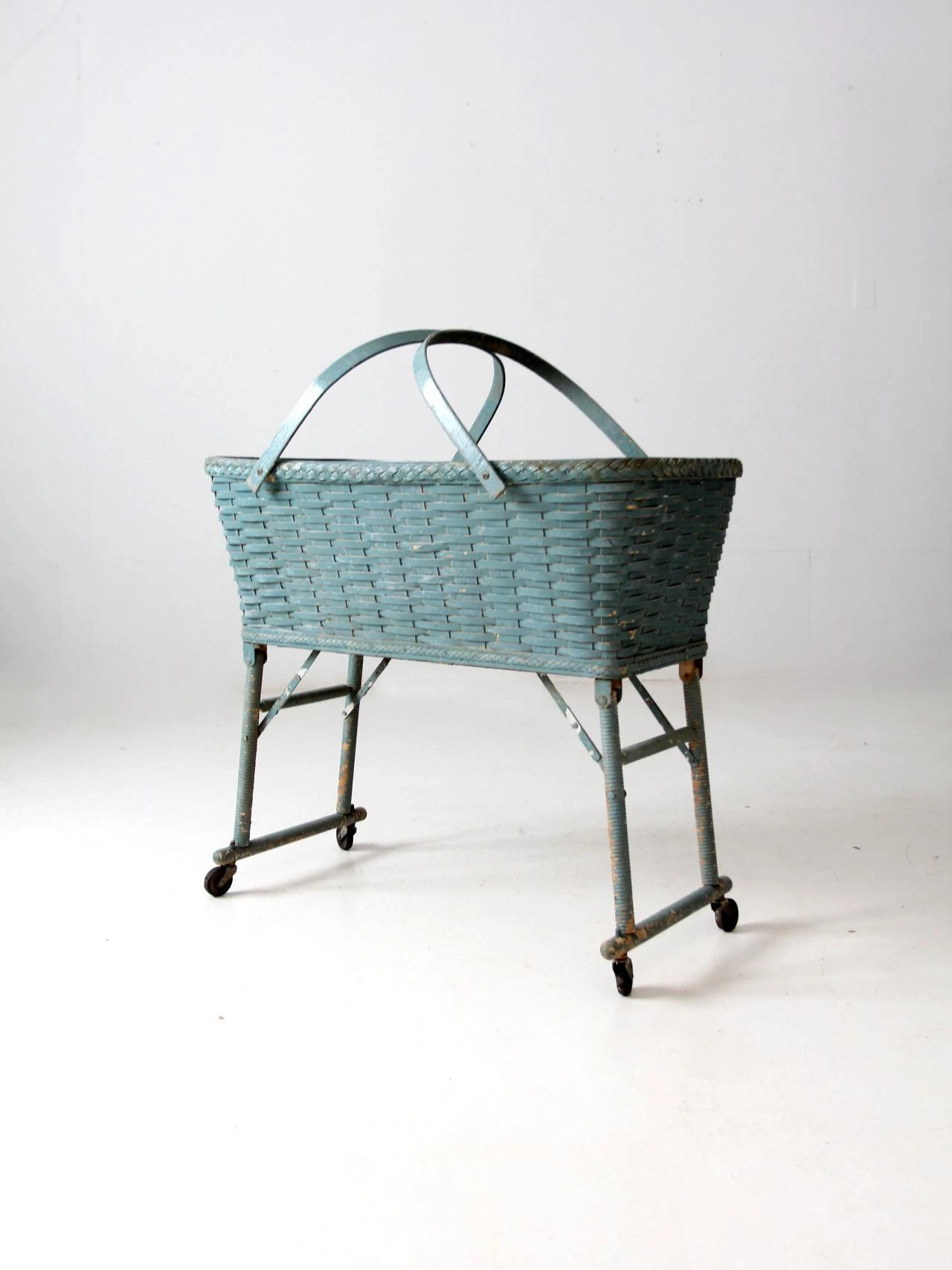 This is an antique woven basket with legs. The blue standing basket features wooden handles and casters on its legs. …