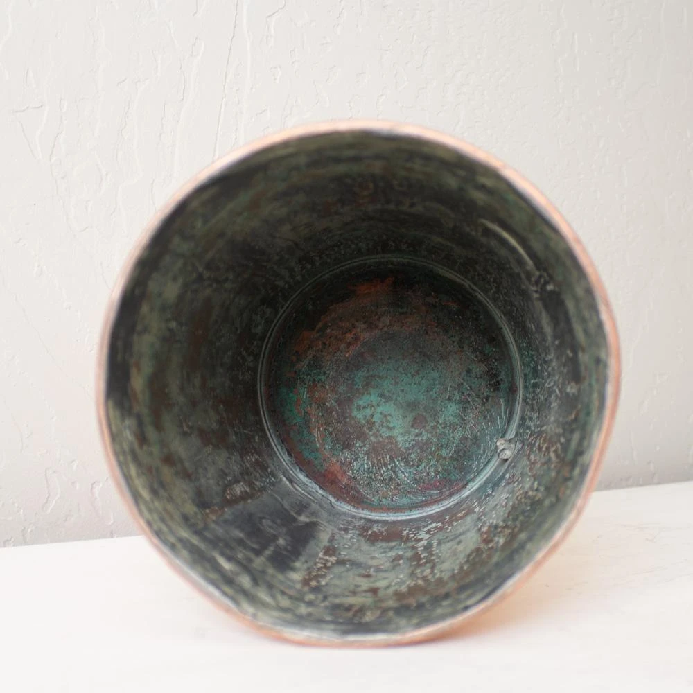 Good vintage condition. The item is solid and sturdy, with a few shallow dents and small spots down one side, typical of age and materials. All flaws are visible in the photos. The outside has been freshly polished. The inside has been clear-sealed, so the natural green and white patina remains visible, but it will not rub off on anything that is stored inside the canister.