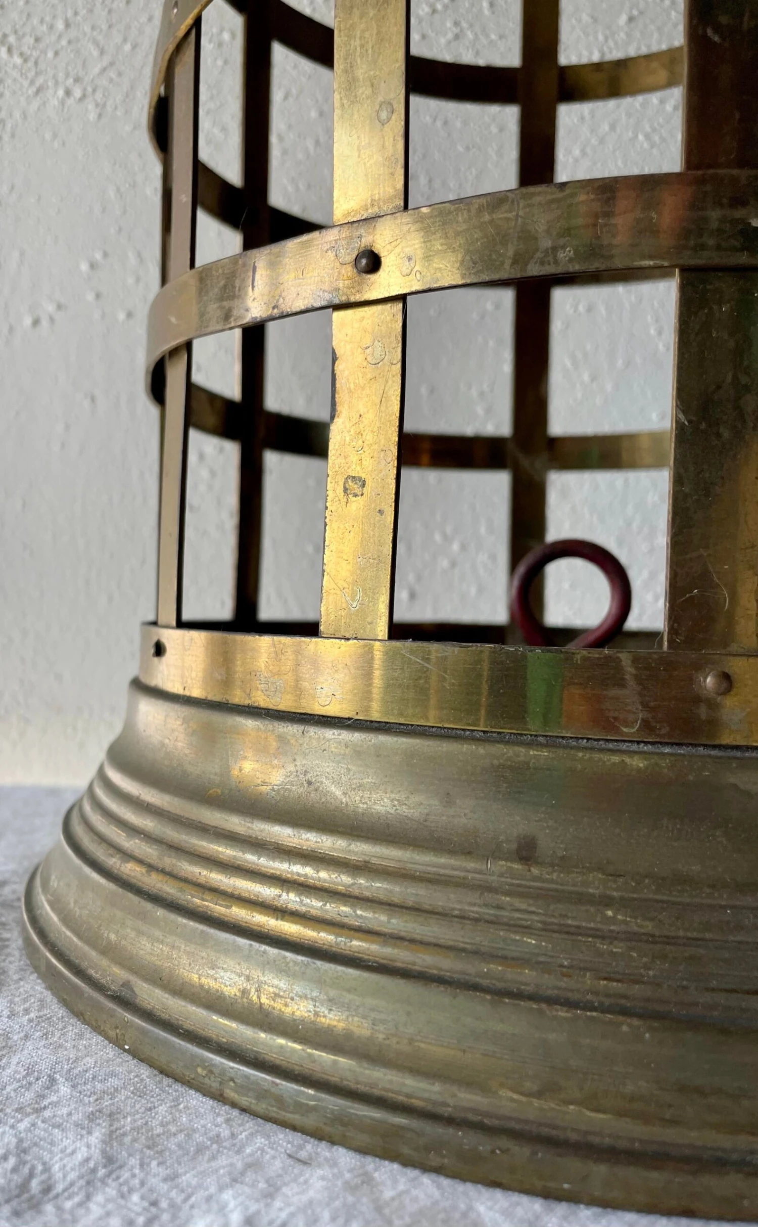 A wonderful brass umbrella stand with heavy steel base and removable water pan. The brass is tarnished and marked consistent …