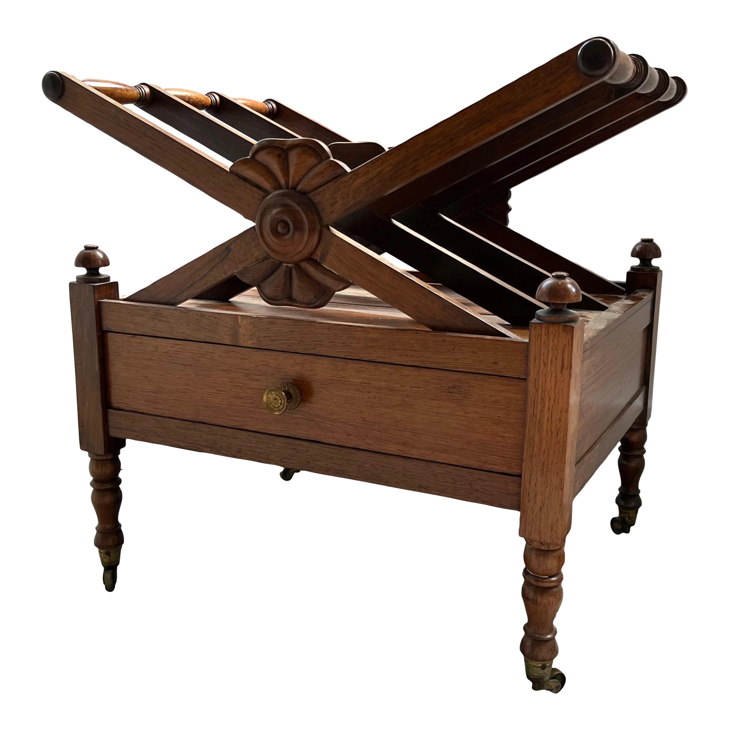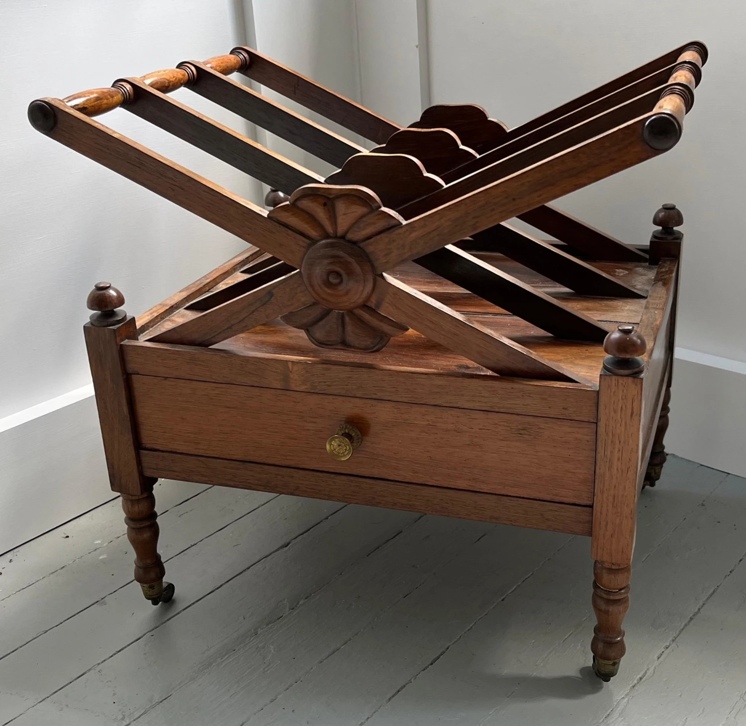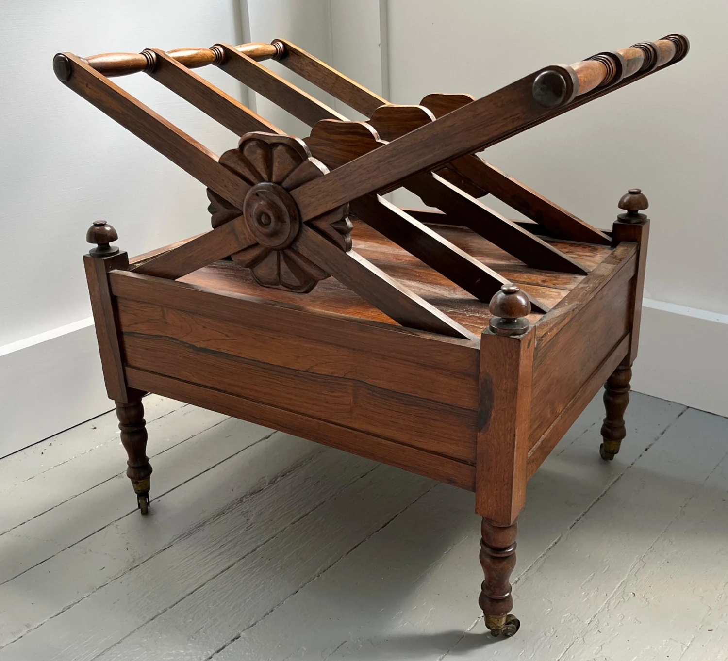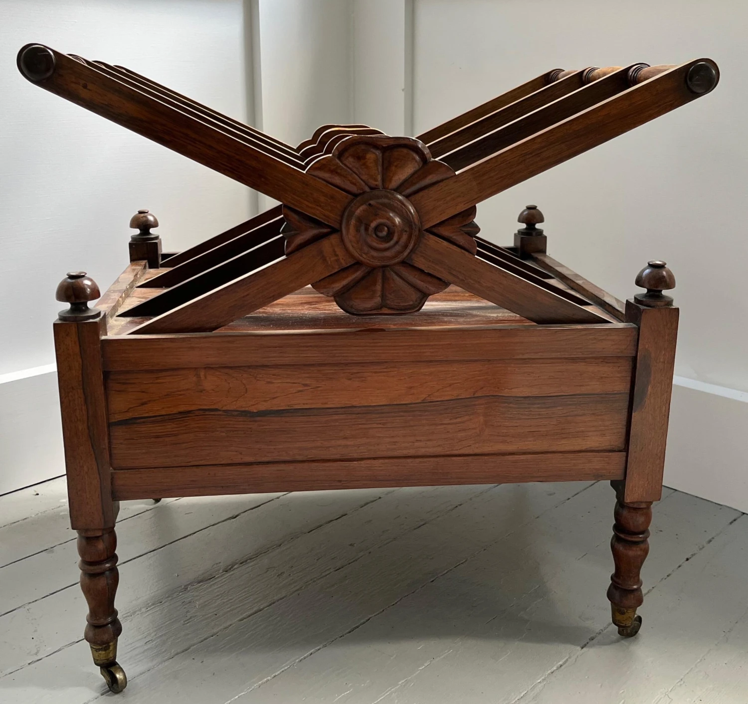 Antique early 19th century English Regency rosewood x-form canterbury for books and magazines. Rising on casters with a single drawer …