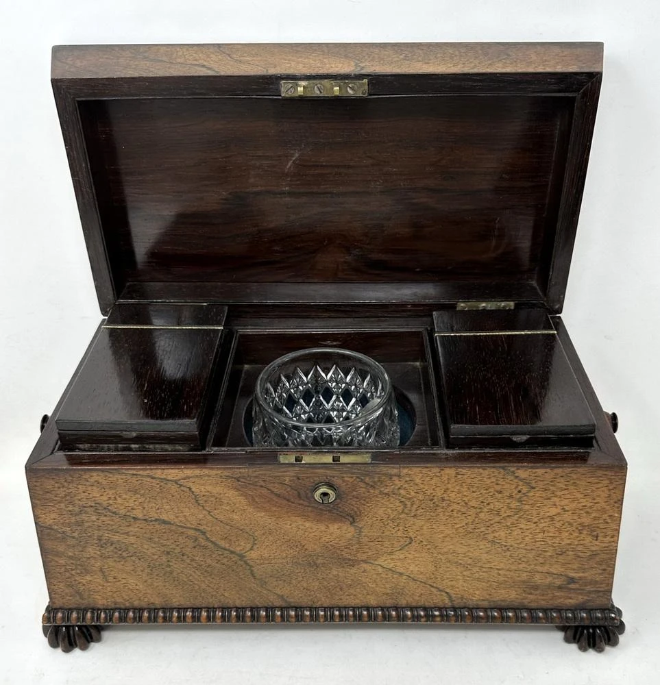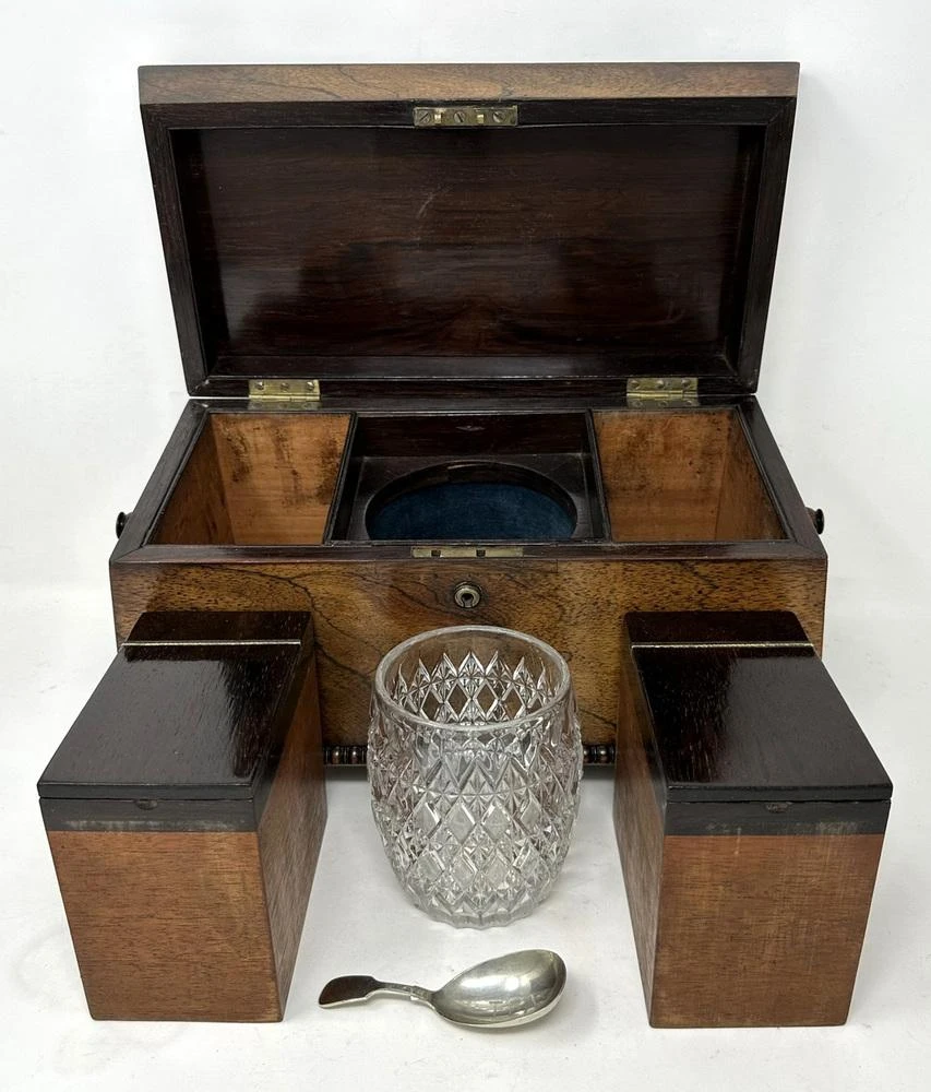 A Superb Example of an English Late Regency Period Well Grained Rosewood Double Interior Section Tea Caddy of Rectangular outline and outstanding quality and generous proportions, firmly attributed to English Furniture makers Gillows of Lancaster, complete with its untouched original interior and a large hand cut led crystal mixing bowl.