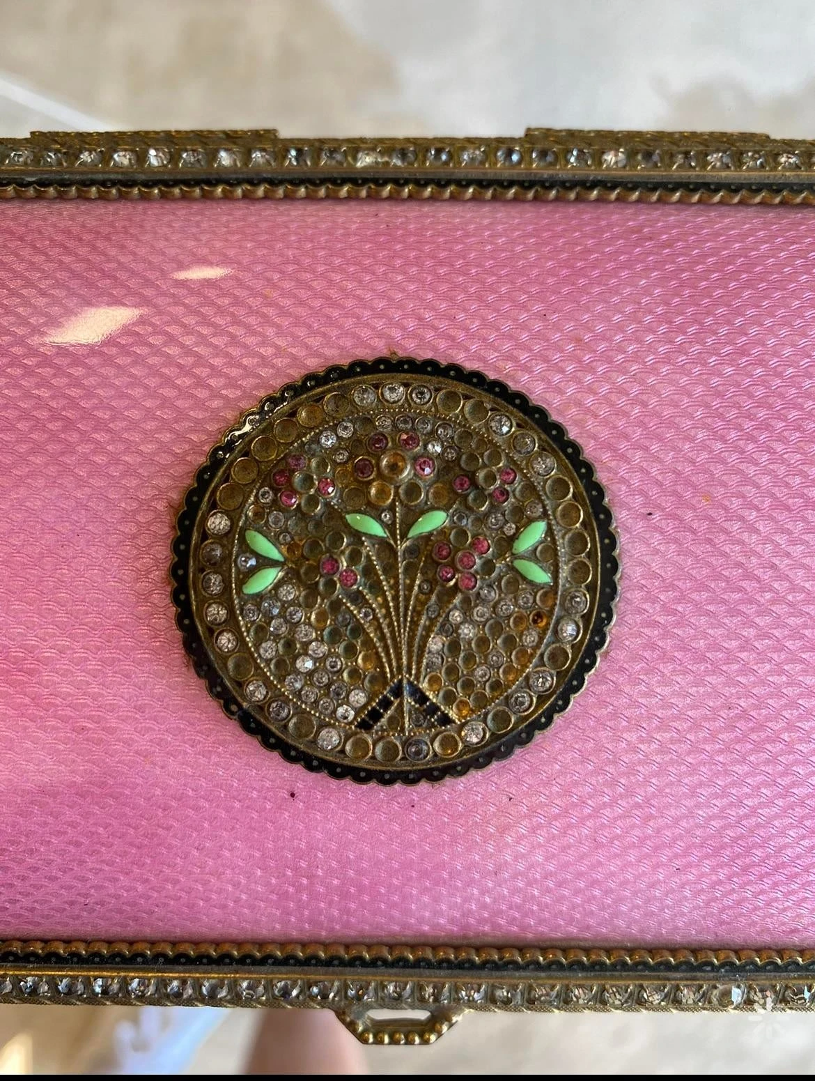 A beautiful Antique French Pink Enamel Guilloche Dresser Box W/ Semi Precious Stones. Hinged box with velvet interior and resting …