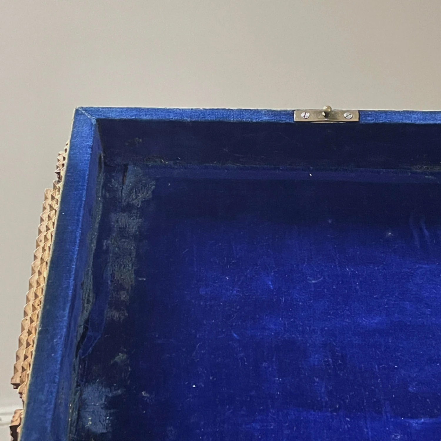 Wear is present in the velvet interior. Please refer to pictures for details. Overall very good condition, sturdy and stable. Missing half of one of the chip-carved strips on the top backend of the lid and a partial loss of one foot on the back side, not visible from the front and it still sits flat. Hinges are in very good condition, well attached and operating smoothly.