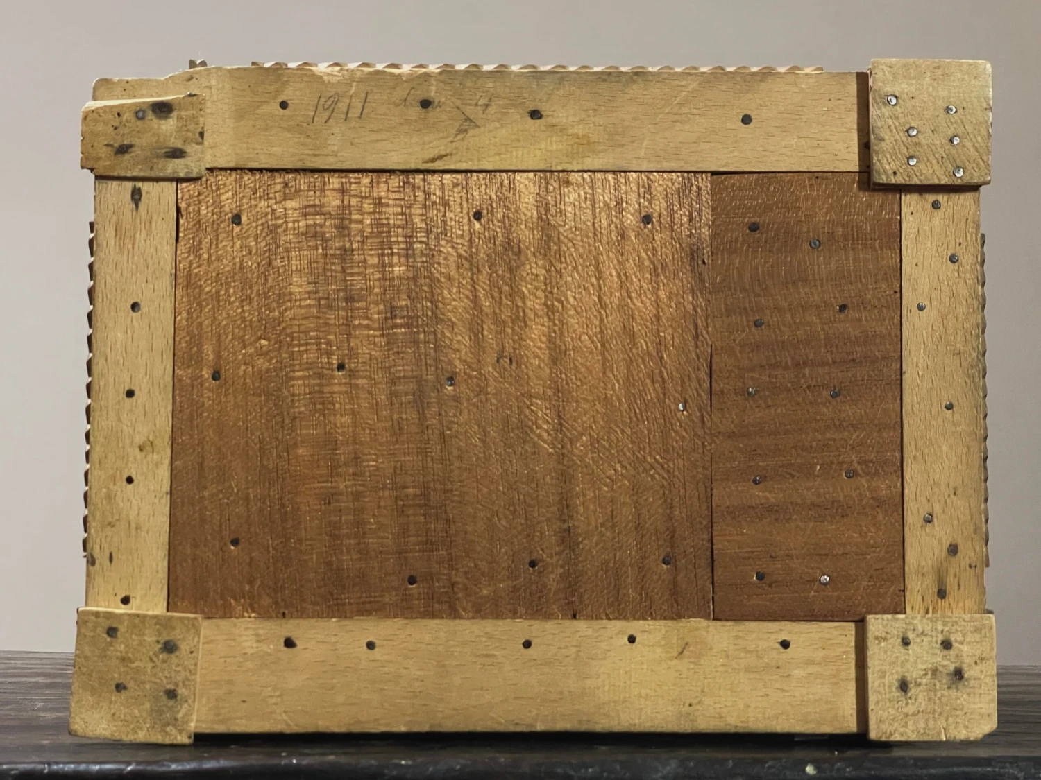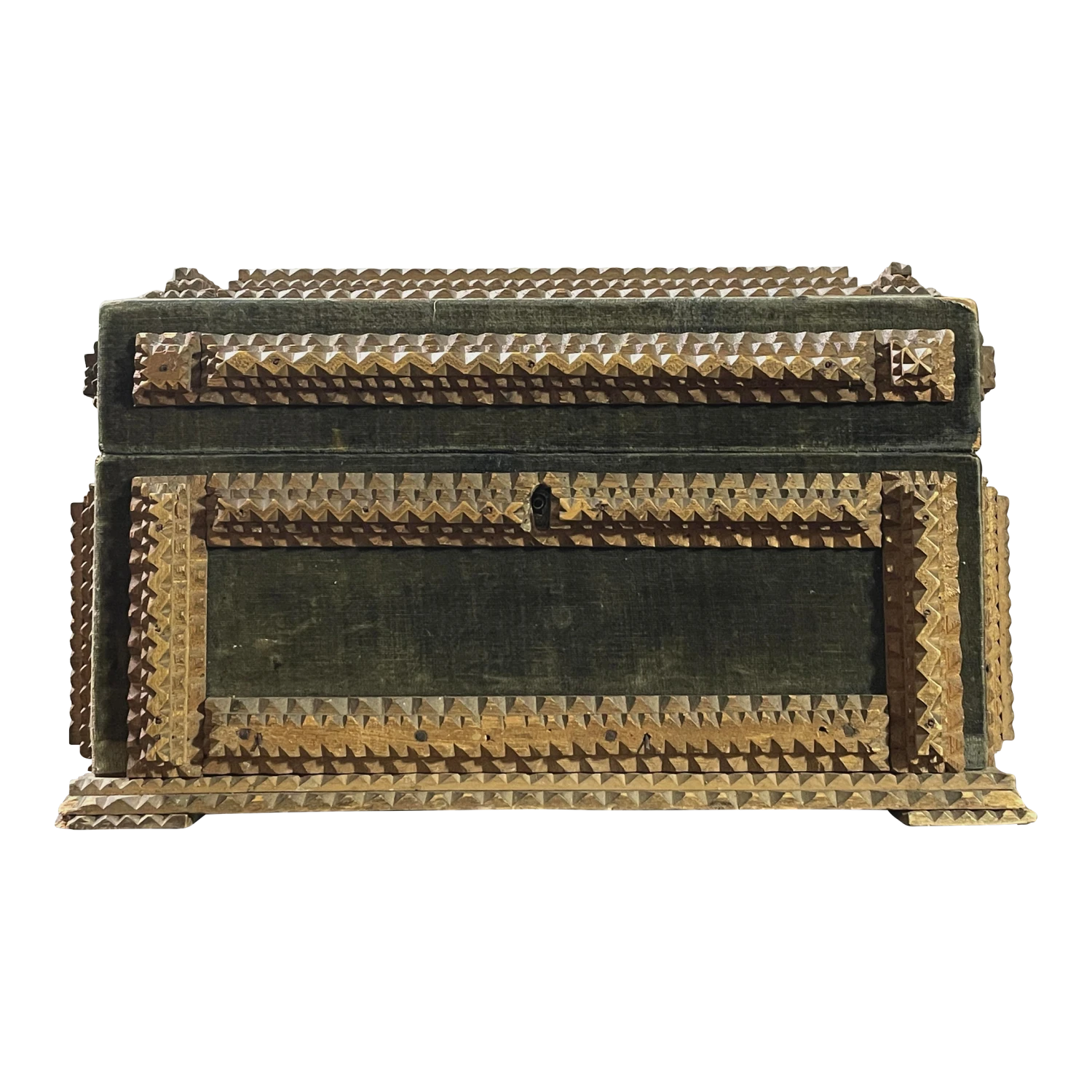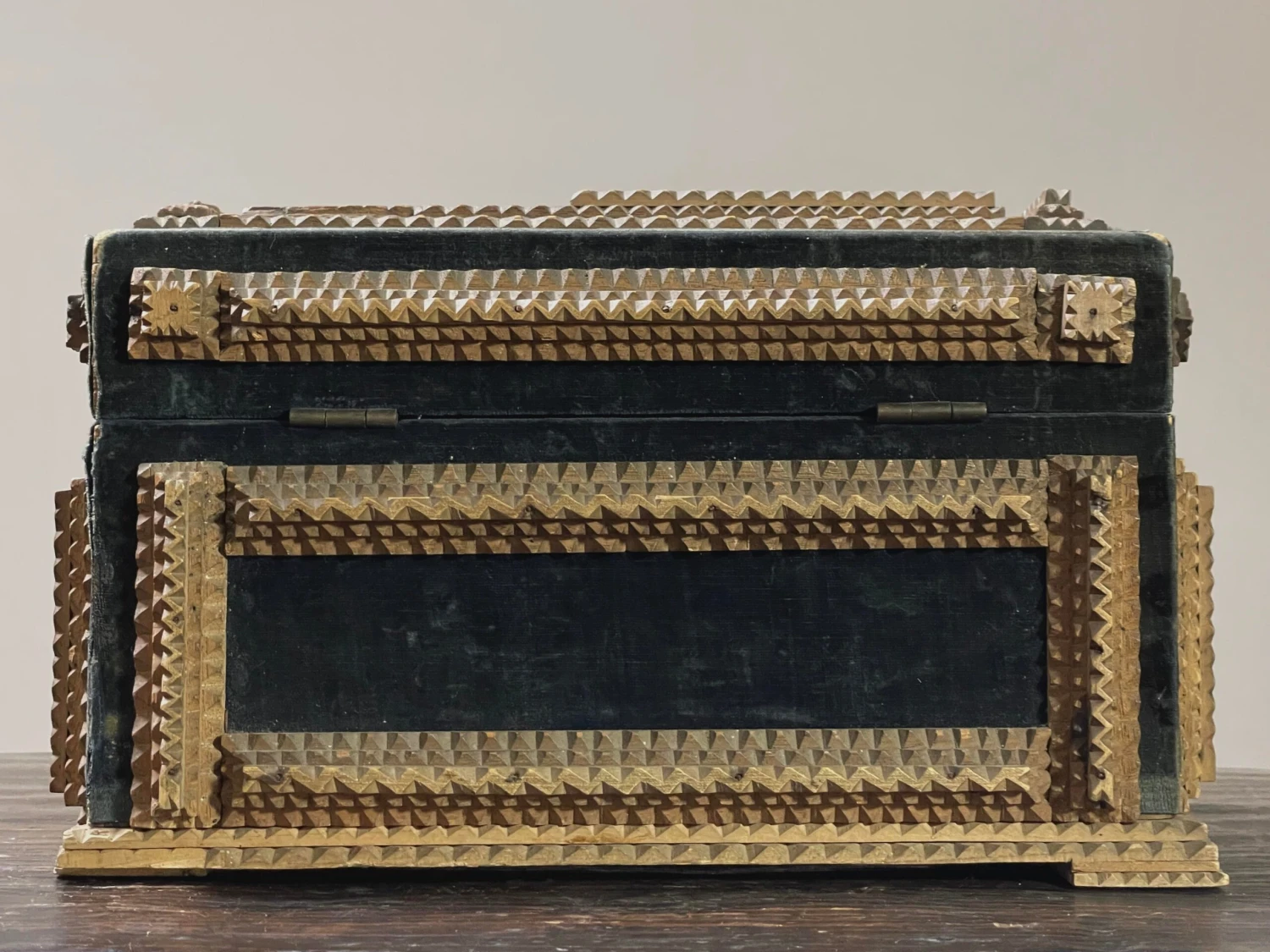 Antique Green Velvet Chip Carved Tramp Art Box (1911). Dated in pencil on the bottom ‘1911’. Grey green tramp art …