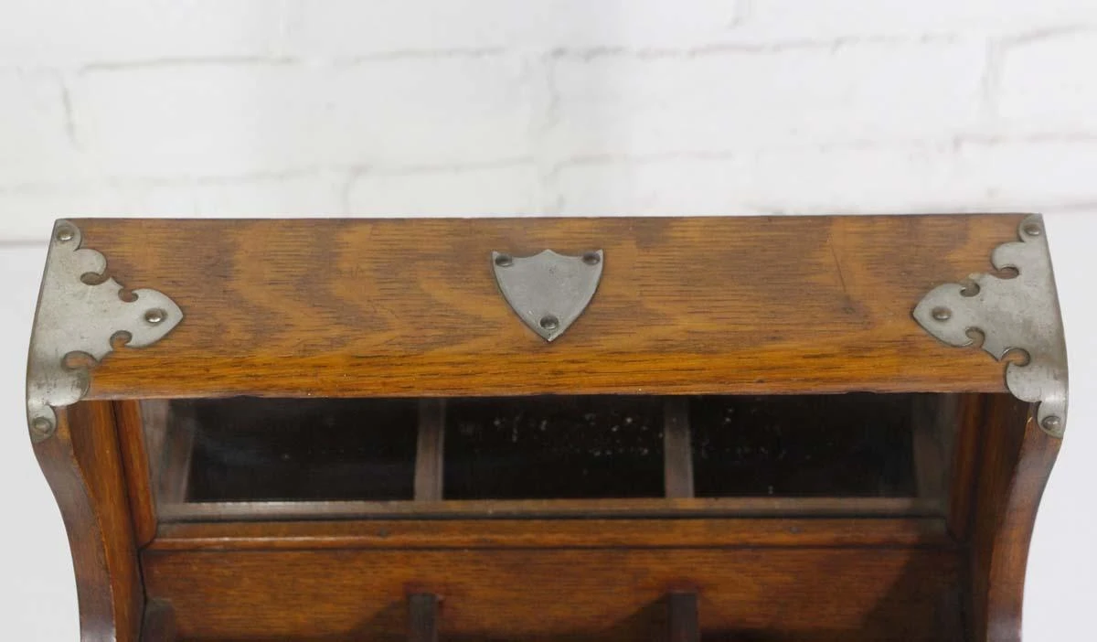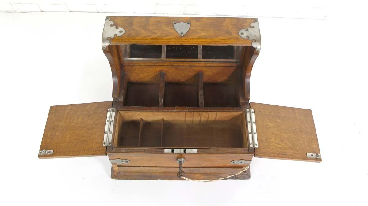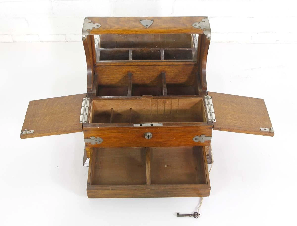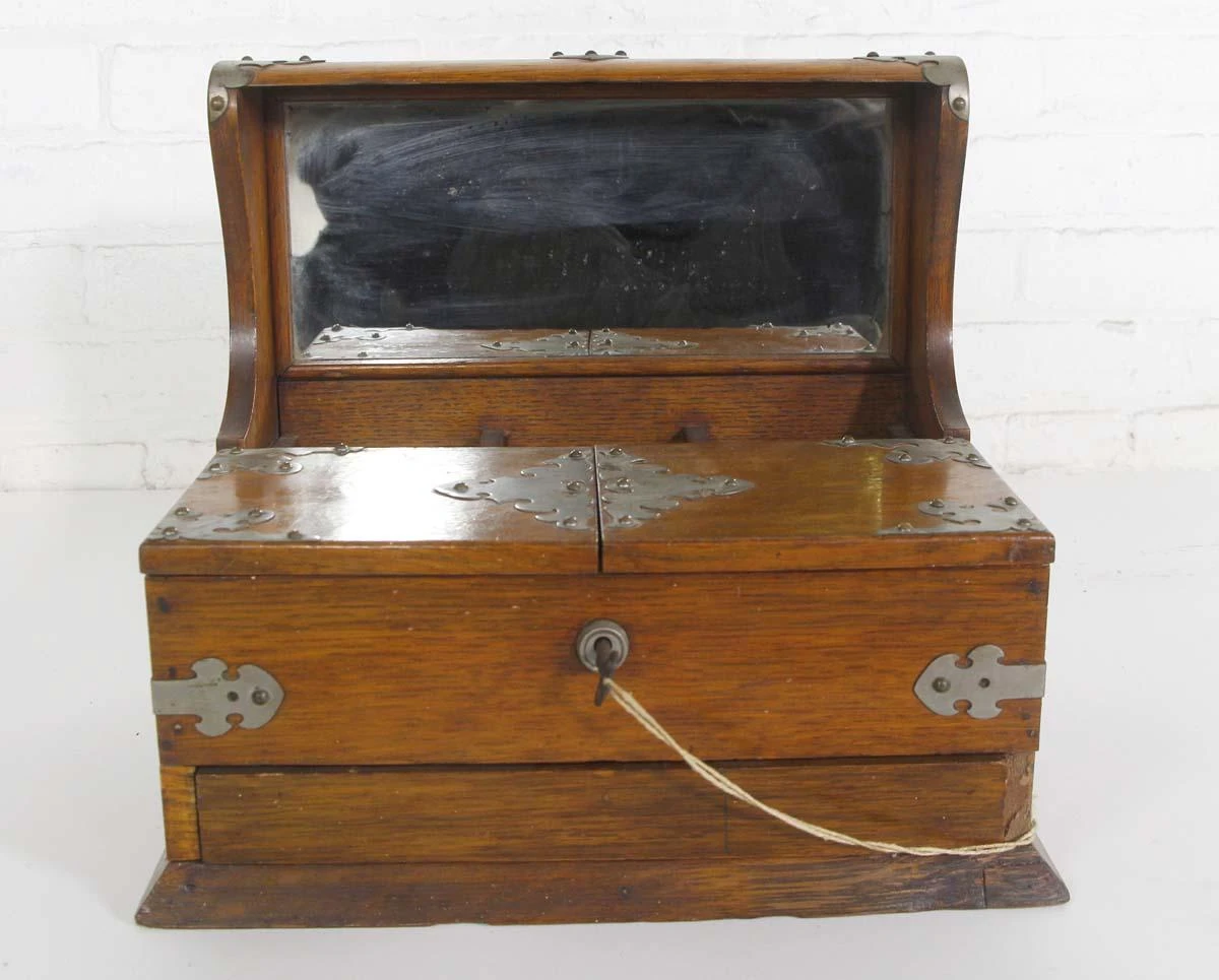This handcrafted Arts & Crafts quarter sawn oak jewelry box is very unusual! It features a mirrored top that does not shut, two flap doors that reveal interior storage, and most interesting of all is the center wooden “button” you press down to open a hidden bottom drawer if you look carefully. The box has nice nickel hardware and handles on each side.