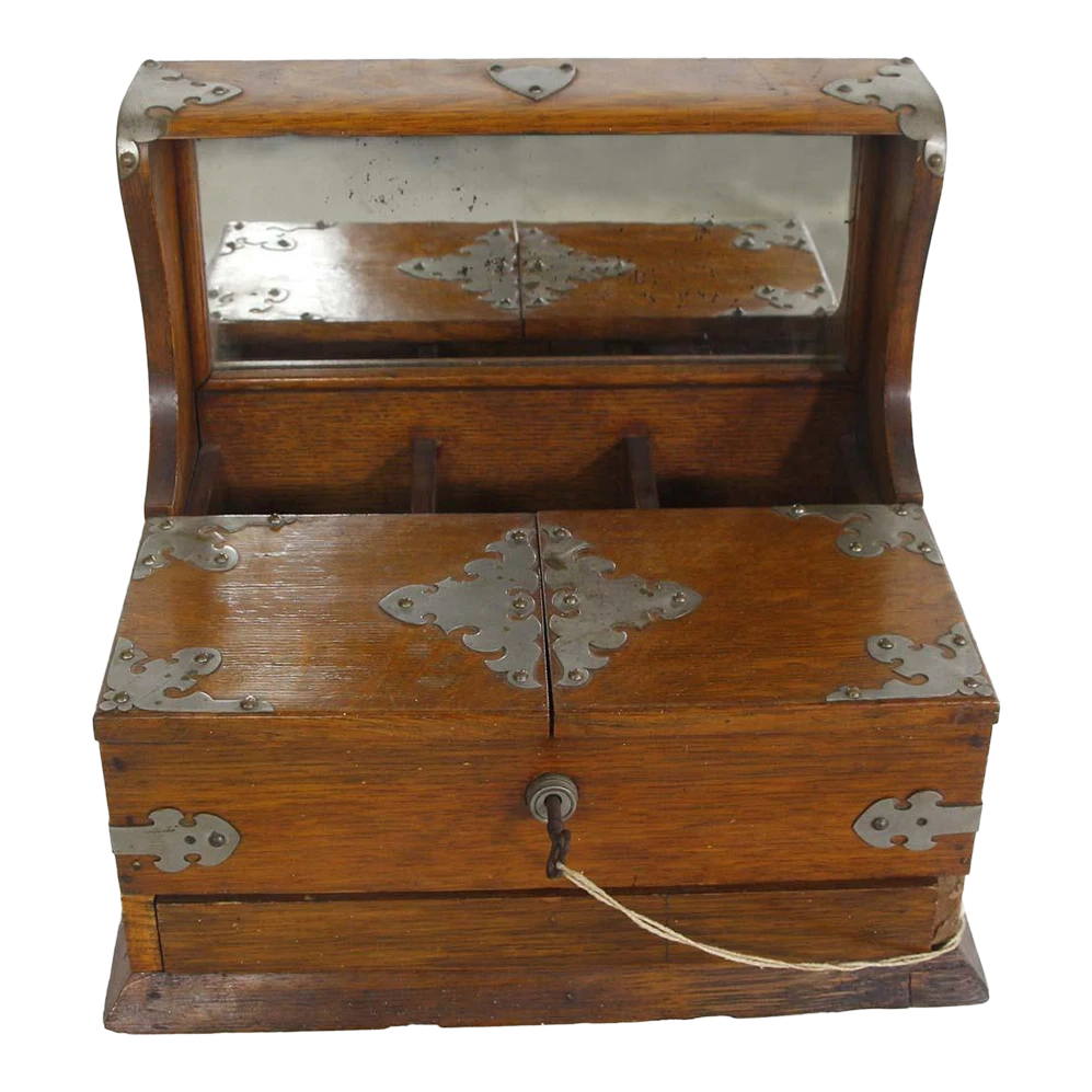 This handcrafted Arts & Crafts quarter sawn oak jewelry box is very unusual! It features a mirrored top that does …
