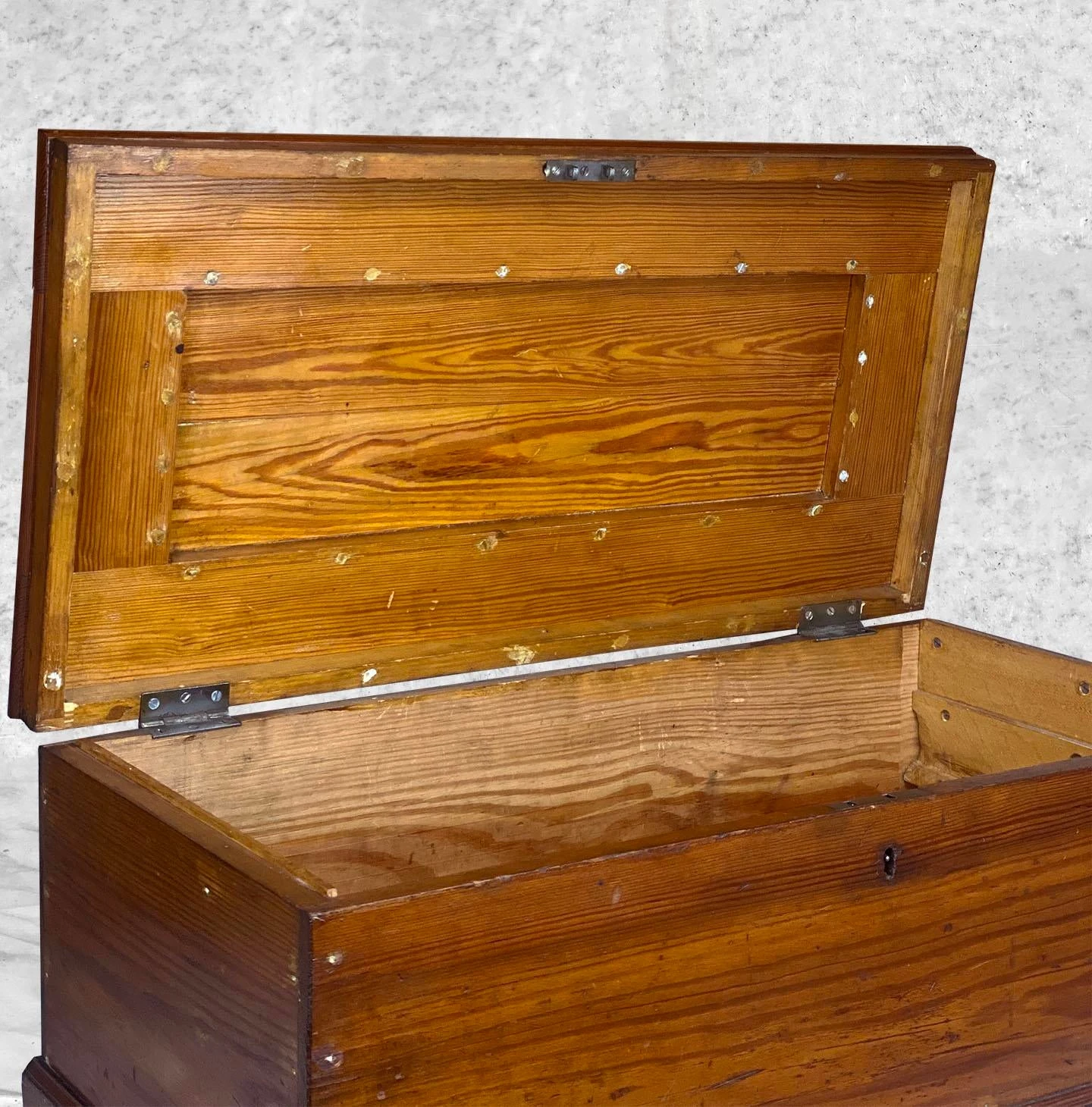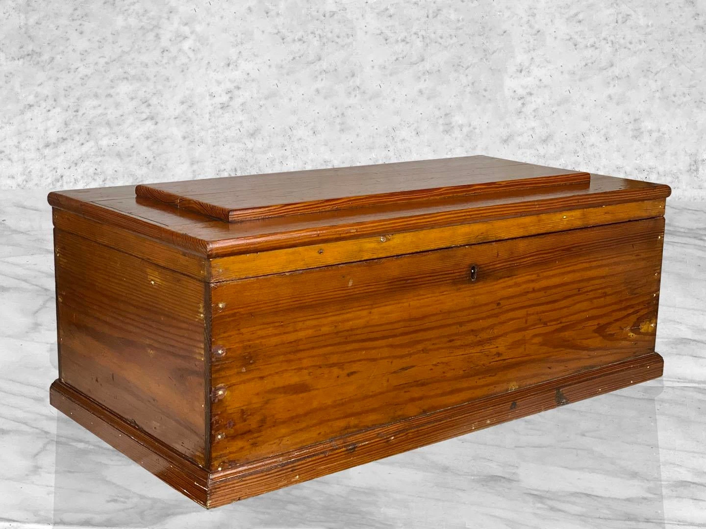 This Pine Machinist Chest was exceptionally well made, it’s solid, sturdy and quite heavy. Surface scratches, minor chips and finish blemishes are shown from age. The Chest shows nice character and is in overall good condition. There isn’t a key included to lock the top, it remains unlocked.