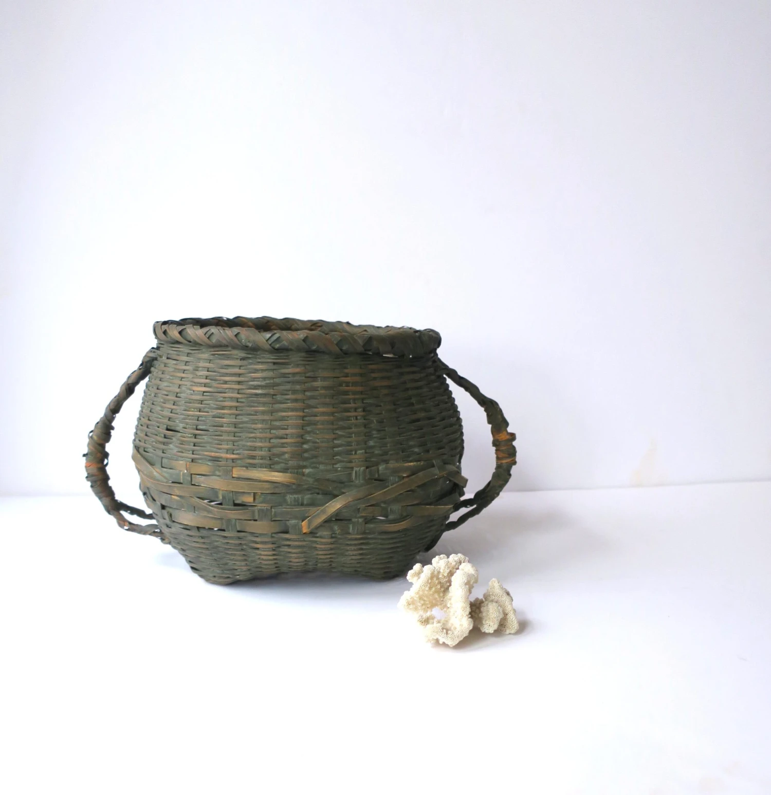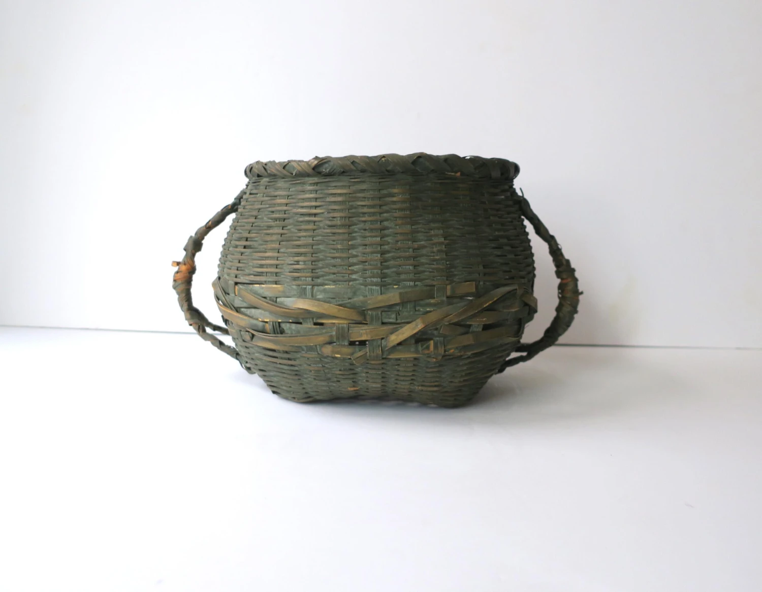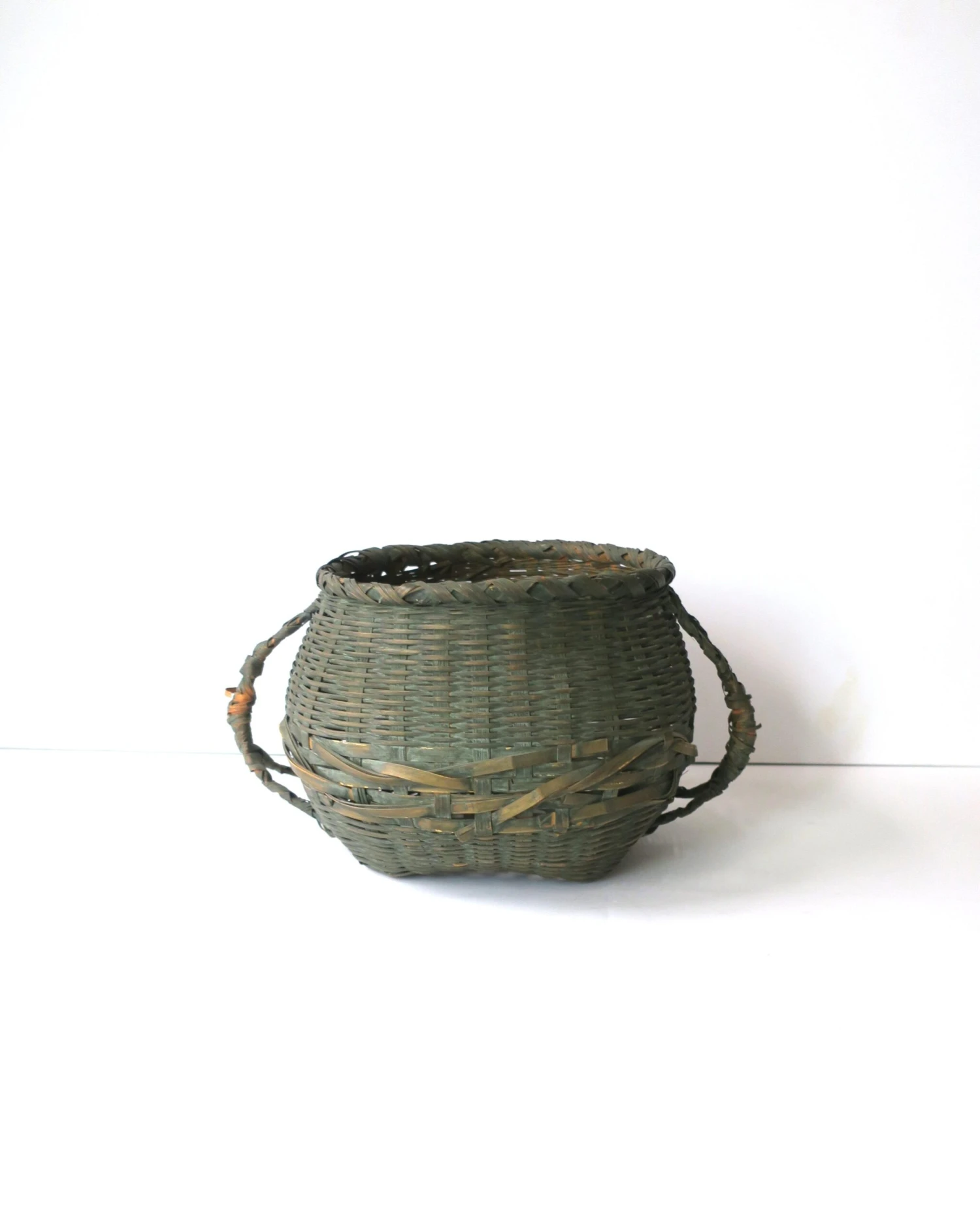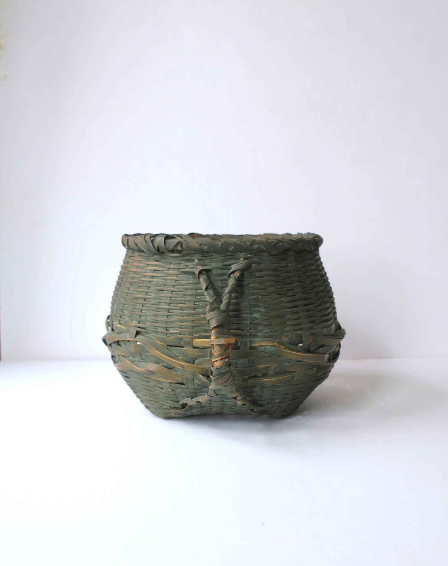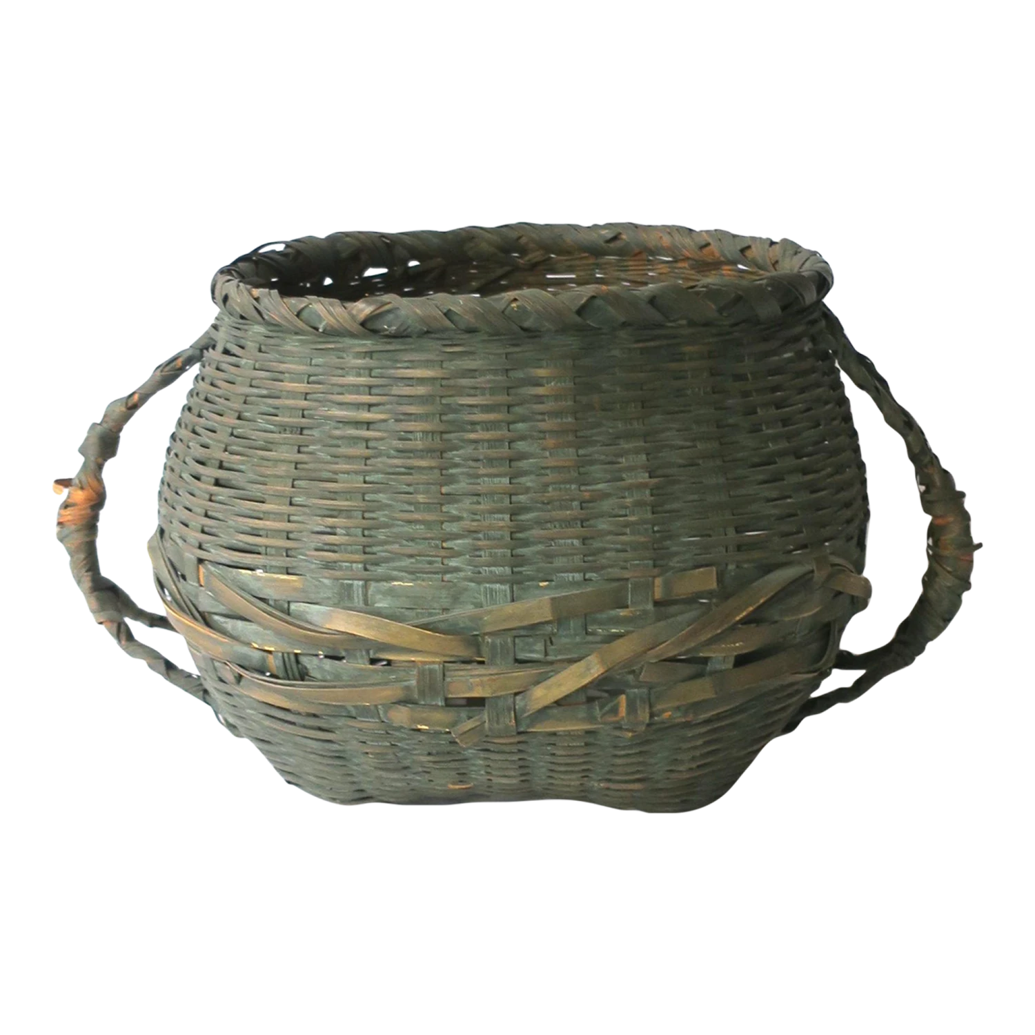 An antique wicker splint green basket with handles, circa early 20th century, USA.