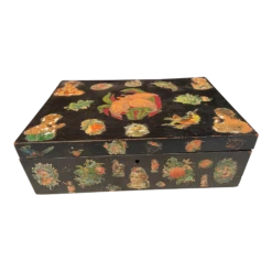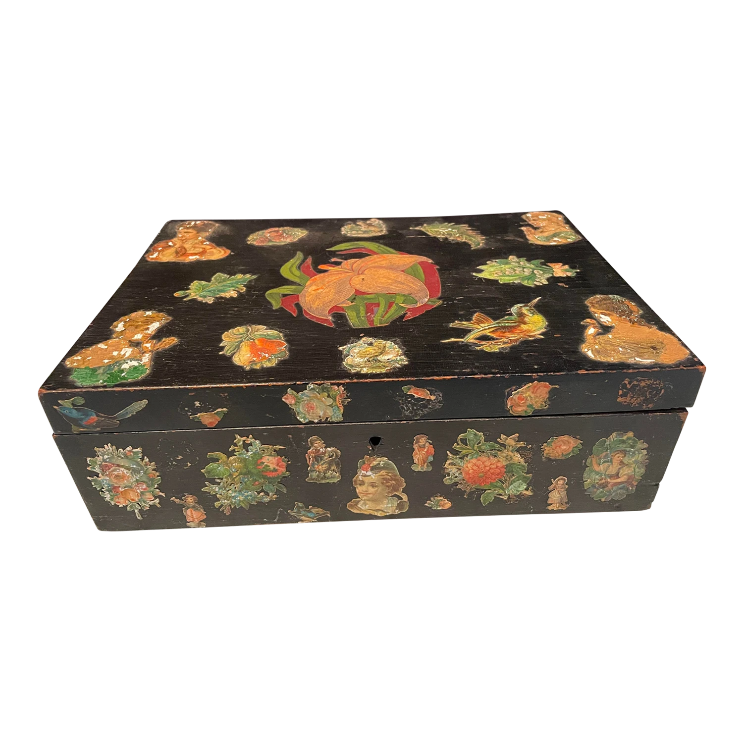 A very sweet antique decoupage box made of wood depicting flowers, women, birds, etc.