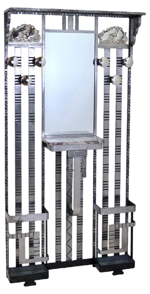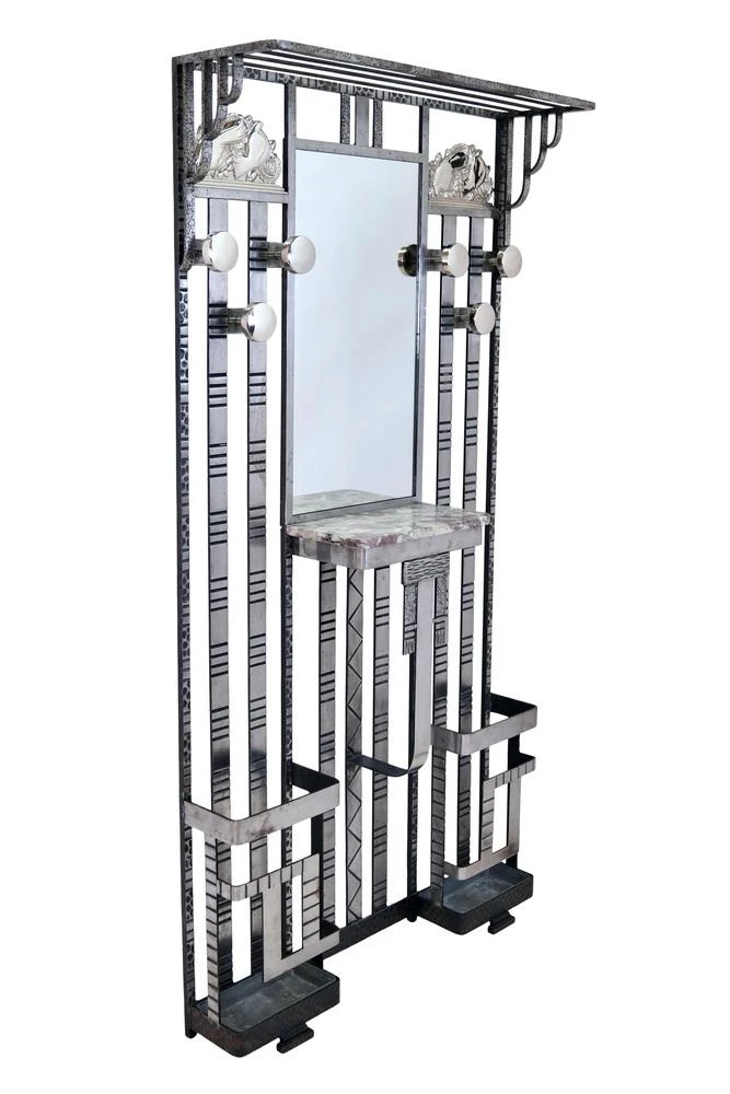 Wardrobe with bird motifs. Wrought iron. High format mirror. Small shelf with marble top. Umbrella stand. Hat rack. Original Art …
