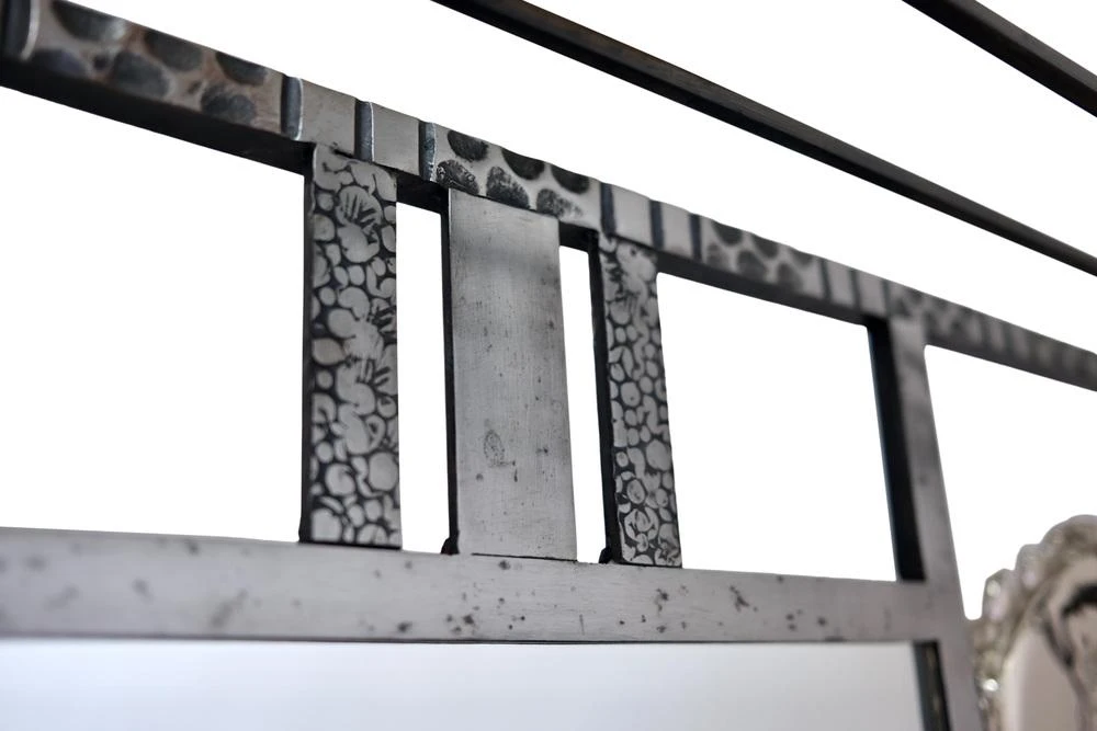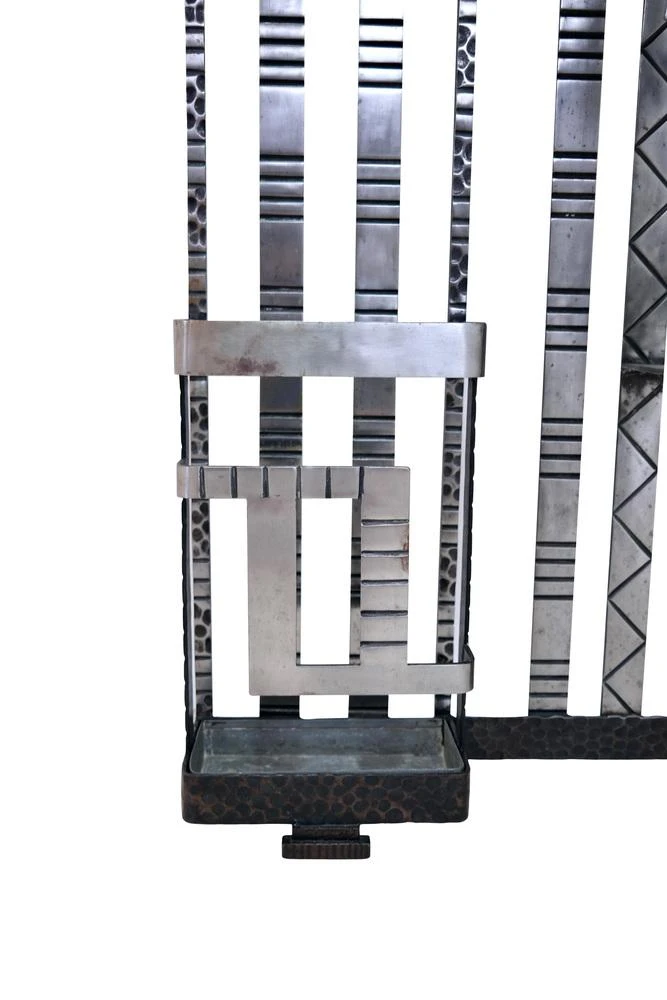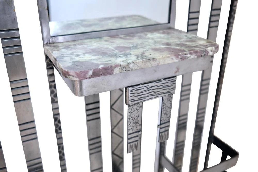 Wardrobe with bird motifs. Wrought iron. High format mirror. Small shelf with marble top. Umbrella stand. Hat rack. Original Art Deco, France. 1920/30s. Dimensions: Width: 95 cm x height: 190 cm x Depth: 28 cm. Refinished. Wear consistent with age and use. Minor fading. Cleaned and polished with protection of the original Patina.