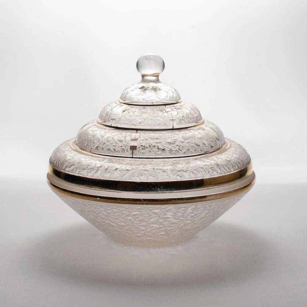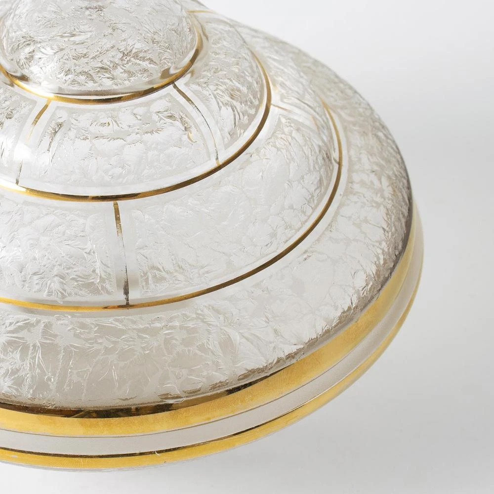 Frosted glass with “dentelle” pattern and partial gilding. Made by De Rupel Boom in 1930s. I have official proof of authenticity such as vintage catalogs,