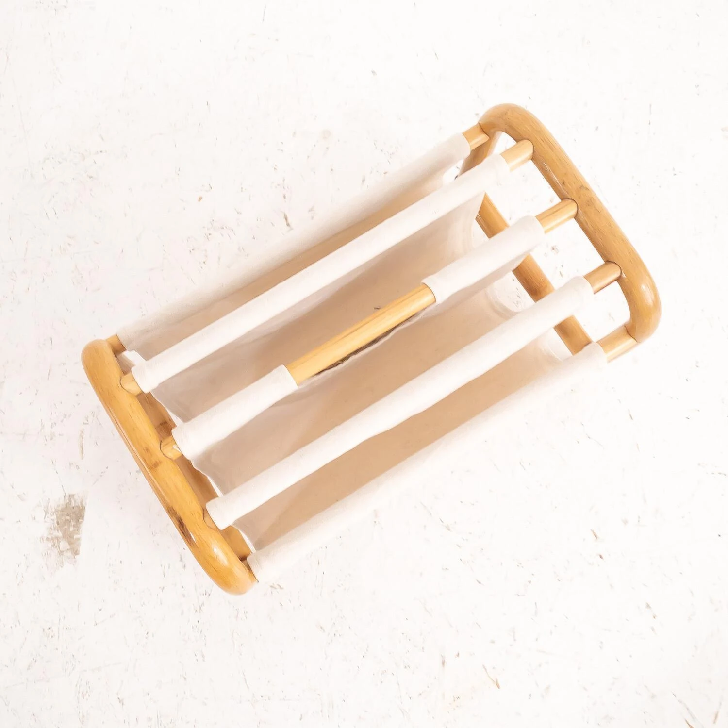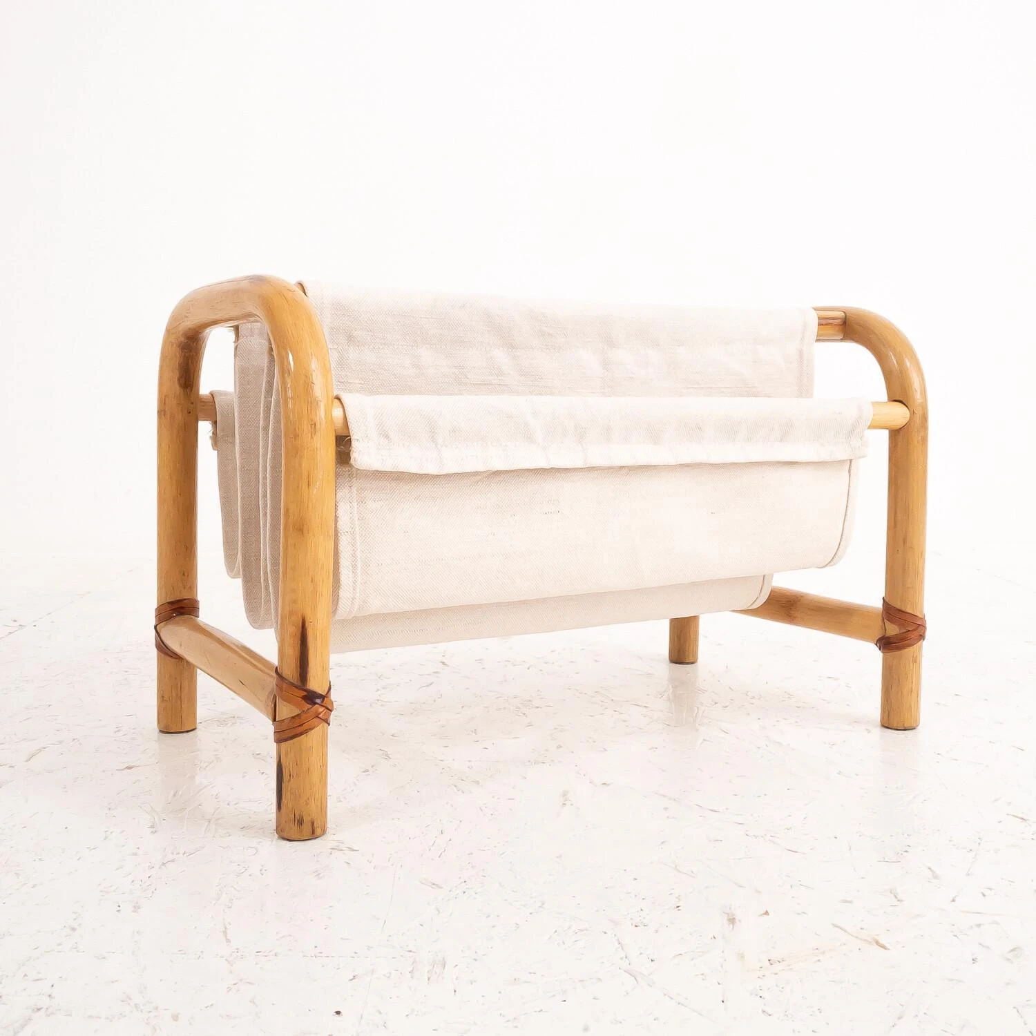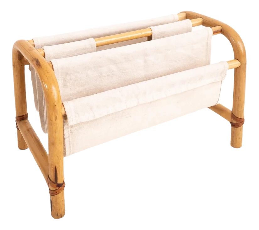 Bamboo magazine rack, made in Italy in the 1970s. The magazine rack has four pockets, is made of ècru color cotton fabric and is easily removable.
