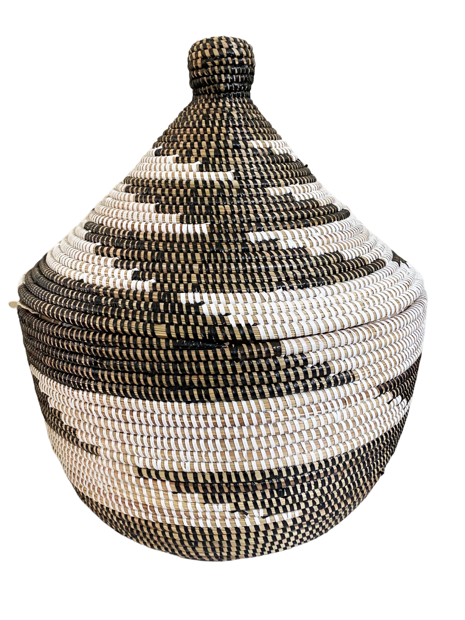 Superb Basket with Lid from Senegal West Africa, could be a laundry hampers and are handwoven by an association of more than 100 rural Wolof women in Senegal Traditional African handmade pieces are not exactly alike. The patterns vary from one piece to the next. They’re great for decoration of your home or makes a wonderful gift for someone special 15″ h by 12.5′ D