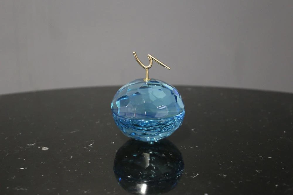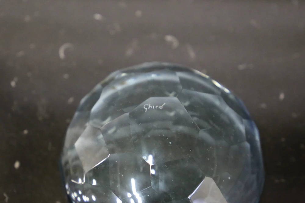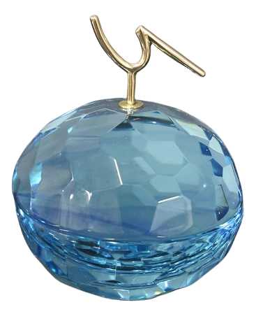 The jewelry box is made of solid glass cut, carved and polished by hand in an elegant covered cup, deep blue color. The pull is cast brass, with the signature of the artist on the underside.