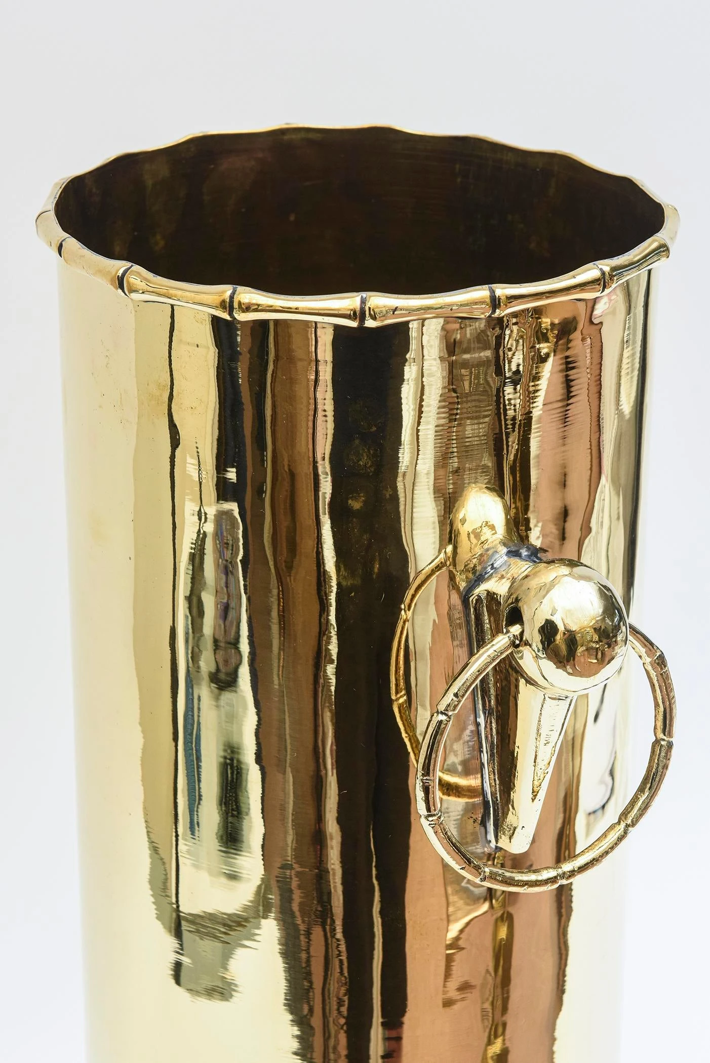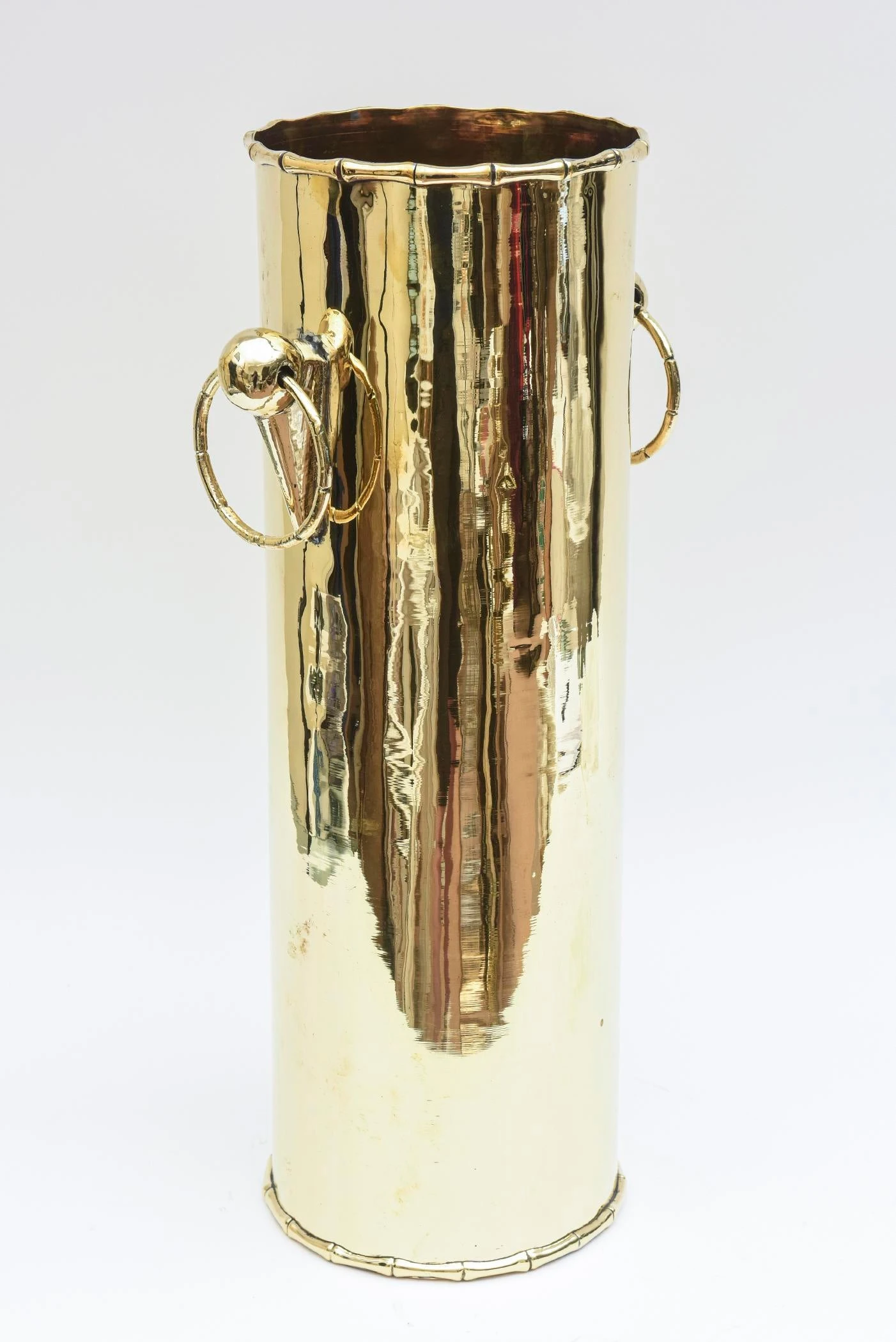 This 1970’s vintage brass column umbrella stand has great presence. There are 2 rings on either side as a doorknocker effect. It has been professionally polished. Great for an entry hallway, in a home or elevator vestibule. The bamboo on the base and top adds interest. The rings are large.