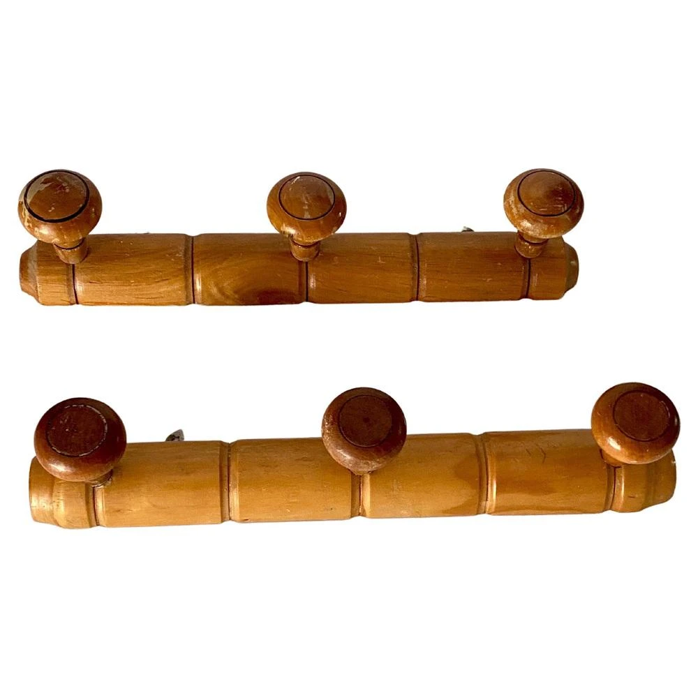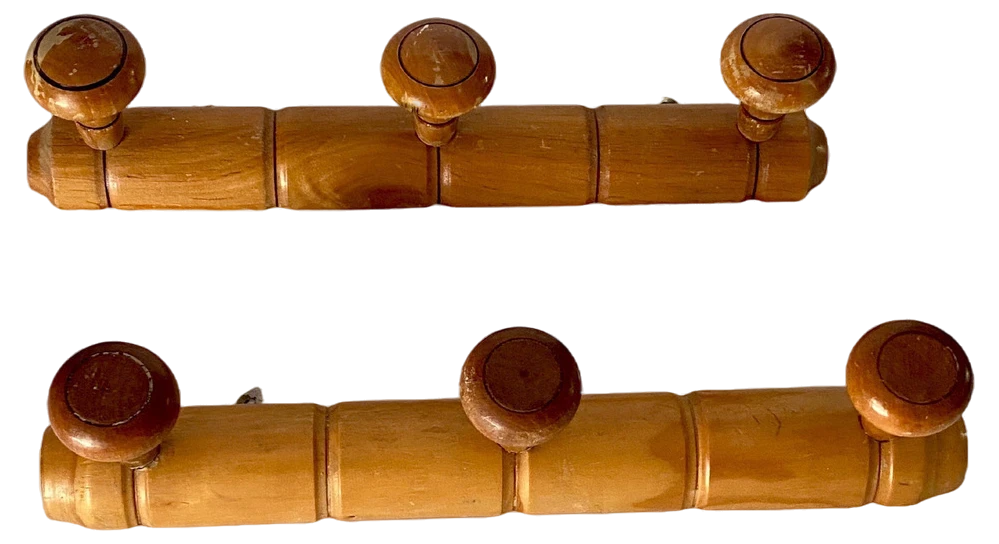 An early 20th century French maple pair of coat or hat rack, carved to mimic bamboo. Perfect for having hats, coats, belts, and scarves, or brooms and dustpans in our utility closet.