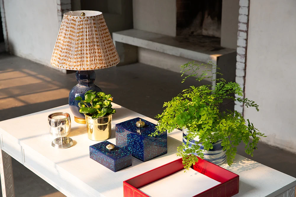 A deep Atlantic blue resin suspends glittering flakes of gold leaf in our new garden box, available in two sizes …