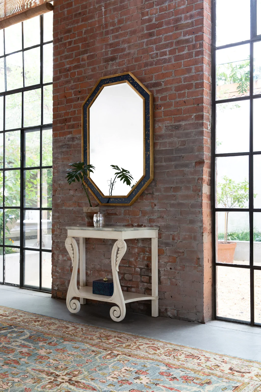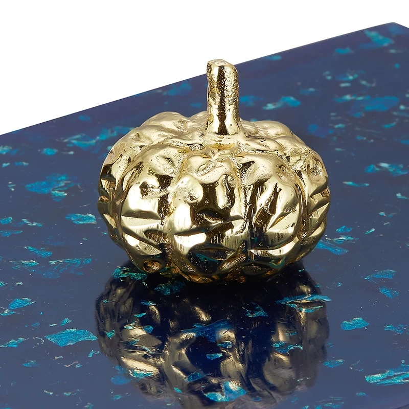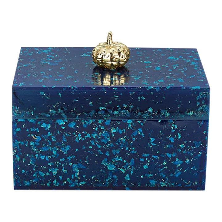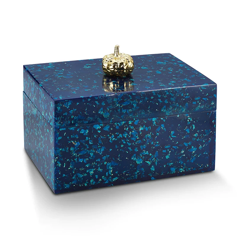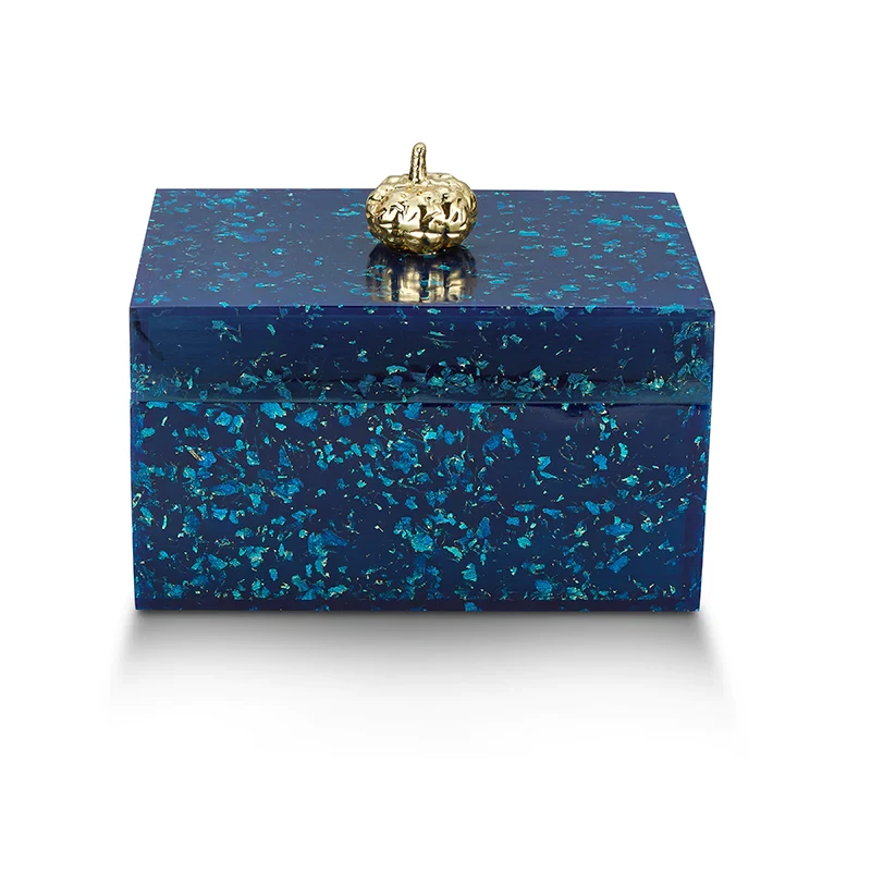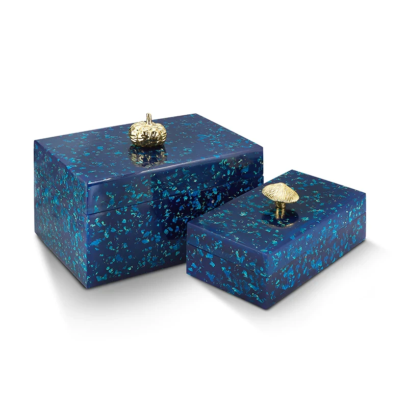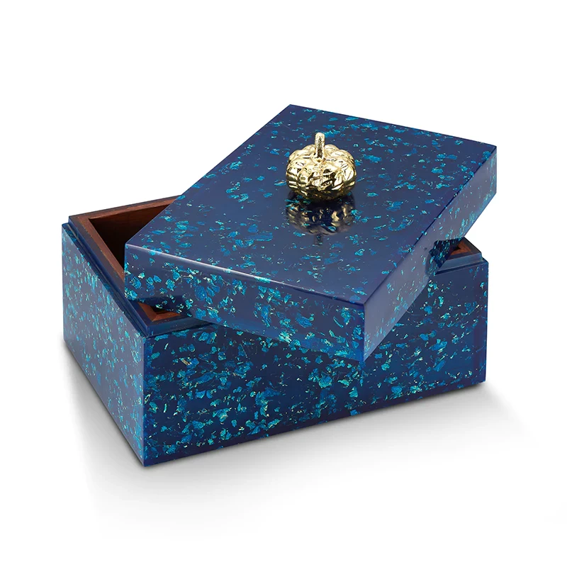 A deep Atlantic blue resin suspends glittering flakes of gold leaf in our new garden box, available in two sizes and with cast pulls in the shape of either gourd or mushroom. Mahogany-color stained wood lines the interior. Ideal to give as a gift or to use oneself as a place to store mementoes (or stick- it pads, paperclips, remotes and other daily clutter).