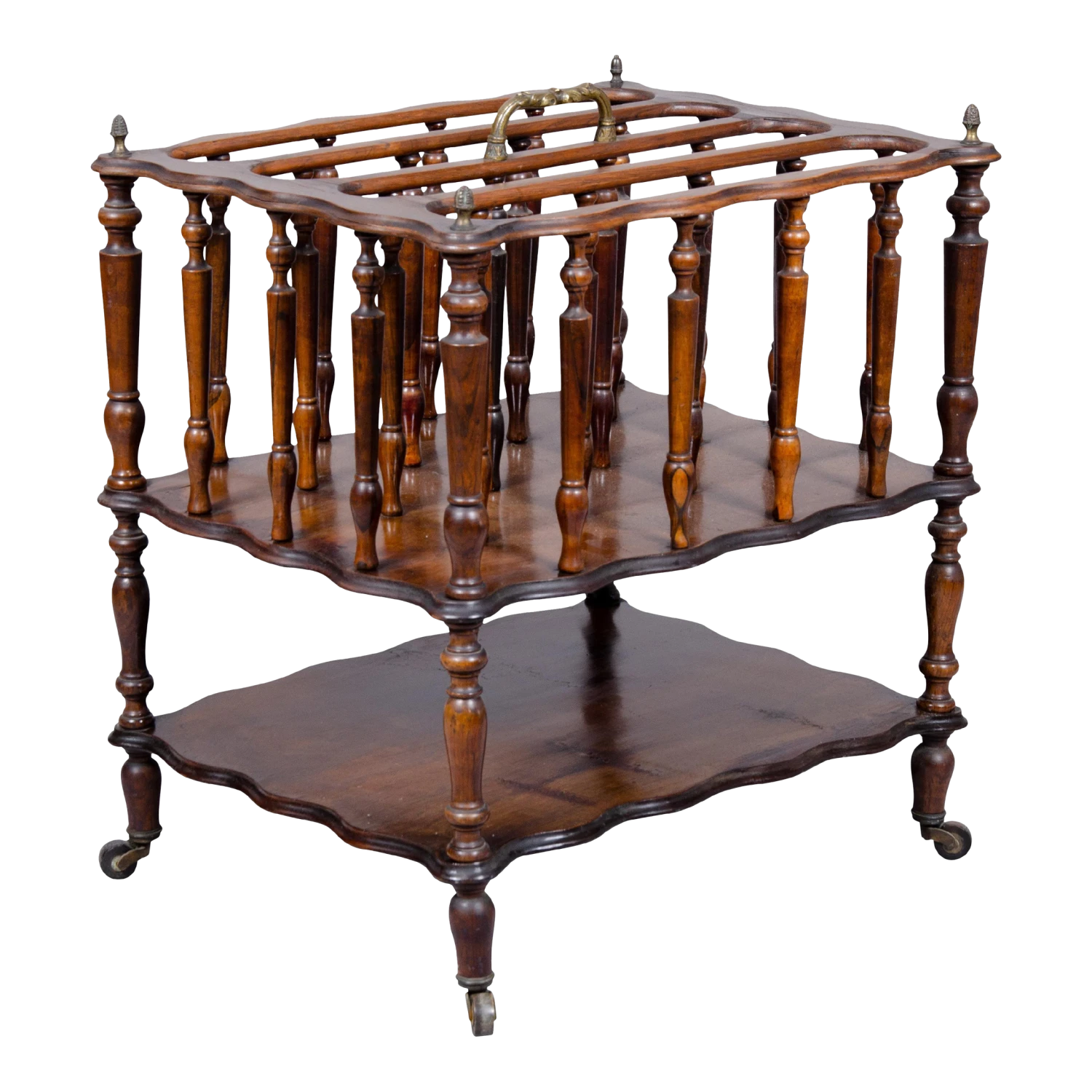 Constructed from solid rosewood. With brass carry handle over dividers with spindles , lower shelf, turned legs and casters. This form was designed by Hepplewhite for the Archbishop of Canterbury form holding sheet music and folios. Today its useful for magazines.