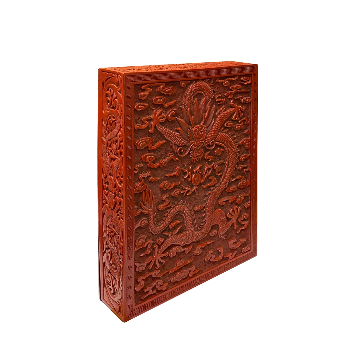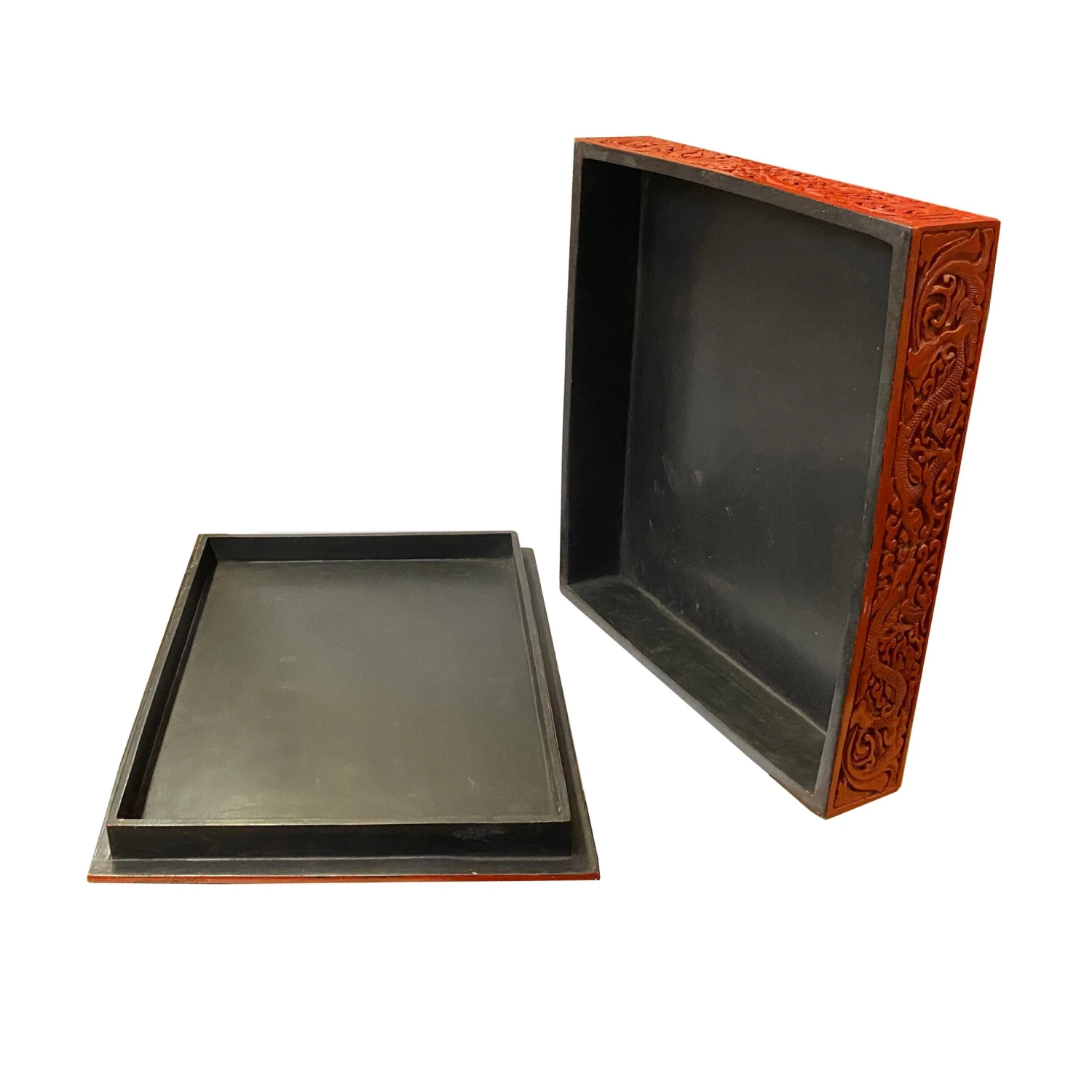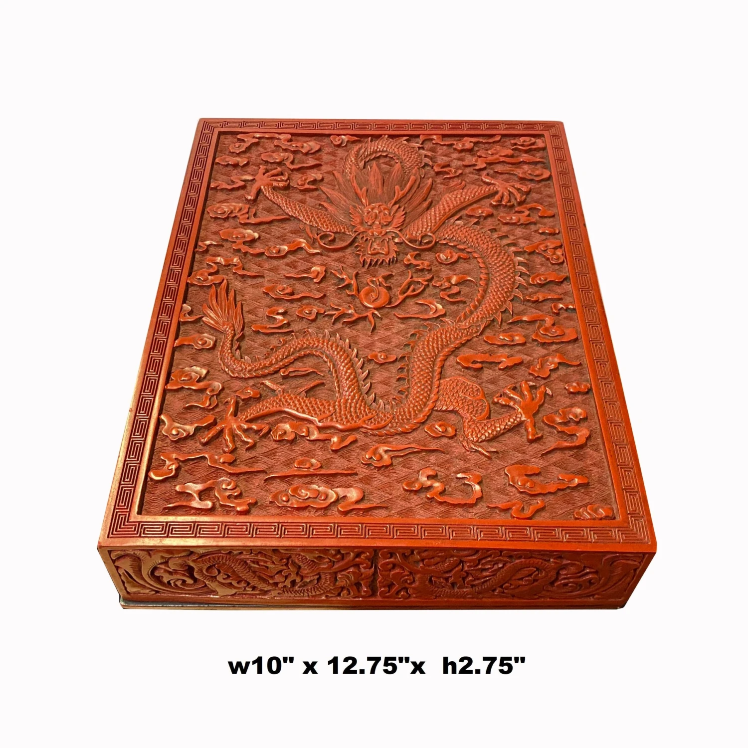 This is a handmade Chinese accent decorative box made of resin lacquer mixed material. The surface is carved with a relief pattern of oriental flowers and dragon pattern. ( not for food storage or serving)