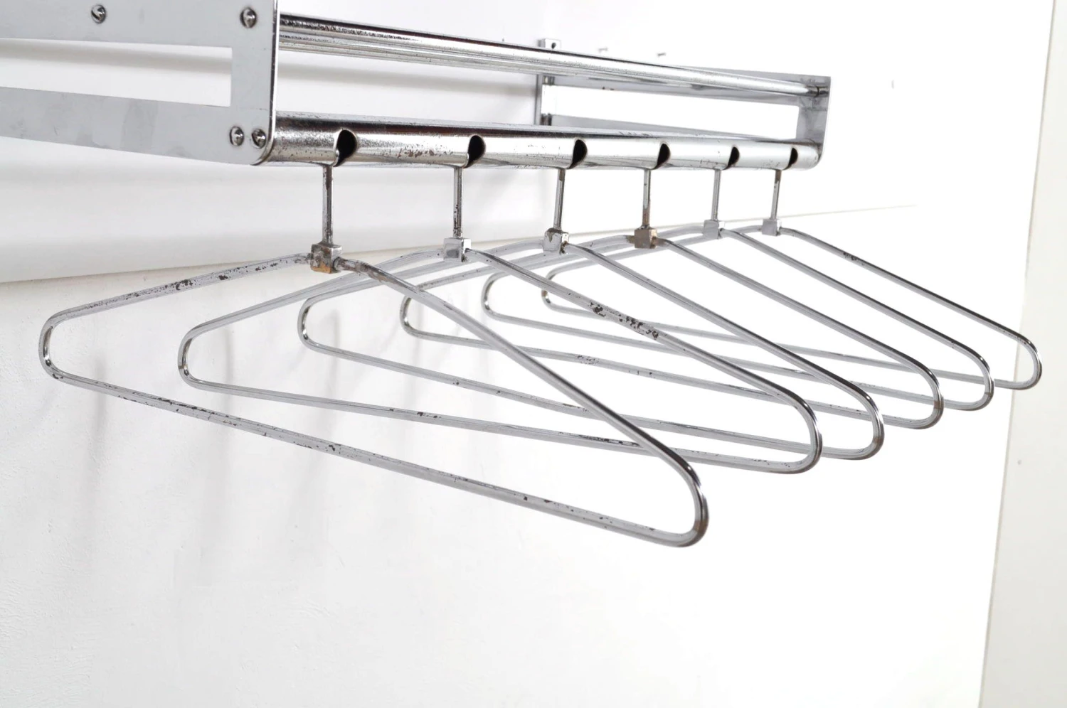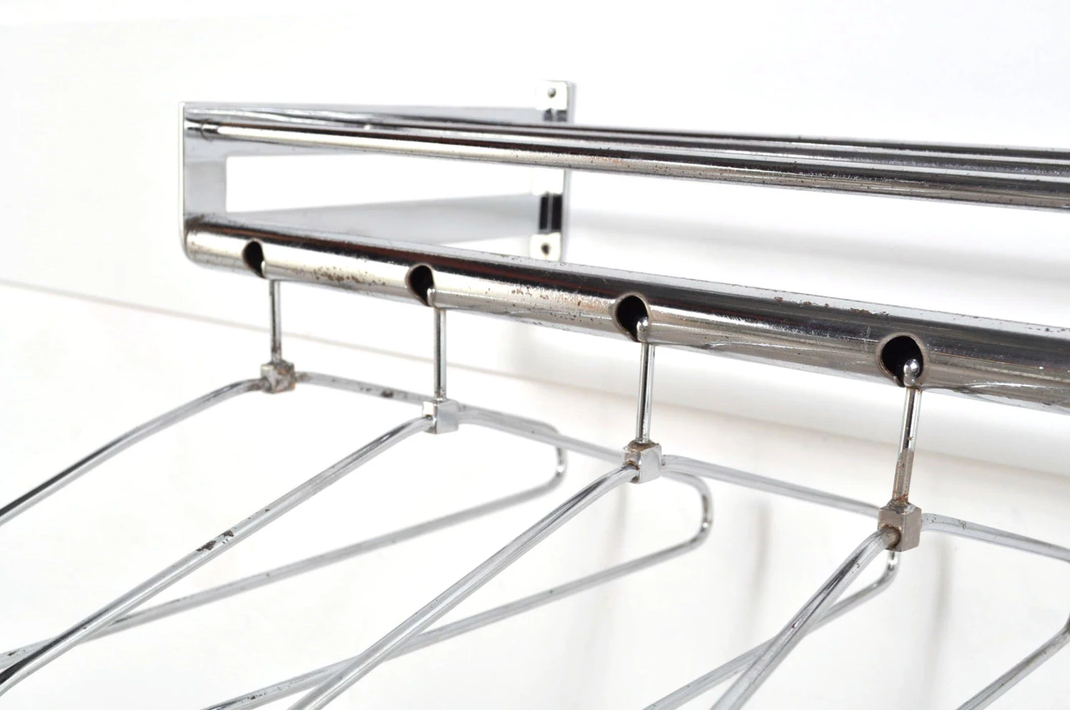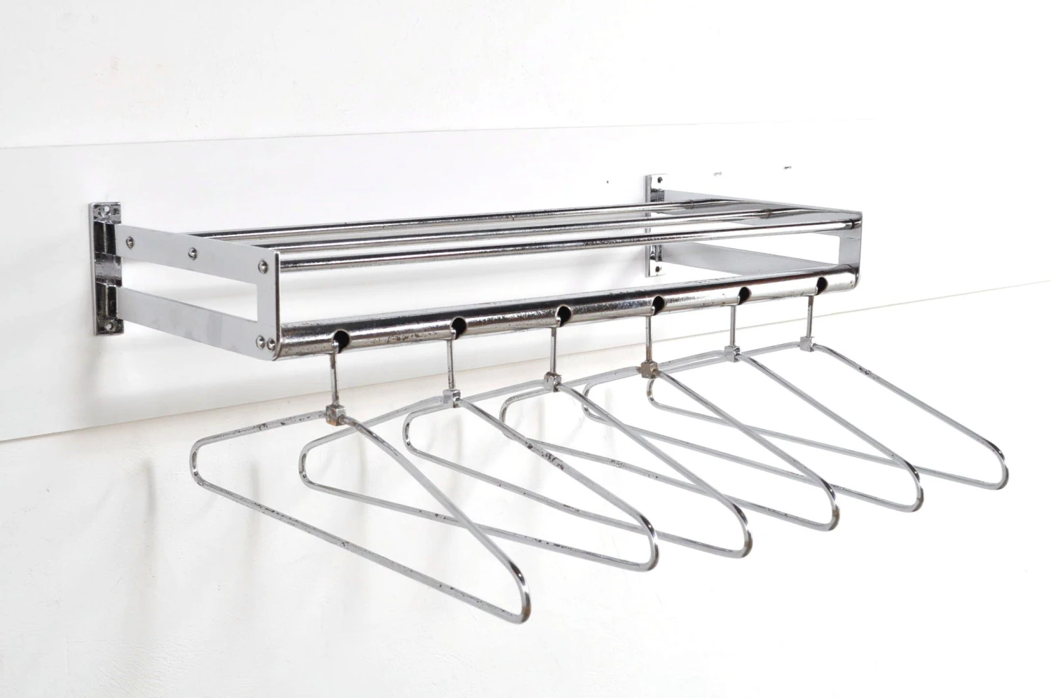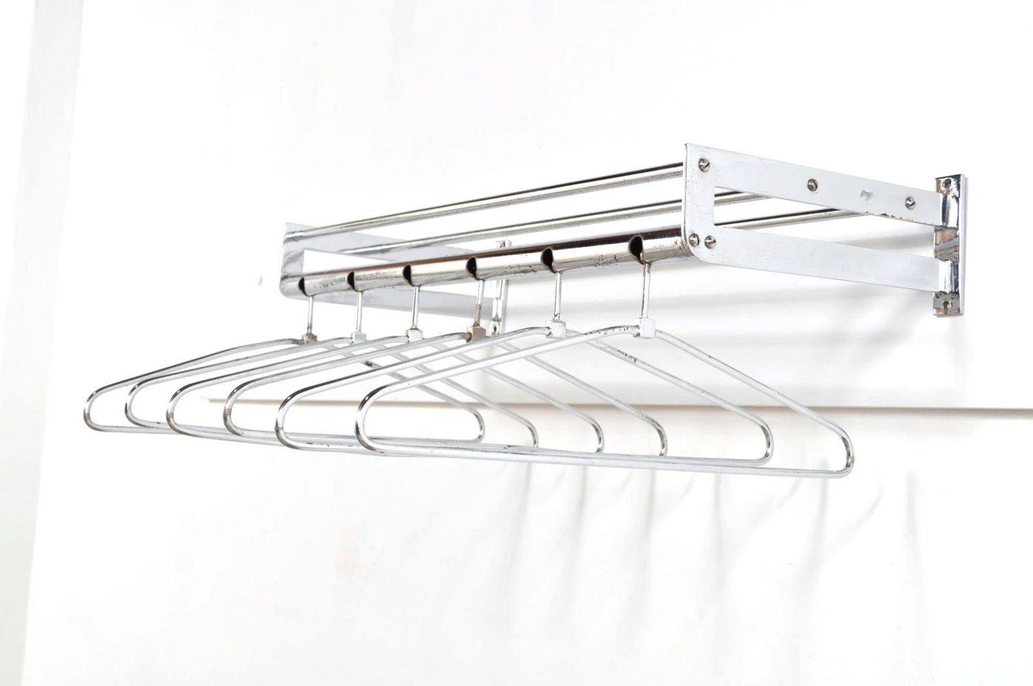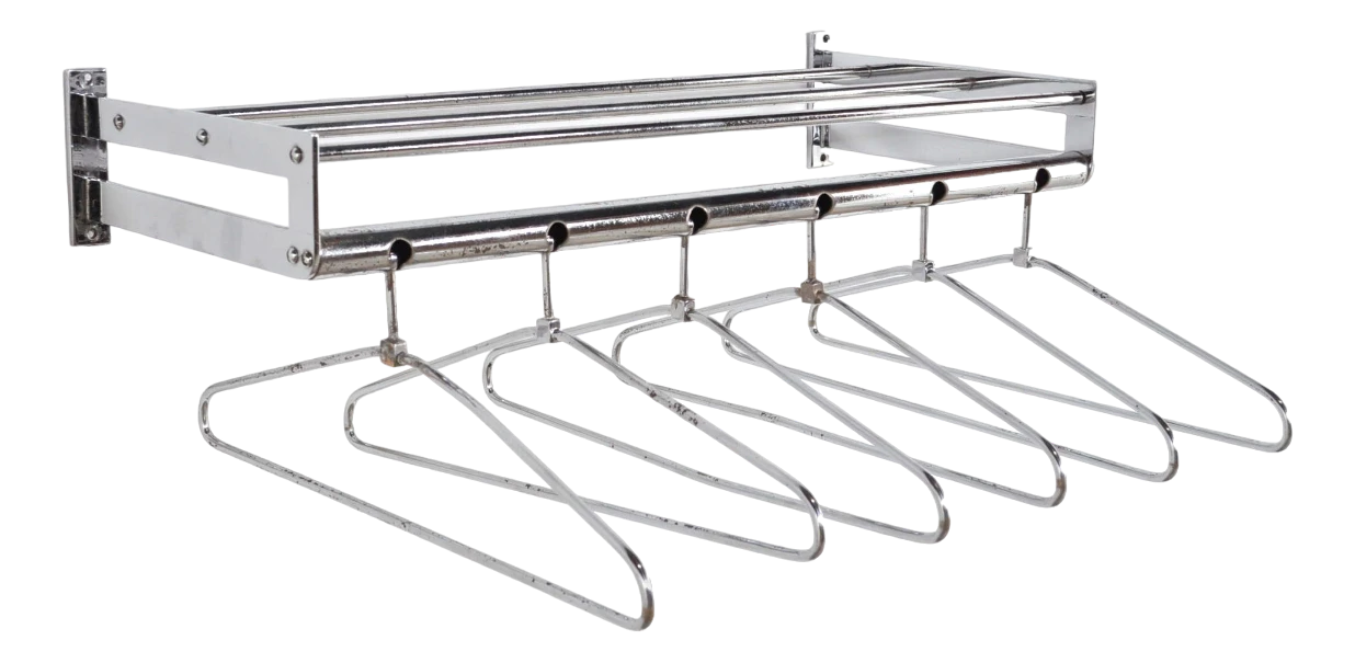 Stylish chrome coat rack with six removable clothes hangers and hat rack.